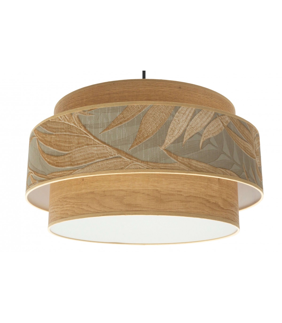 Lámpara de techo realizada en metal negro y textil. Su pantalla se compone de dos cuerpos ribeteados, con un bonito estampado decogarden en su pantalla superior, combinando el efecto madera con plantas, resultando una composición muy vistosa y original. De estilo moderno, pero con líneas sencillas, idóneo para ambientes decorados con los nuevos estilos de decoración en los que se mezclan elementos naturales con plantas, conectando con la naturaleza y añadiendo a la estancia que iluminan frescura y vitalidad. Muy combinable con estilos Boho e Industriales modernos pero dando un toque de elegancia a dormitorios, entradas, pasillos, comedores y zonas de trabajo.