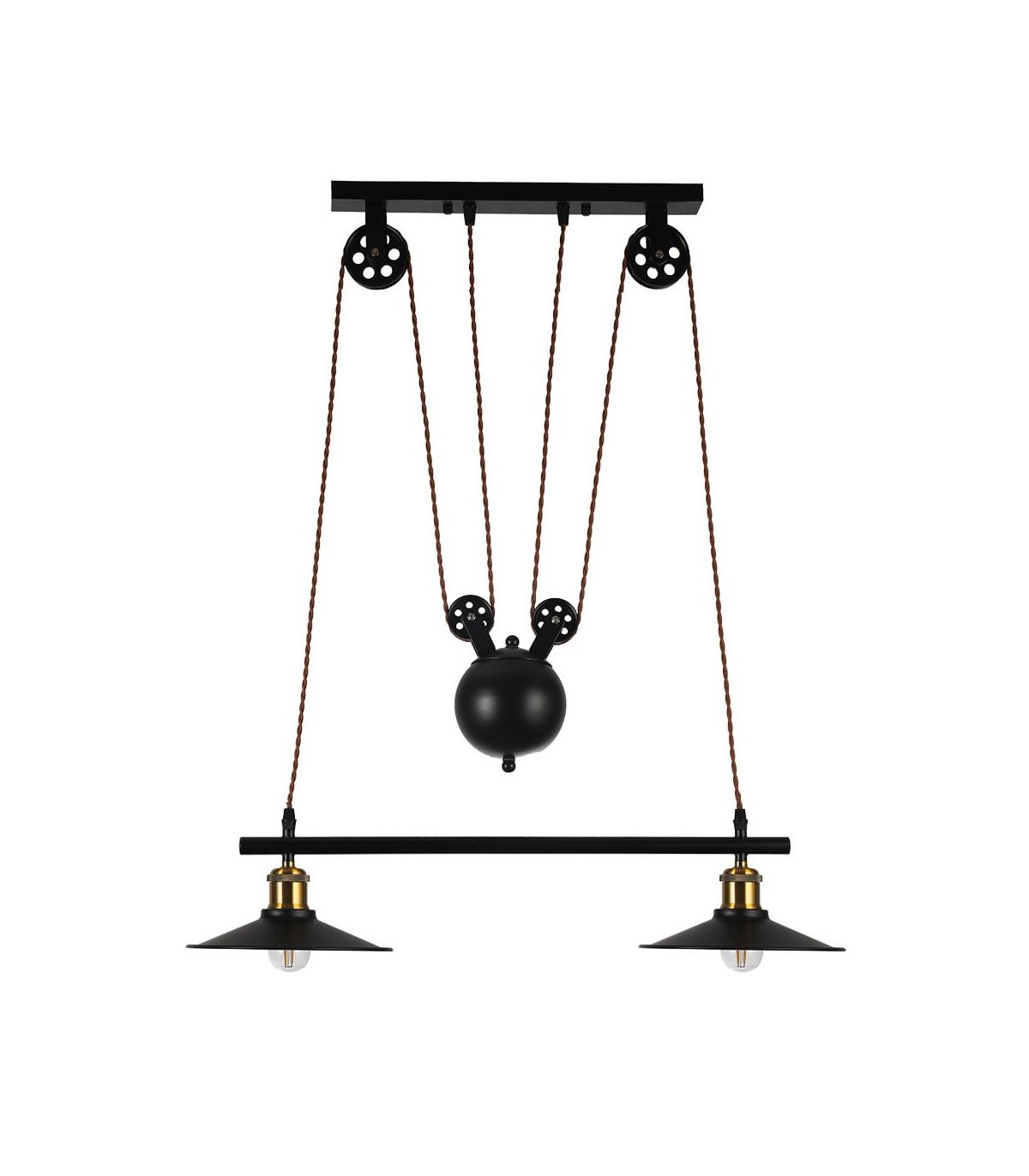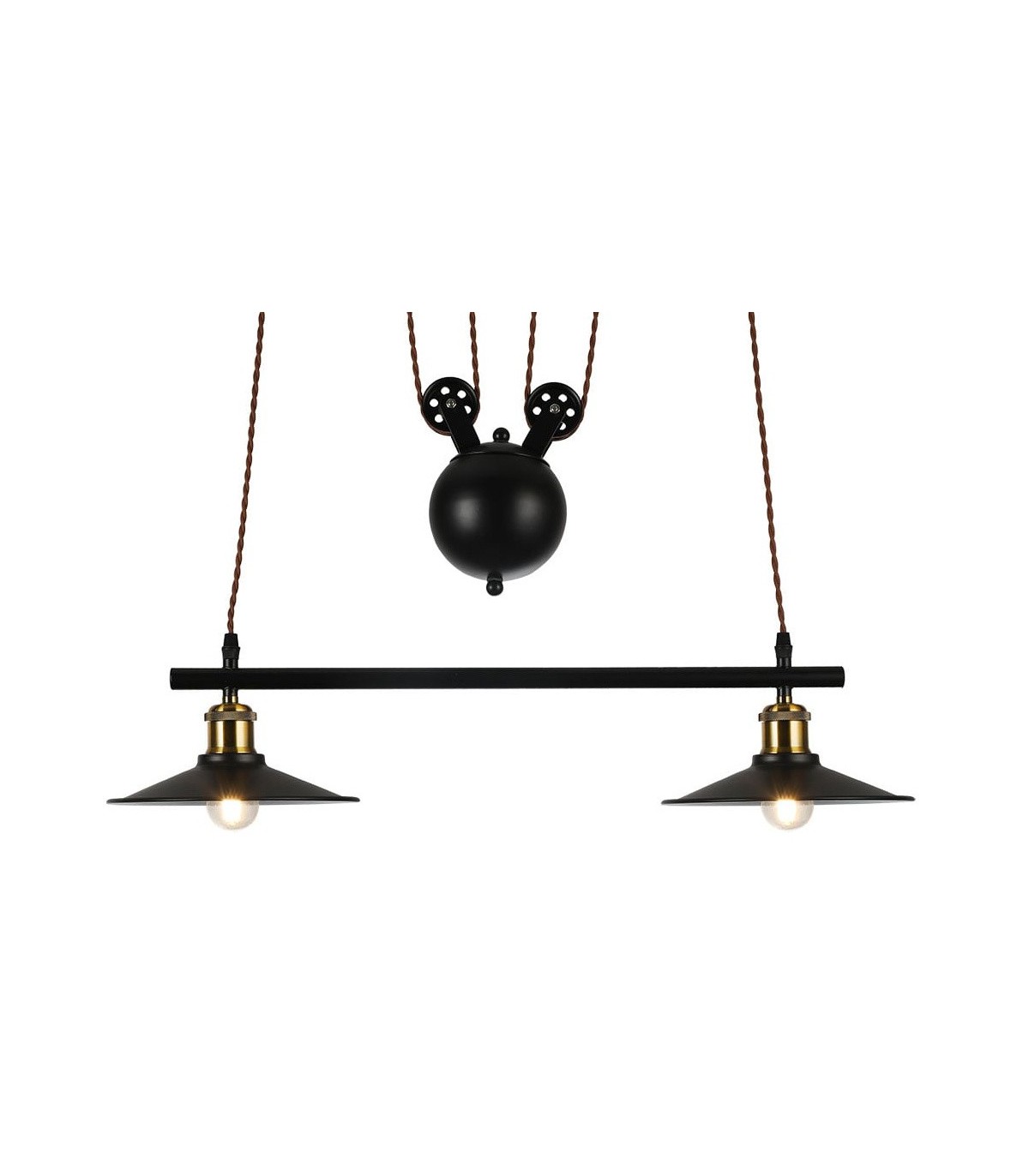 Lámpara de color negro con detalle en dorado de dos luces. Realizado en metal con un curioso sistema de altura regulable en forma de polea.