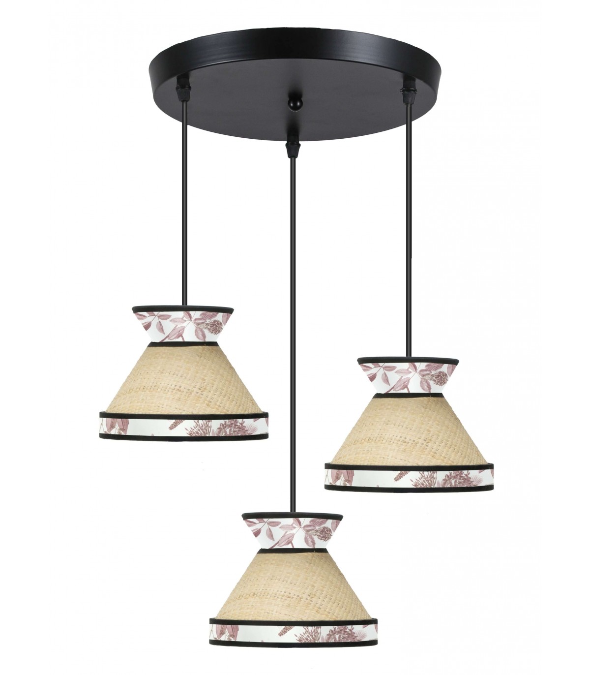 Una lámpara colgante que fusiona estilo oriental chic con materiales naturales y delicadeza artesanal. Compuesta por tres pantallas en forma de campana elaboradas en ratán natural trenzado, realzadas con un elegante remate en tela estampada floral en tonos blanco y granate.