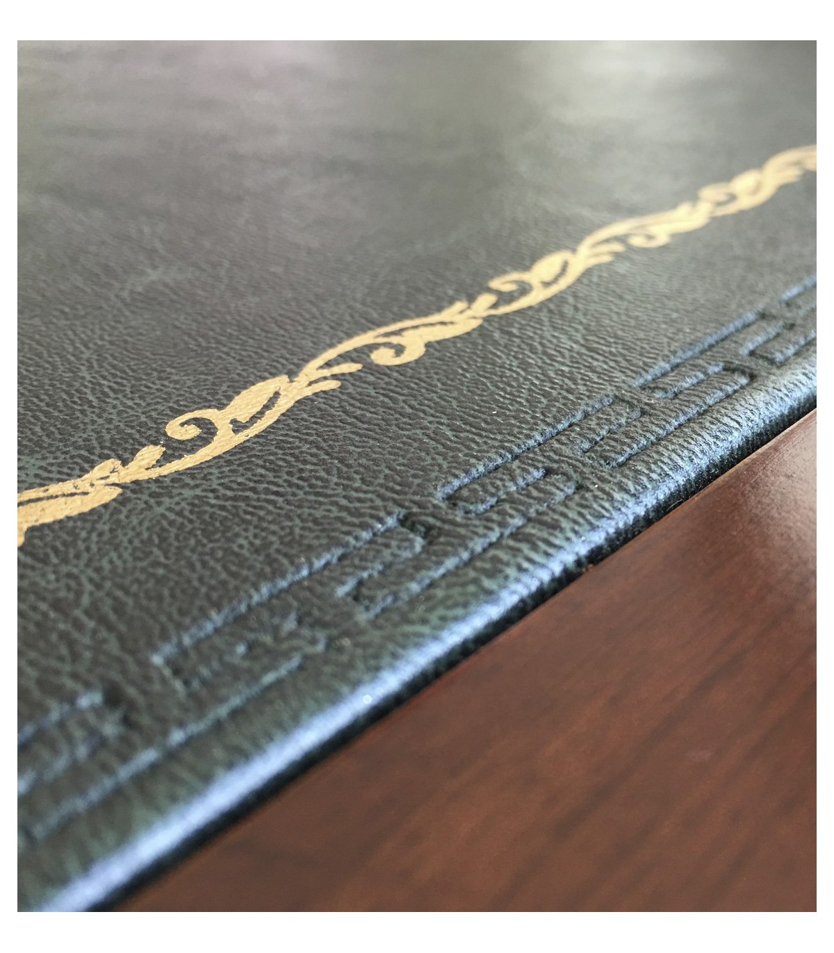 • Acabado, caoba natural, polipiel verde ruleteada en oro.
