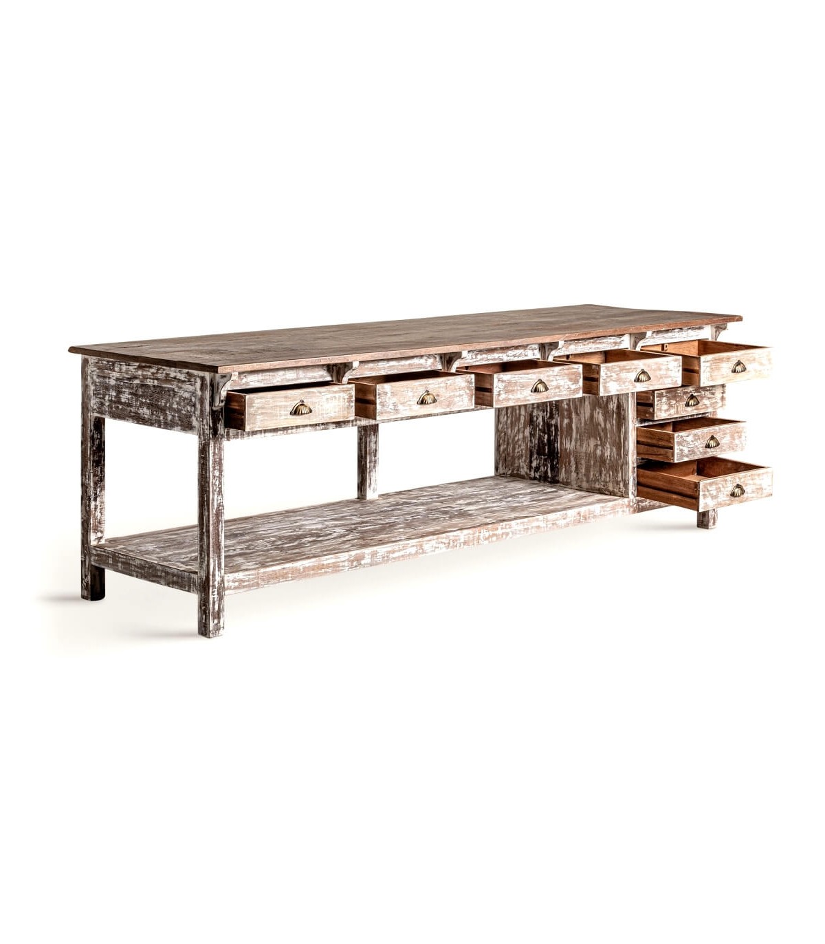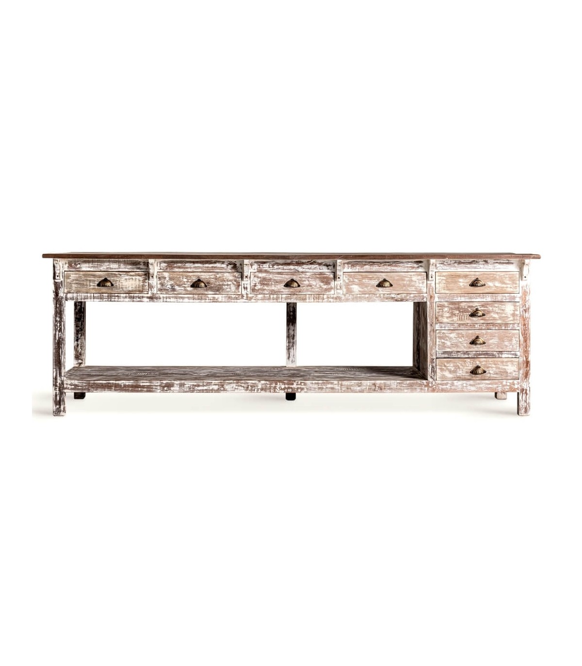 • Acabado, cuerpo madera acabado blanco rozado, tapa caoba, tiradores en bronce. Fabricación artesanal. Entendemos las variaciones de tonalidad o ciertas imperfecciones (grietas, nudos, marcas) como un valor añadido que la convierten en pieza única.