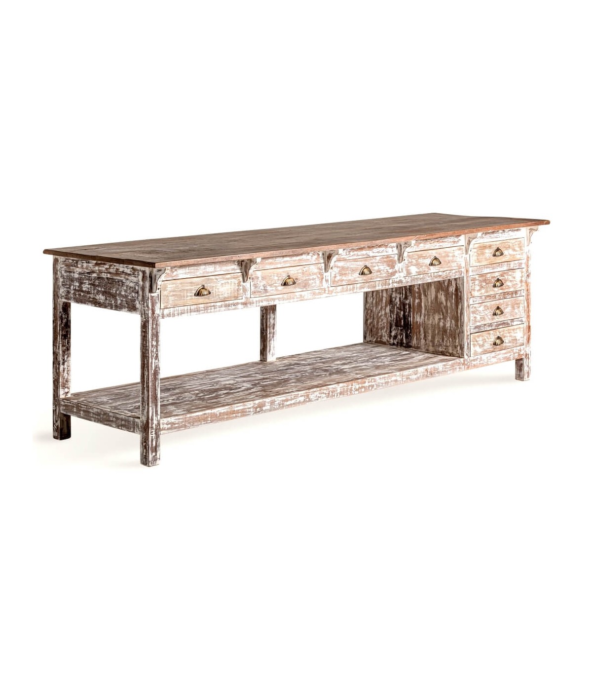 Mesa escritorio muy grande, estilo colonial, realizada en caobilla acabado blanco rozado con la tapa en color caoba y unos bonitos tiradores en bronce, una mesa espectacular que puede utilizarse de mostrador para un gran comercio.