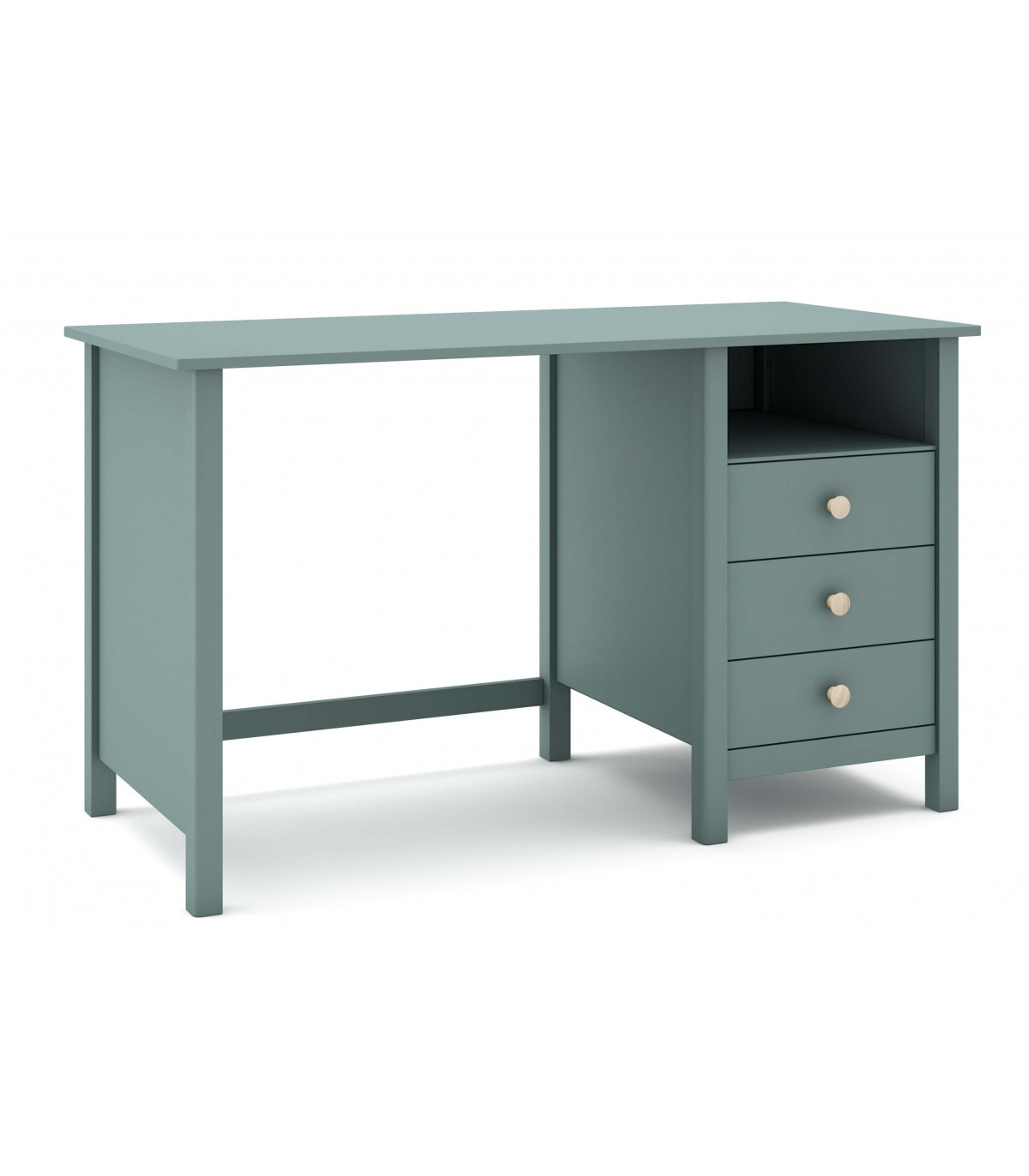 Mesa de escritorio con 3 cajones realizado en madera de pino lacado en verde con los tiradores en madera natural, un mueble perfecto para una zona de trabajo o como tocador, un pieza muy versátil.