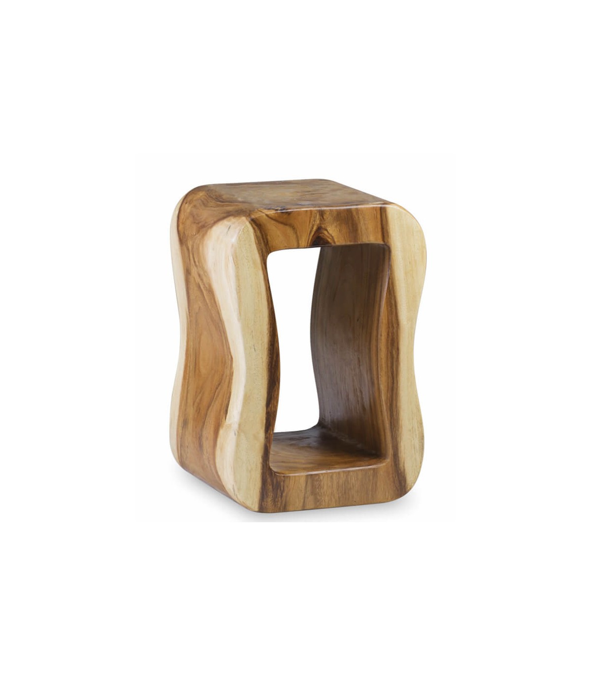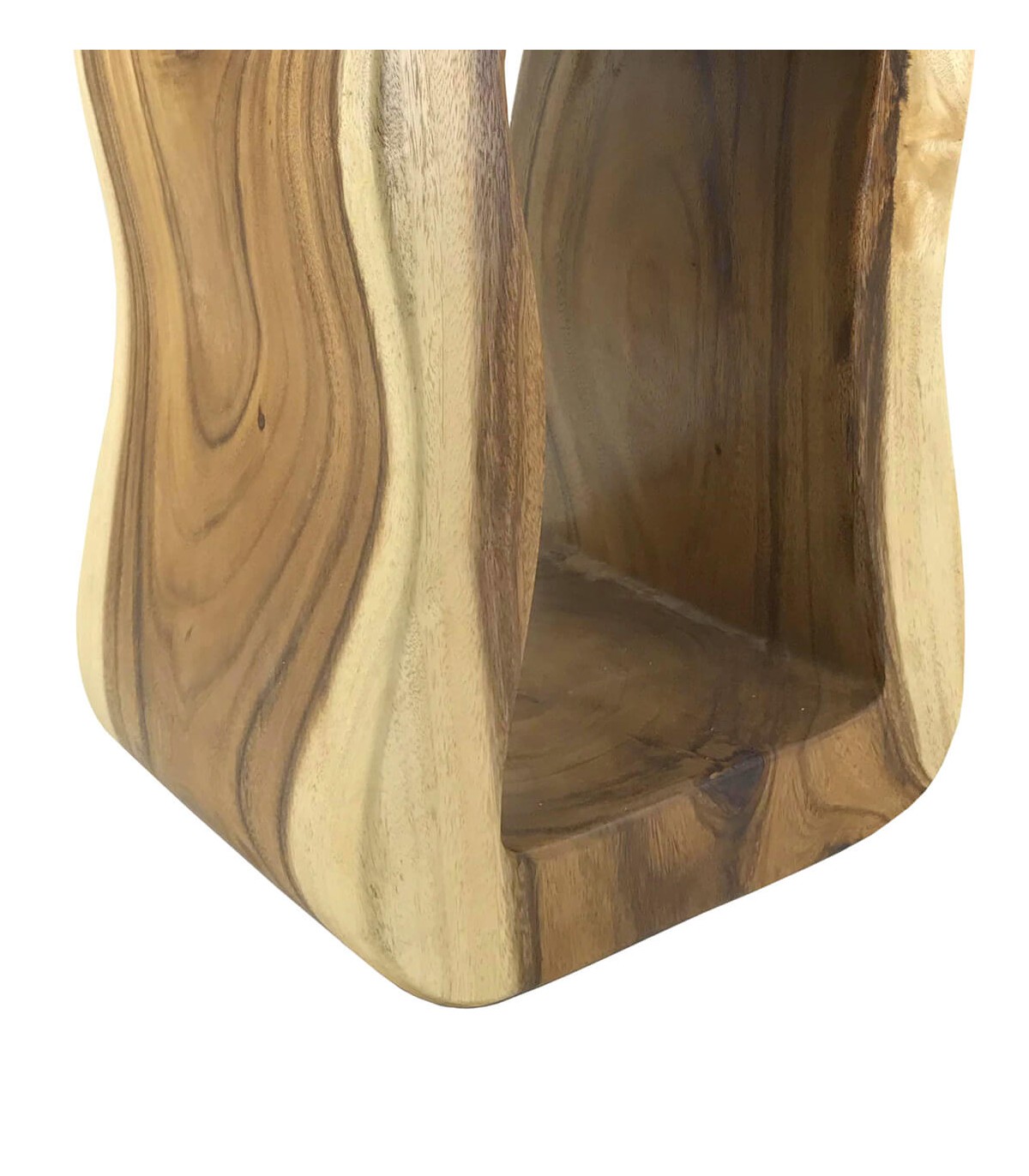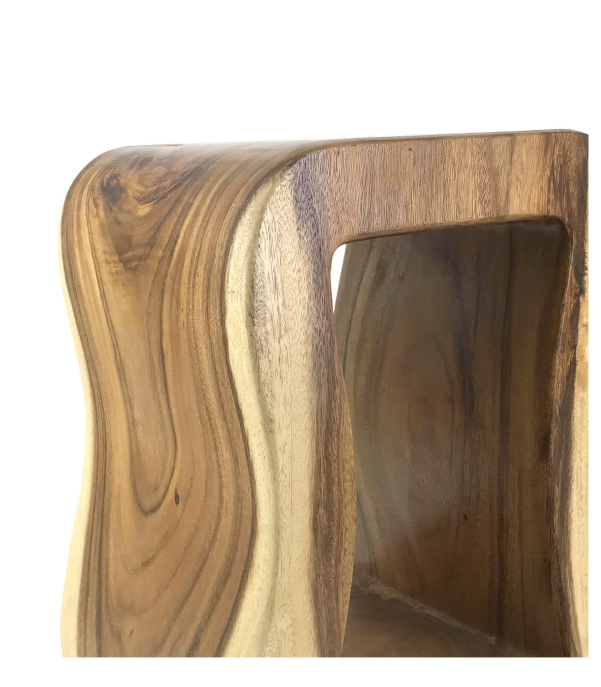 Añade un toque de carácter y autenticidad a tu hogar con esta original mesa auxiliar de madera maciza de suar. Su diseño de líneas orgánicas y forma escultórica la convierte en una pieza funcional y decorativa a la vez, perfecta como mesita de noche, soporte para plantas o complemento para tu salón.