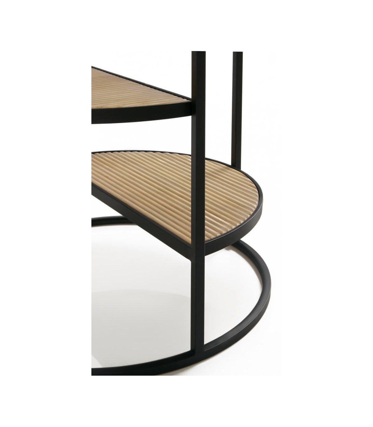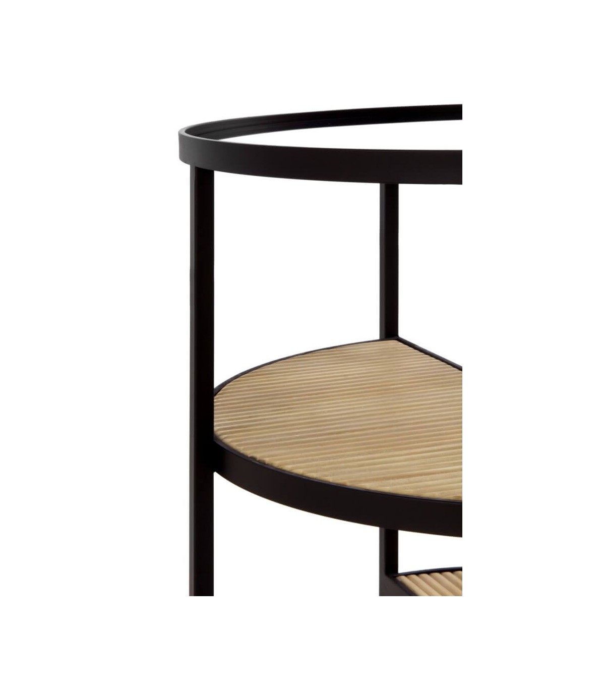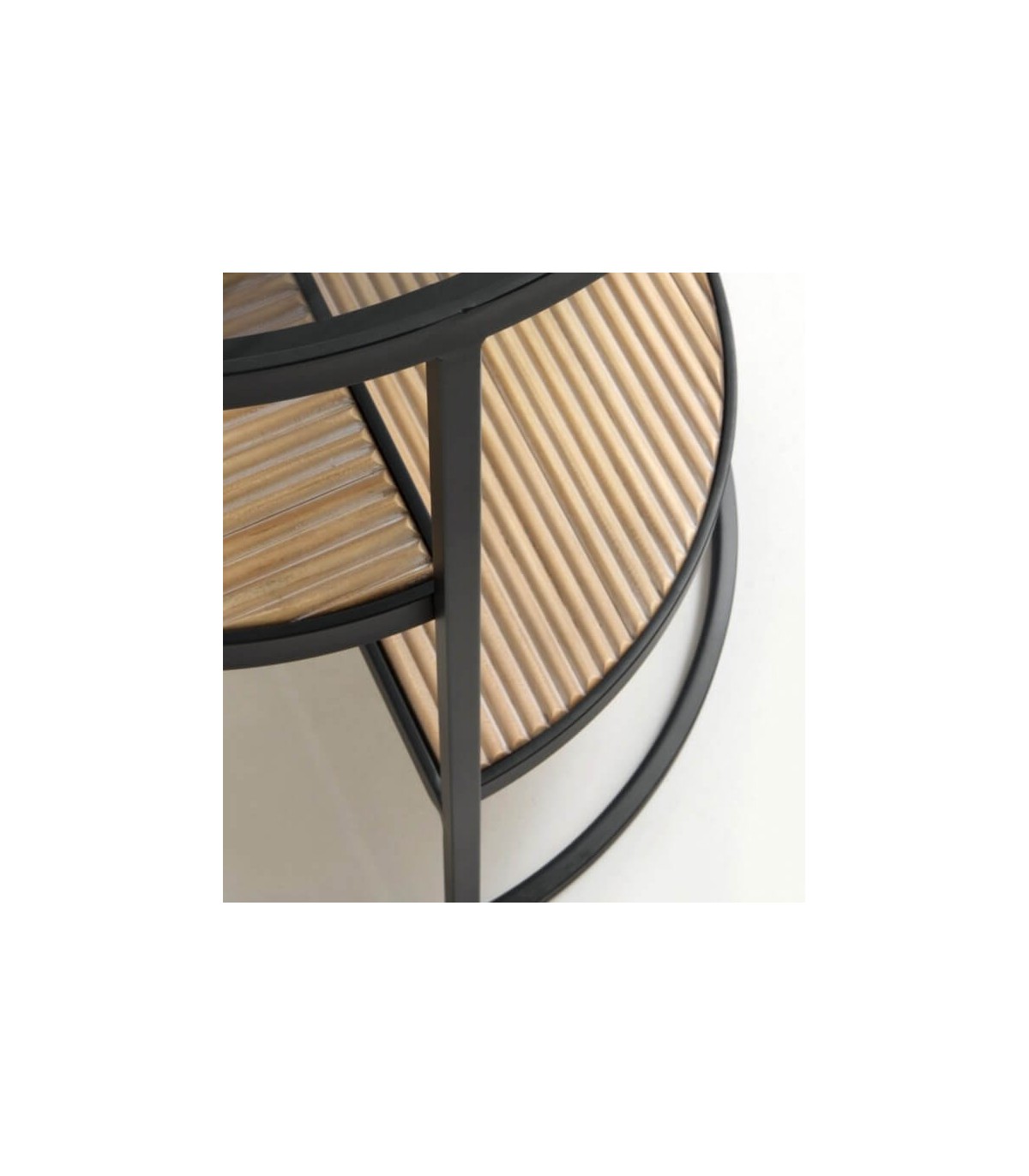 - Acabado, madera natural acanalada, metal negro, cristal transparente.