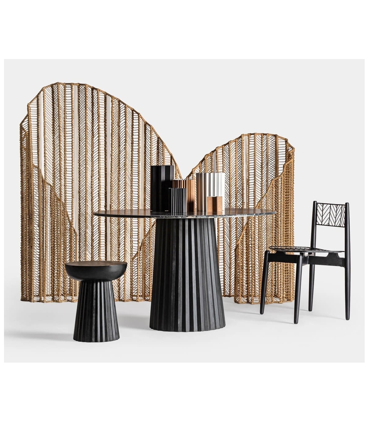 Mesita auxiliar de nuestra colección Ulie, realizada de manera artesanal, combinando varios materiales, la madera de mango, el ratán o el mármol, una colección inspirada en los tejidos plisé, a caballo entre el estilo art decó y el estilo colonial, una colección muy elegante en todos sus acabados.