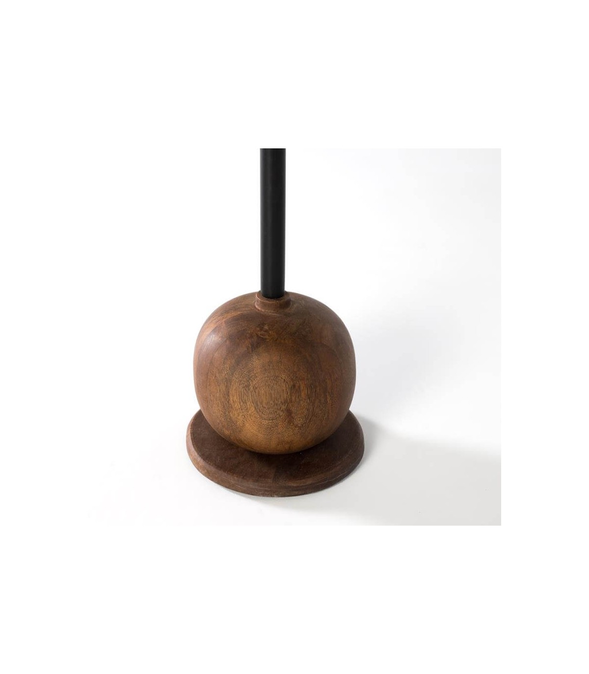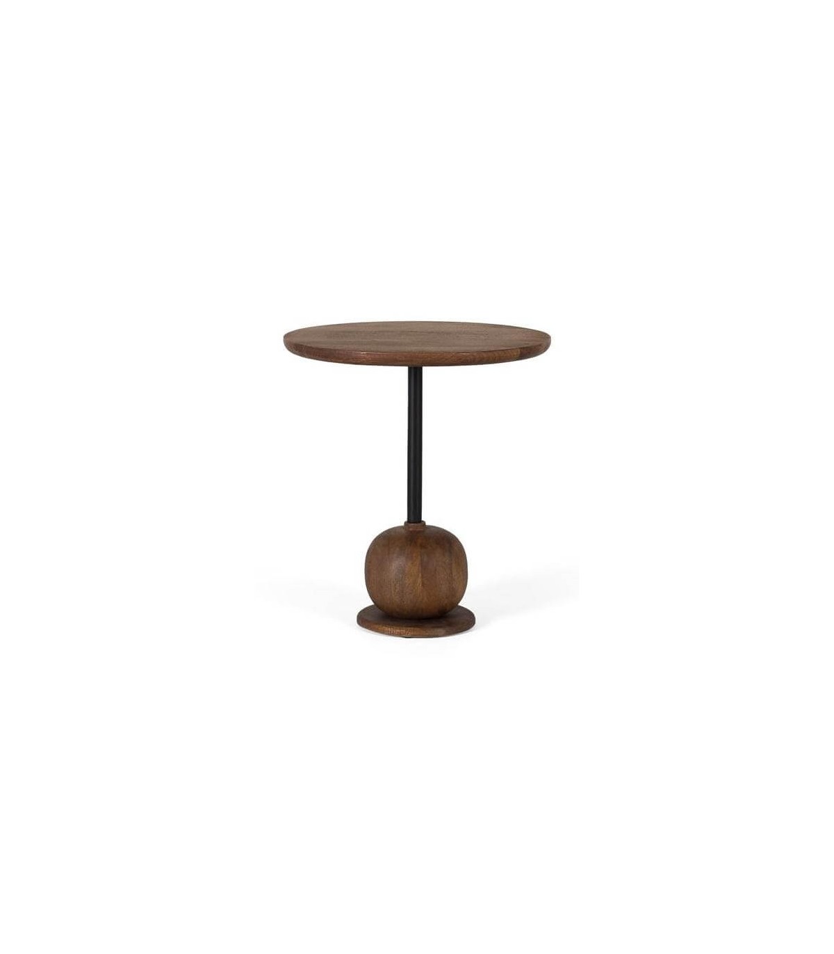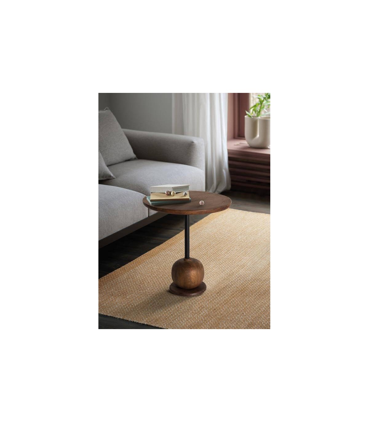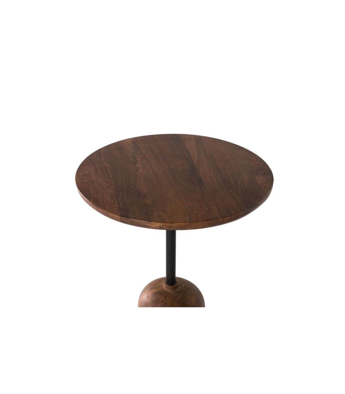 Mesita auxiliar pequeña realizada artesanalmente en madera de mango teñida en color nogal y metal negro, Una mesa auxiliar redonda que irradia calidez y elegancia en cualquier espacio. Su diseño compacto y su belleza natural la convierten en el complemento perfecto para cualquier rincón de tu hogar.