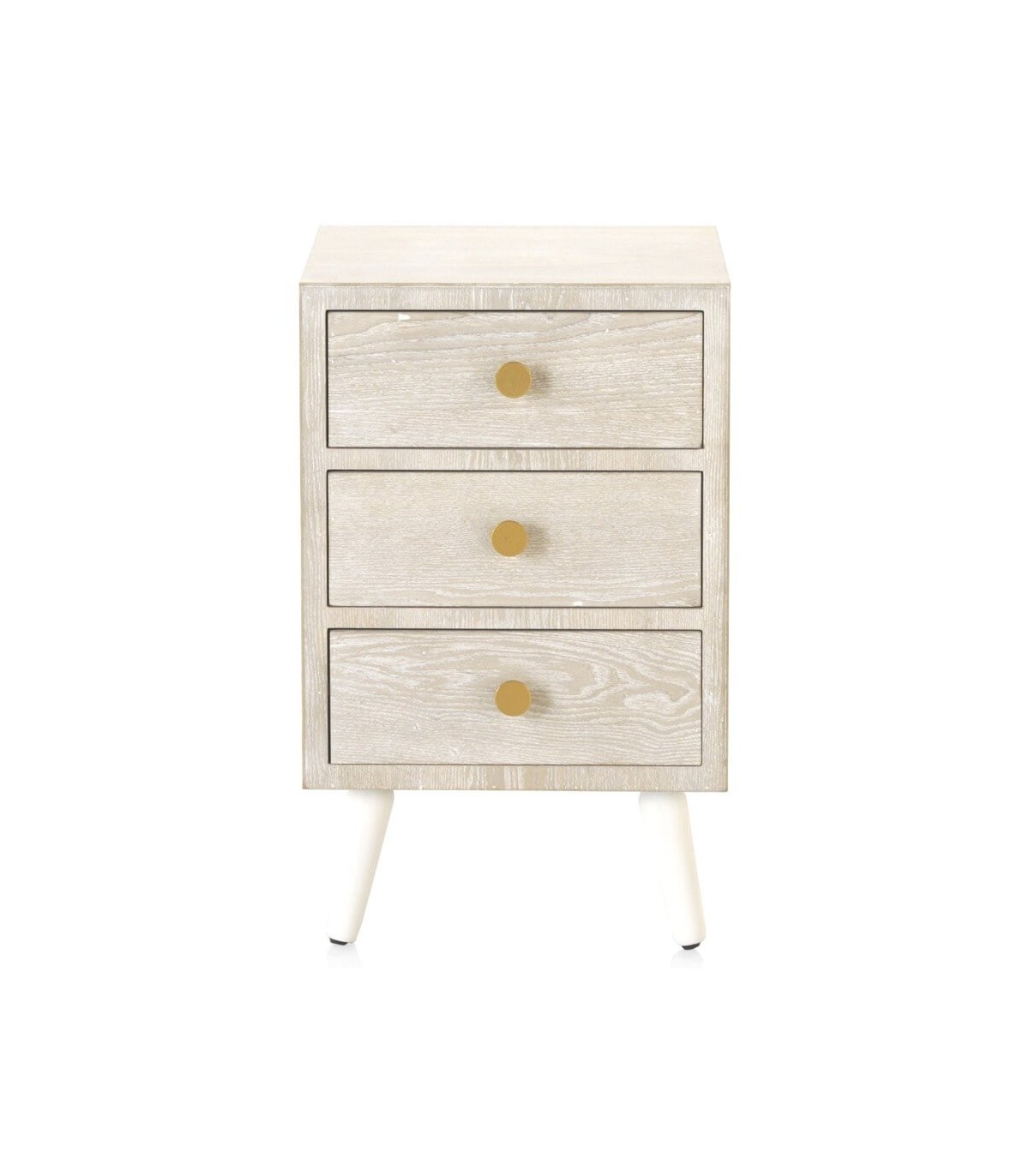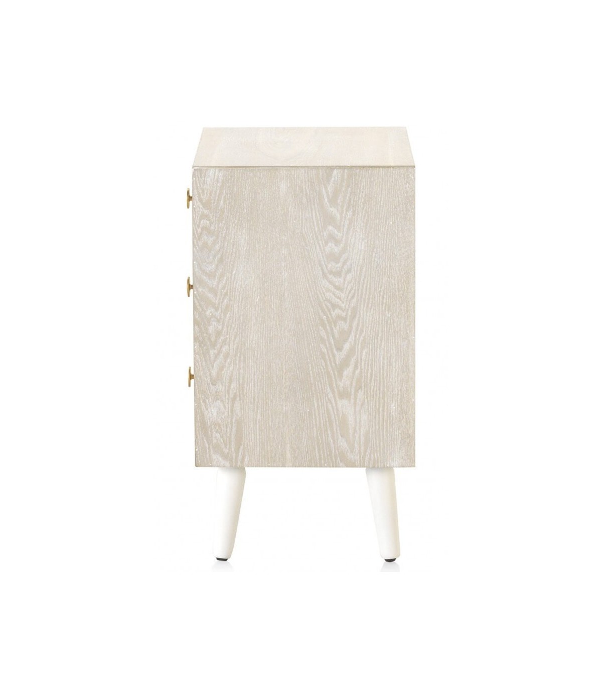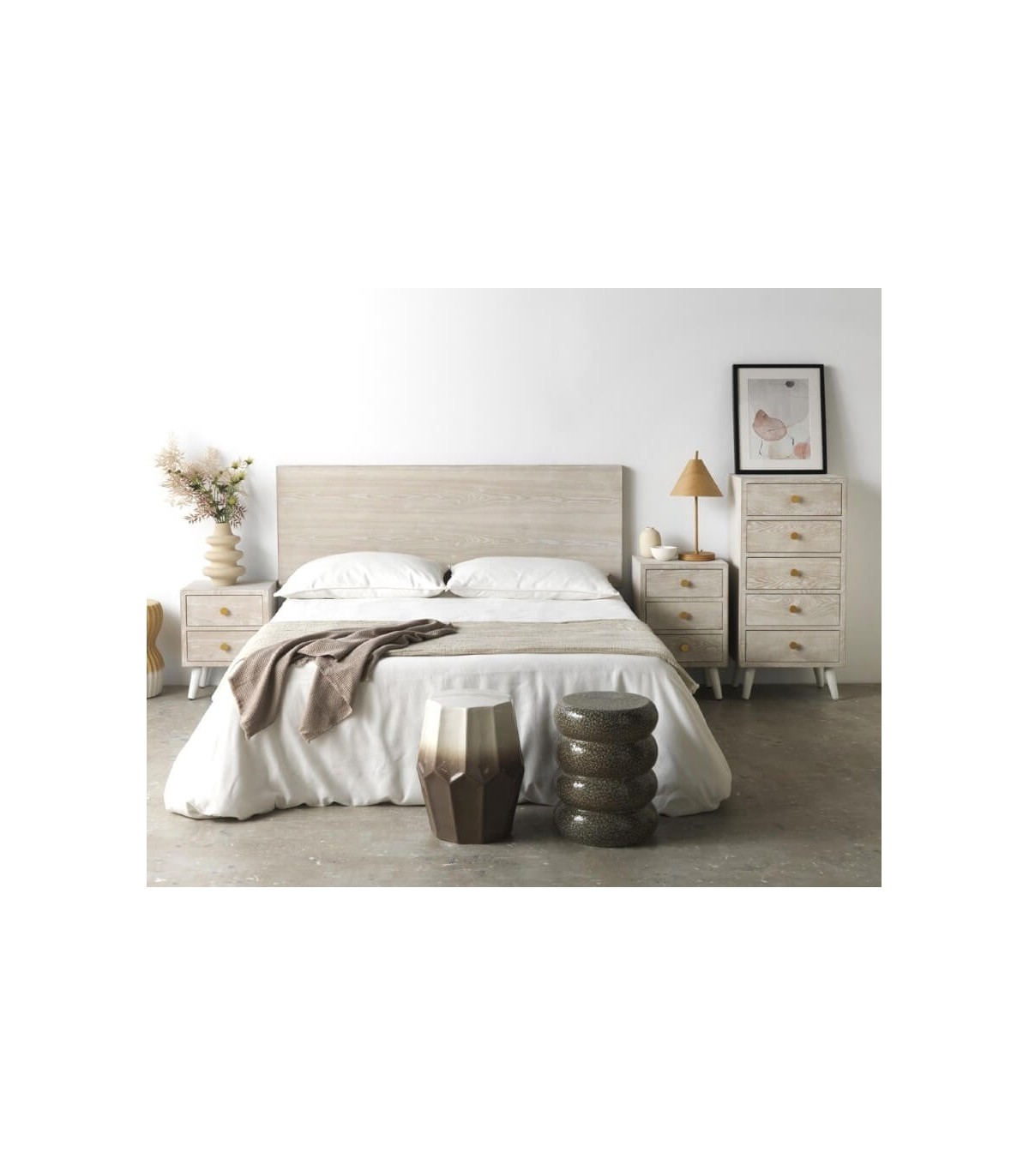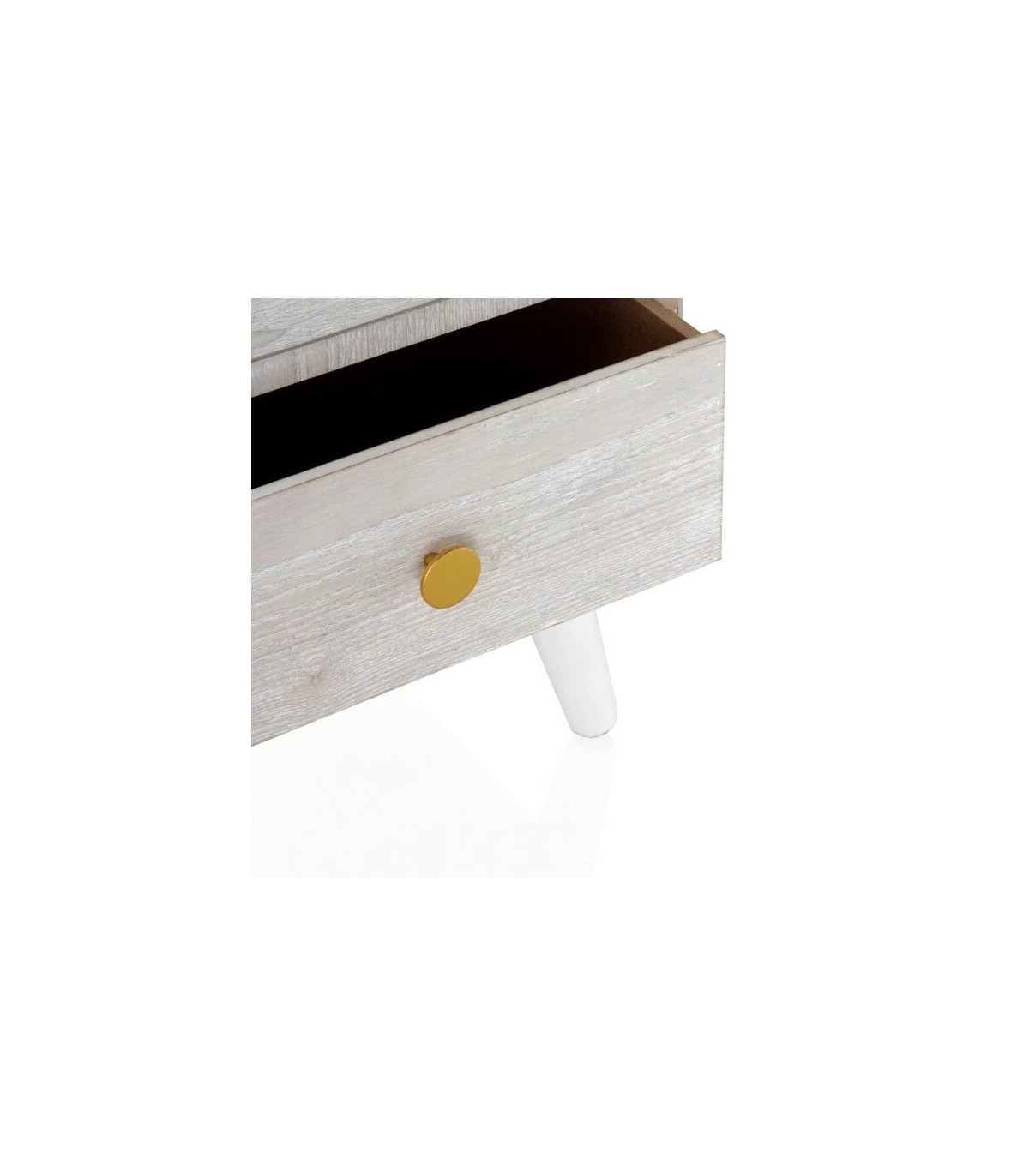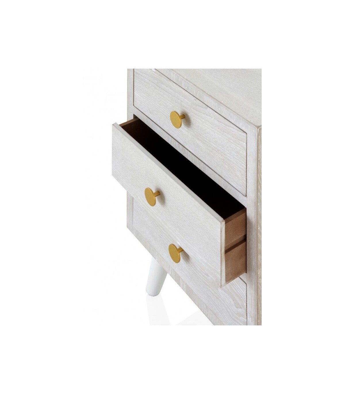 Mesita de noche de nuestro dormitorio Hoppe, un dormitorio con un acabado suave pero con personalidad, la madera de fresno patinada en blanco contrasta perfectamente con el tirador en oro dándole un aire arte decó. Tres medidas de cabeceros, 2 modelos de mesitas de noche, cómoda y sinfonier para crear la composición que tu dormitorio necesite.