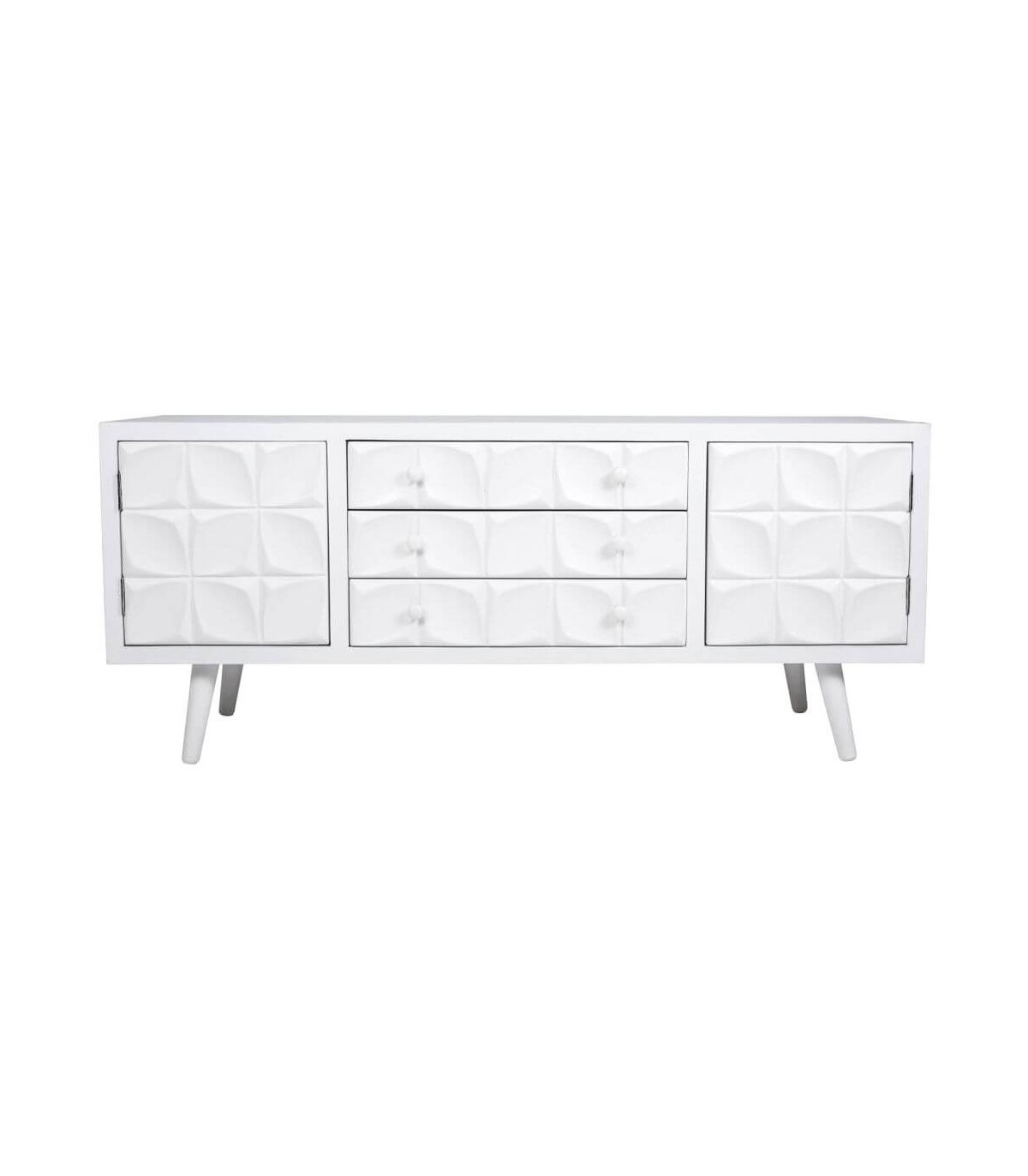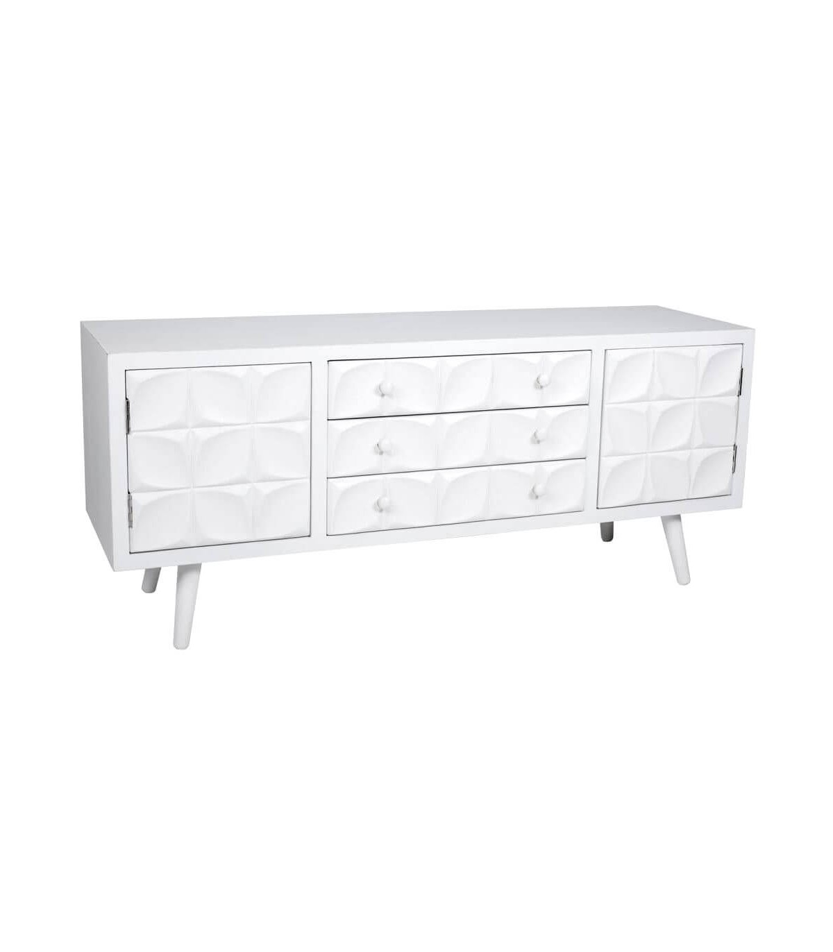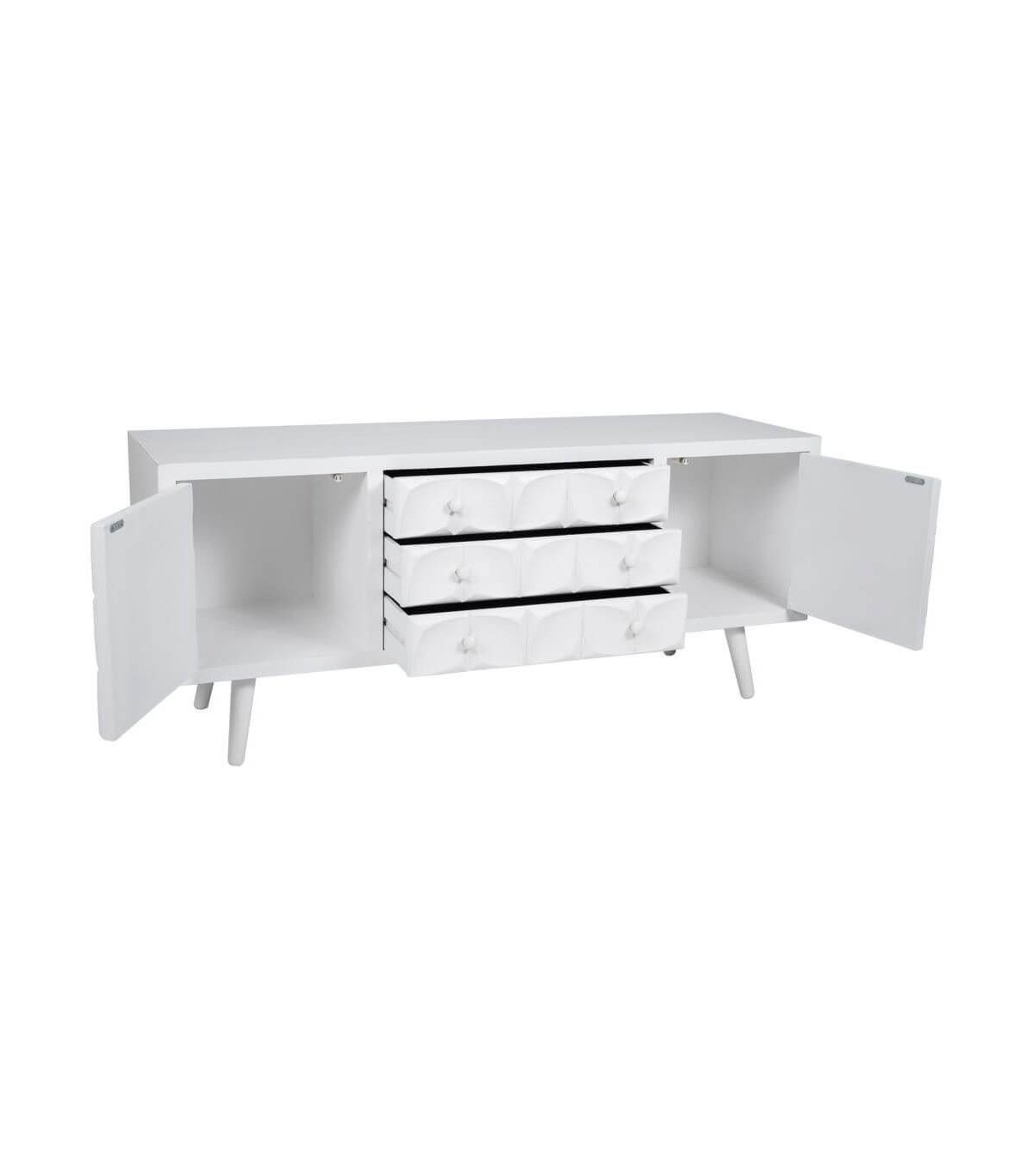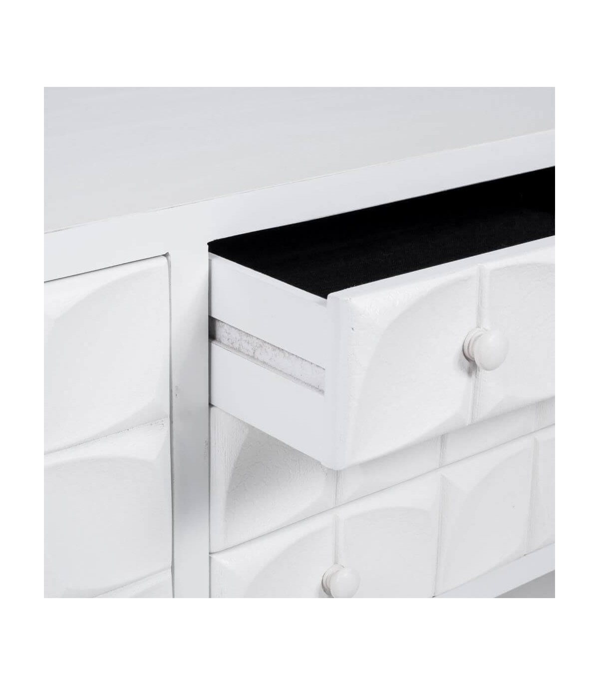• Acabado, madera en blanco y diseño en puertas y cajones.