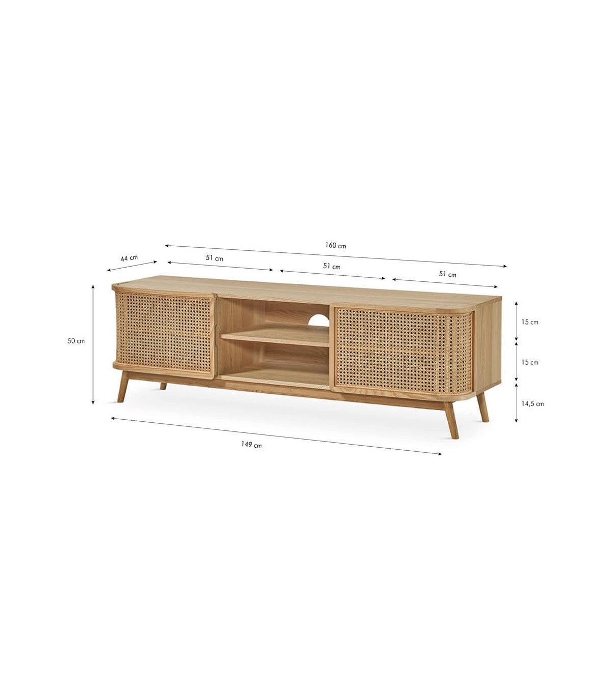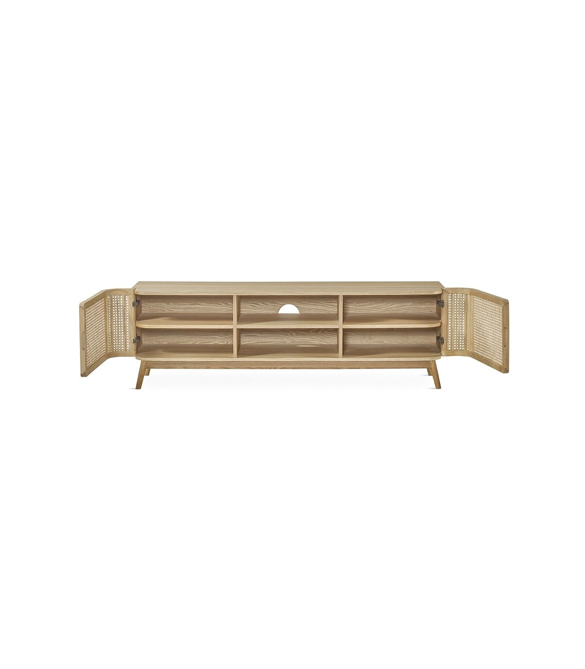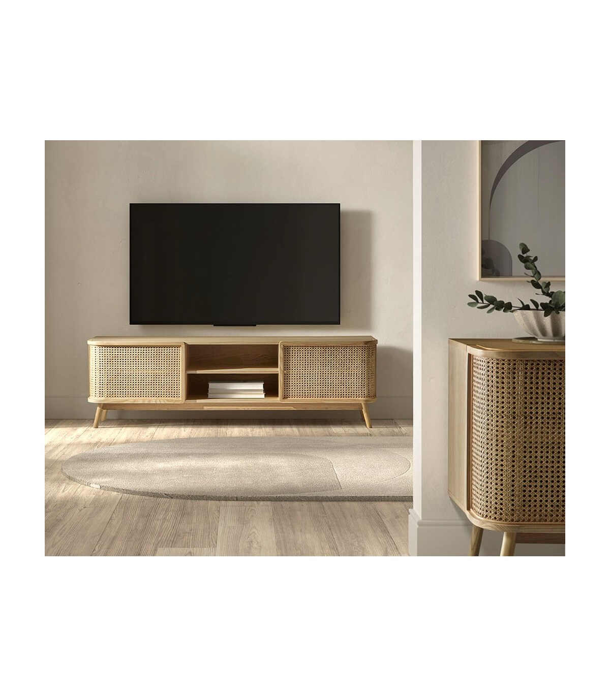 Mueble de TV realizado en madera de roble natural combinado con ratán acabado natural. Un buen mueble de capacidad que encajará perfectamente en tu salón.