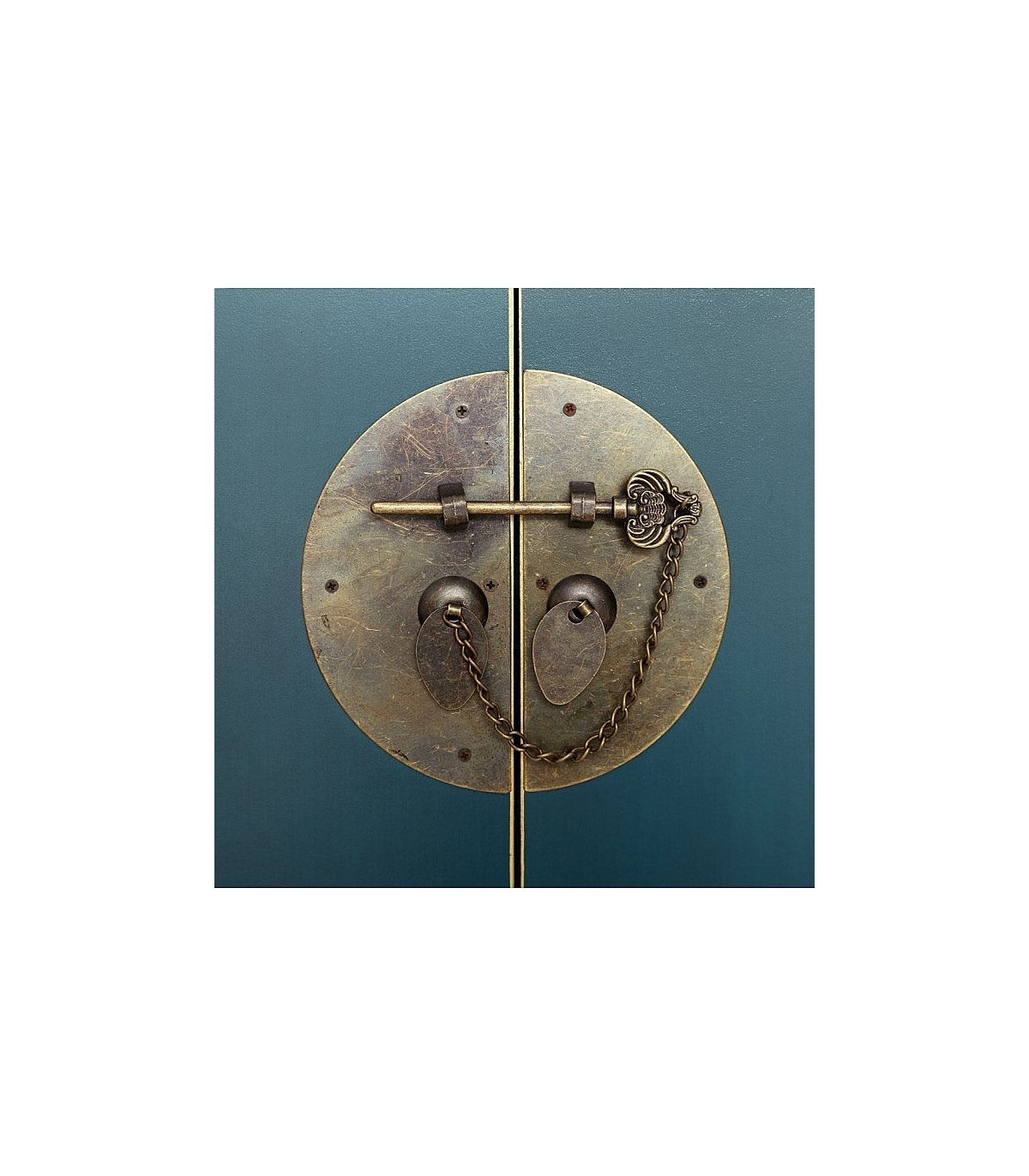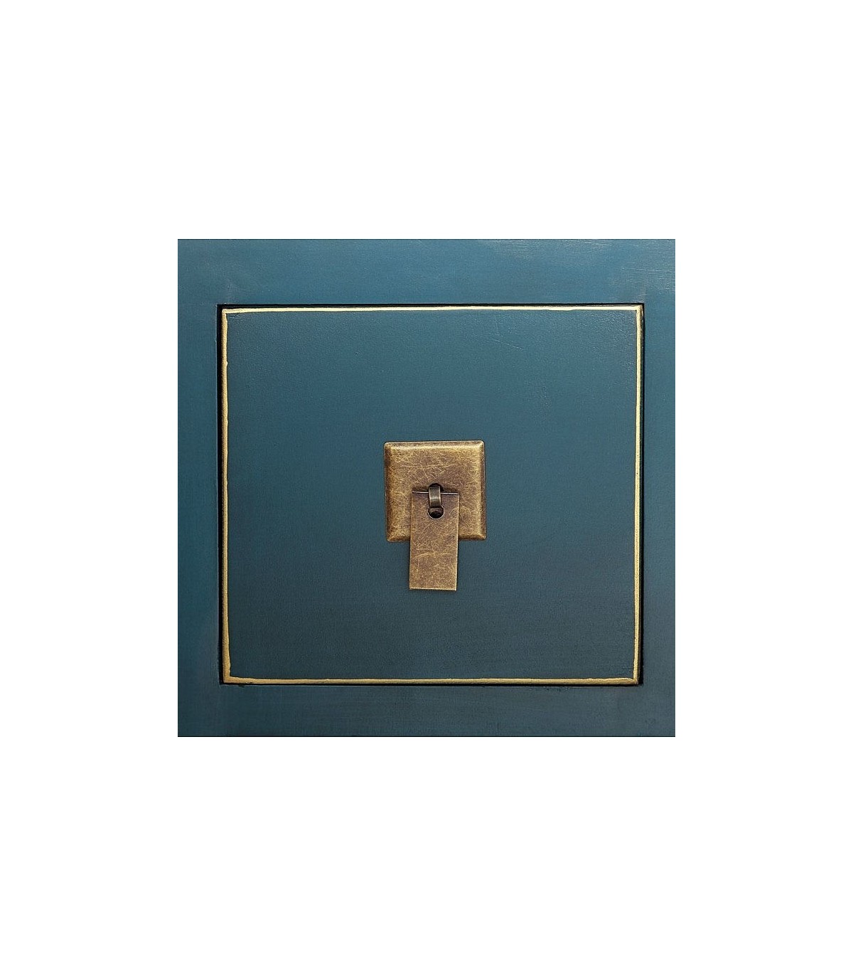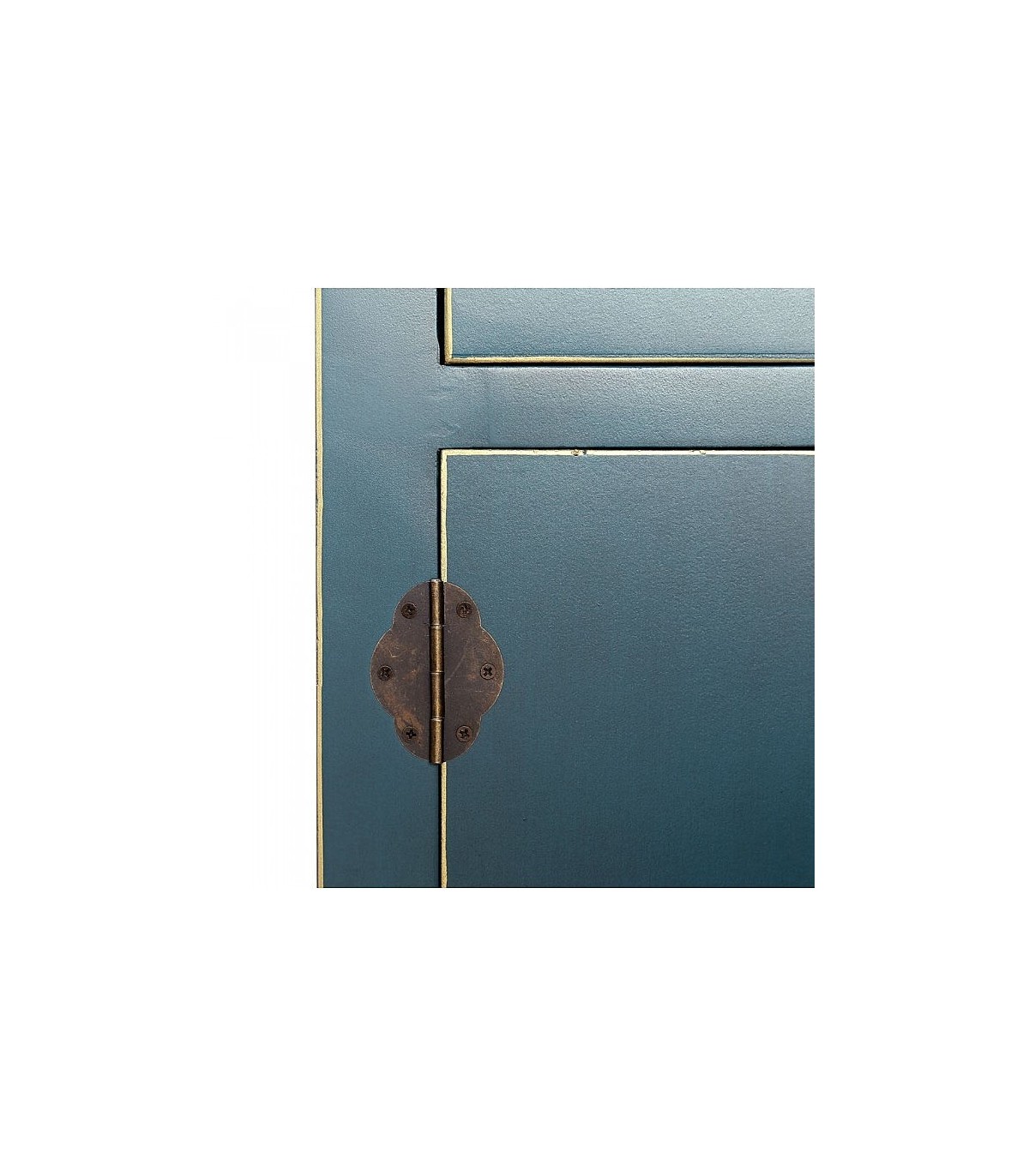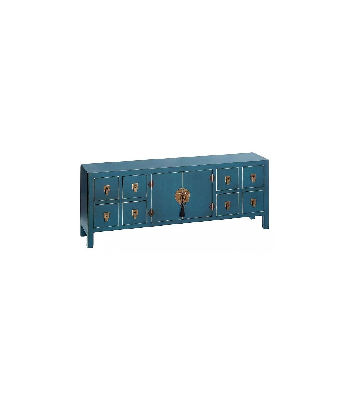 Mueble de televisión de estilo oriental realizada en madera mdf lacada en azul con los cantos perfilados en oro, con un cajón y dos puertas, una nota perfecta de color en tu salón.