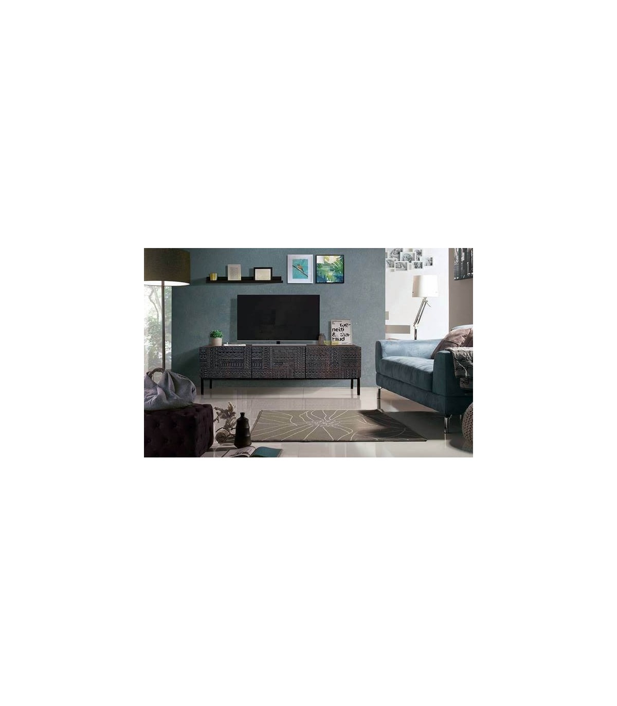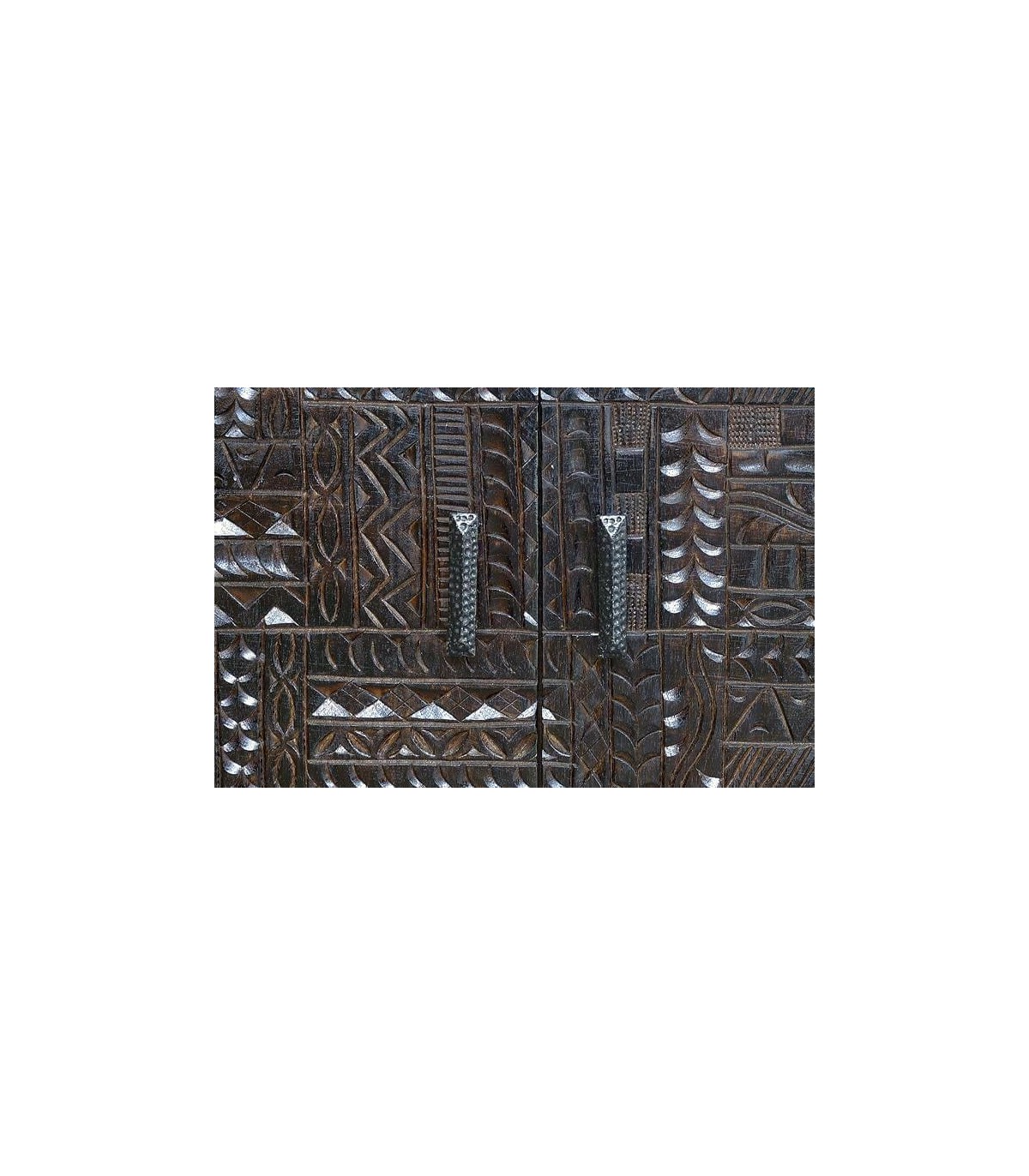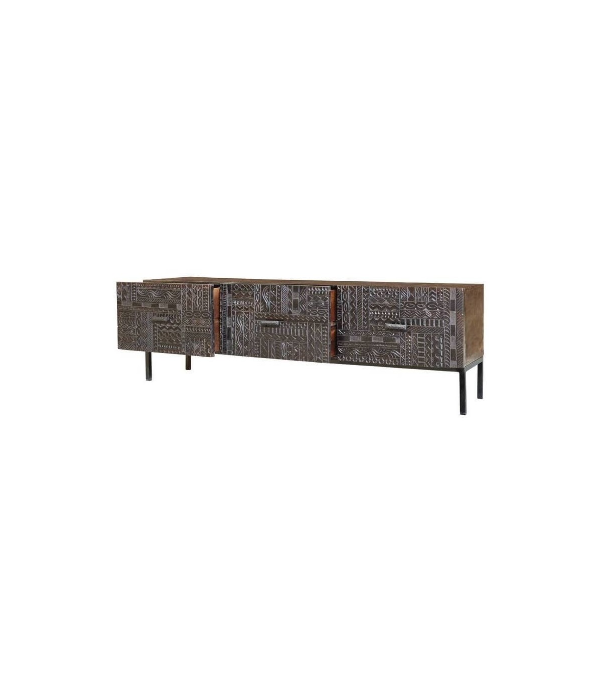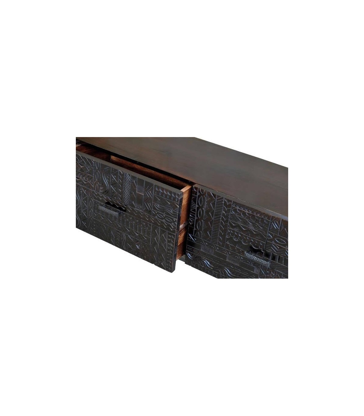 Mueble de TV de nuestra colección de muebles Azteca, una colección realizada en madera maciza de mango con las tallas hechas a mano artesanalmente y la base y los tiradores especificos para la colección en hierro forjado acabado negro, una colección muy racial y con carácter que le dara mucho sabor a tu decoración.