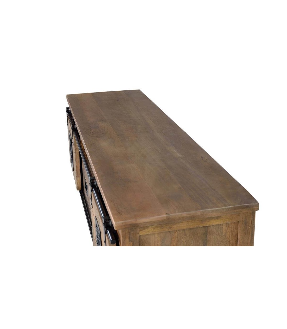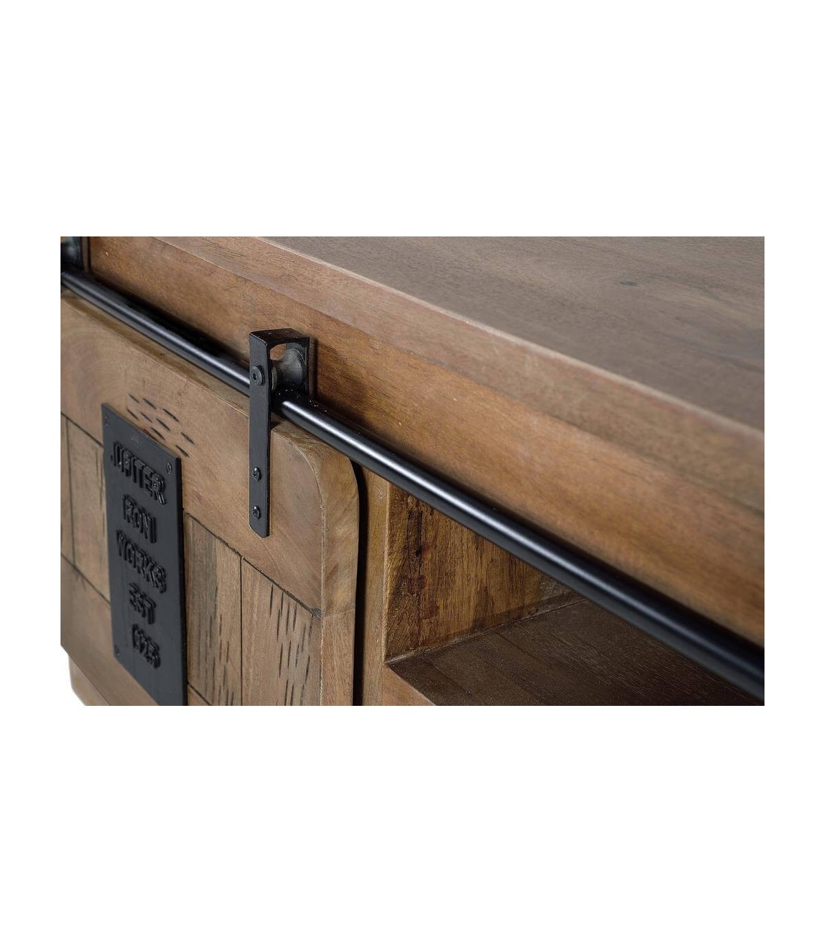 Mueble de TV de nuestra colección de muebles Chicago, una colección puramente industrial, realizada en madera maciza de mango, jugando con los contrastes de la madera y el metal y con esa puerta corredera tan característica, que aparte de funcionalidad hace de la colección un mueble indispensable para los amantes del estilo industrial.
