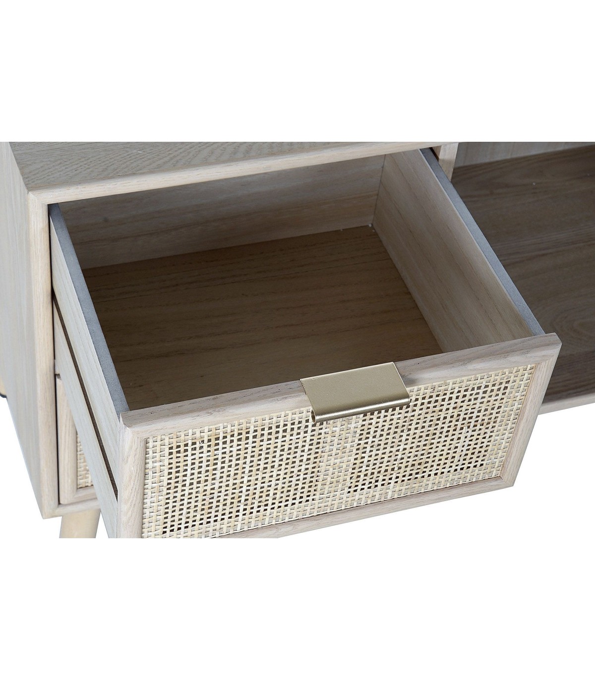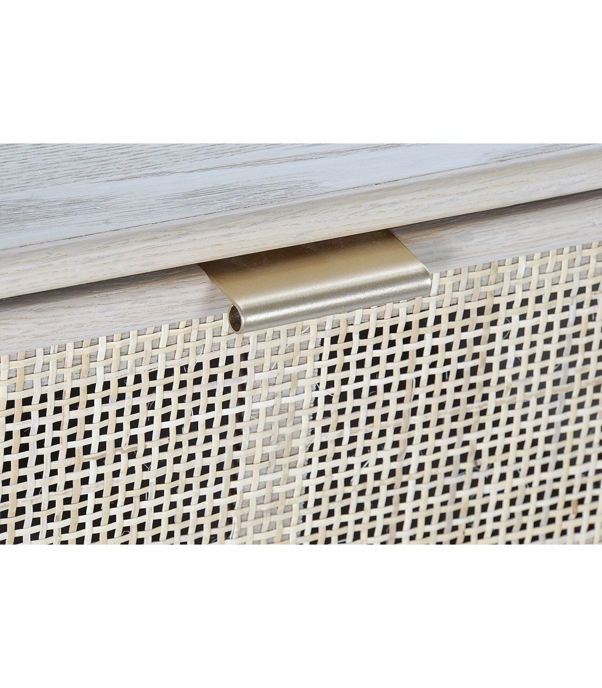 Acabado, madera acabado natural, ratán natural, tiradores color oro.