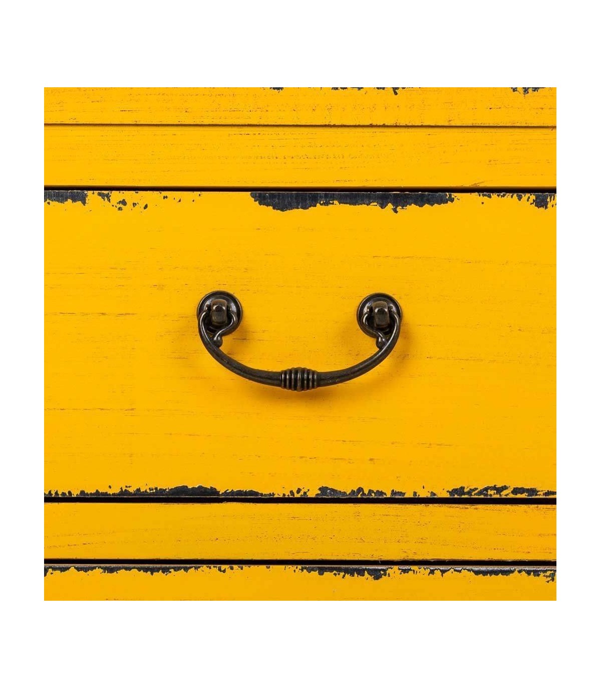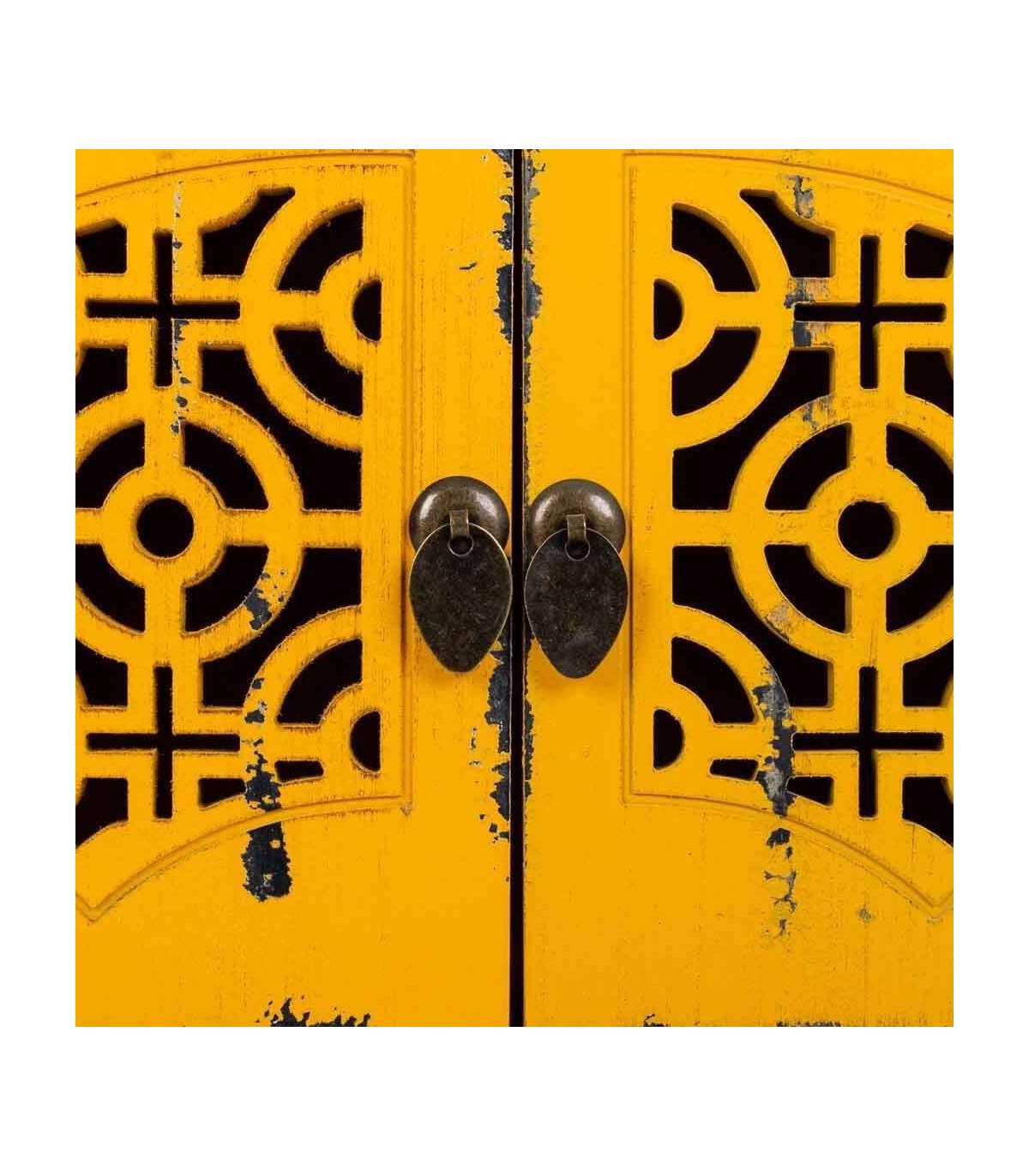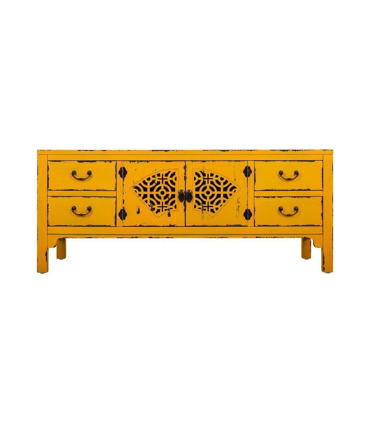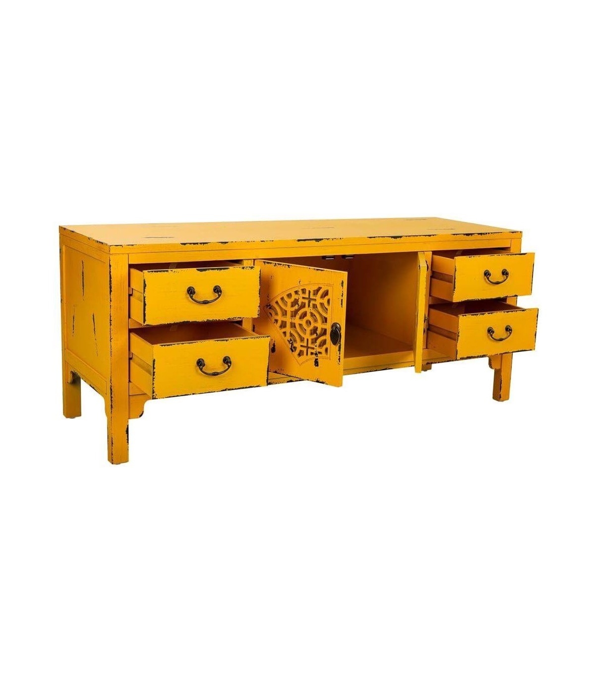 Mueble de TV estilo oriental decapado amarillo, una pieza única que combina funcionalidad y diseño exótico.