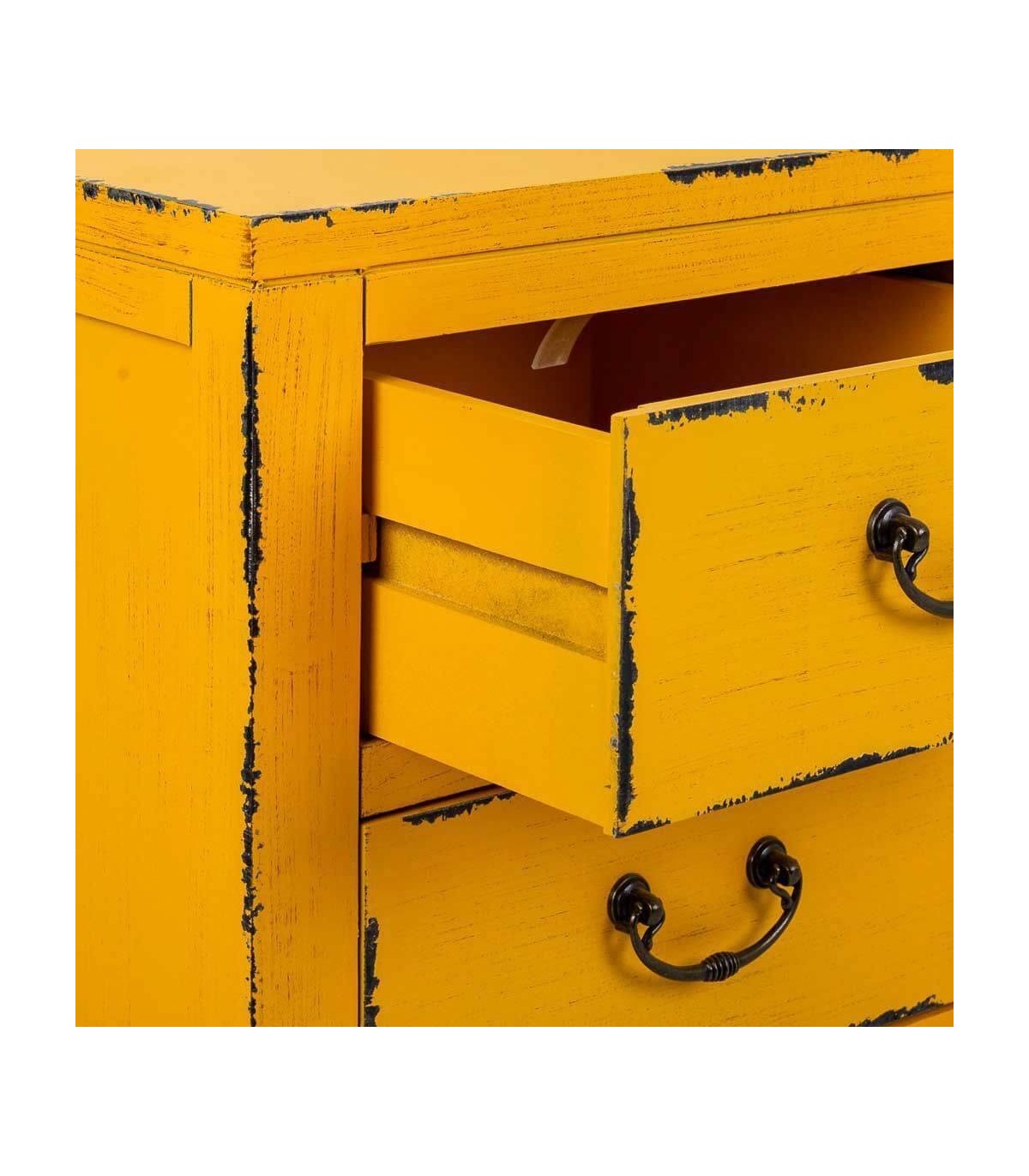 Acabado, madera tallada decapada en amarillo, tiradores de bronce.
