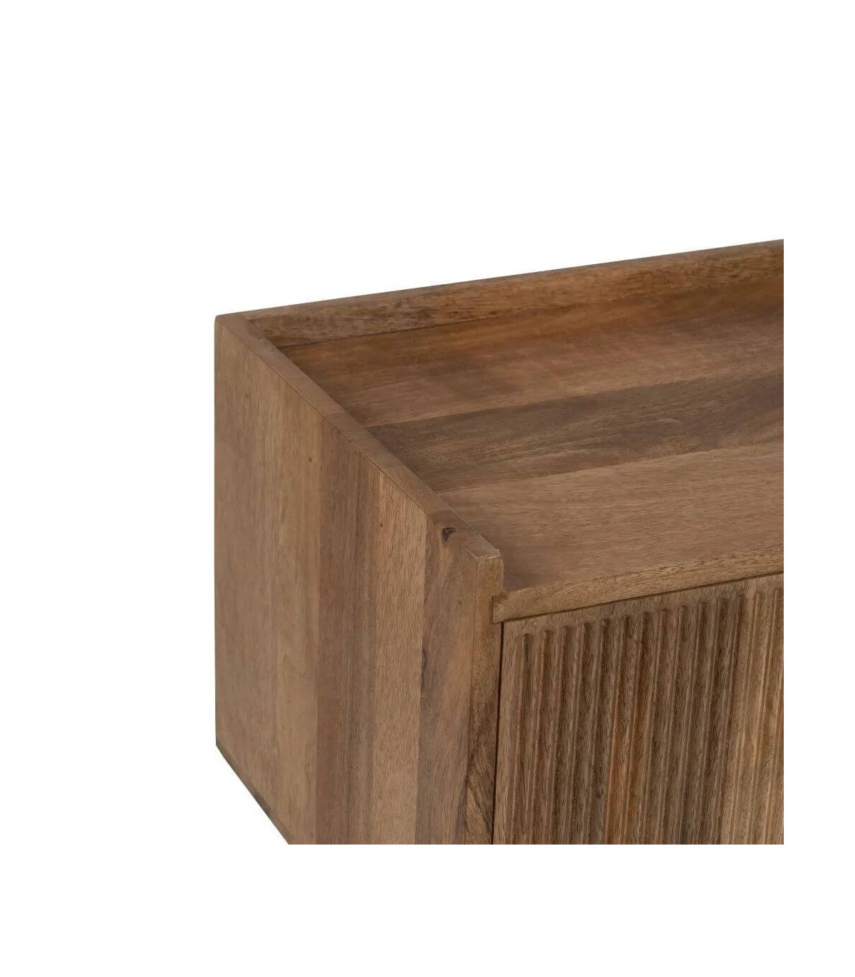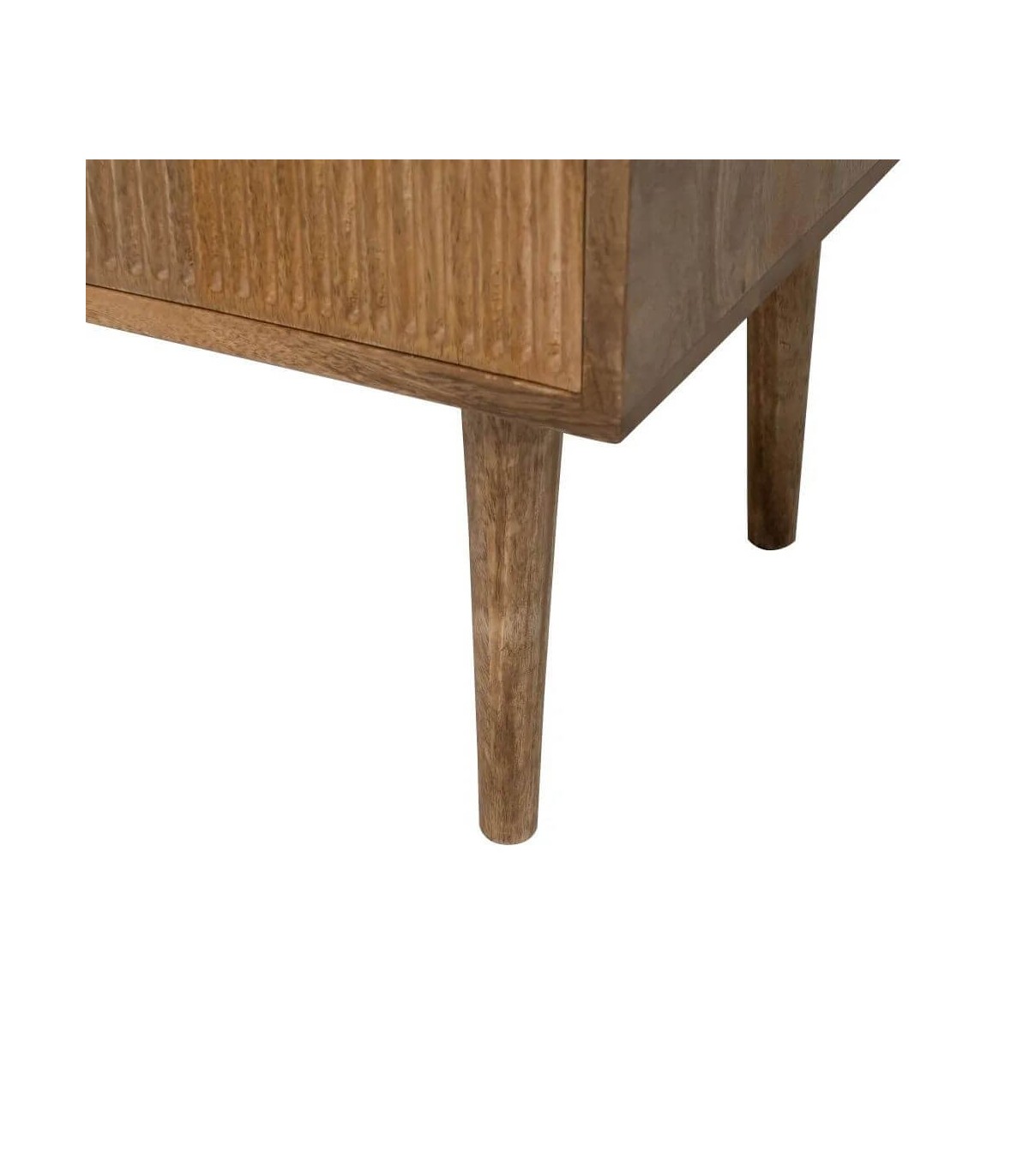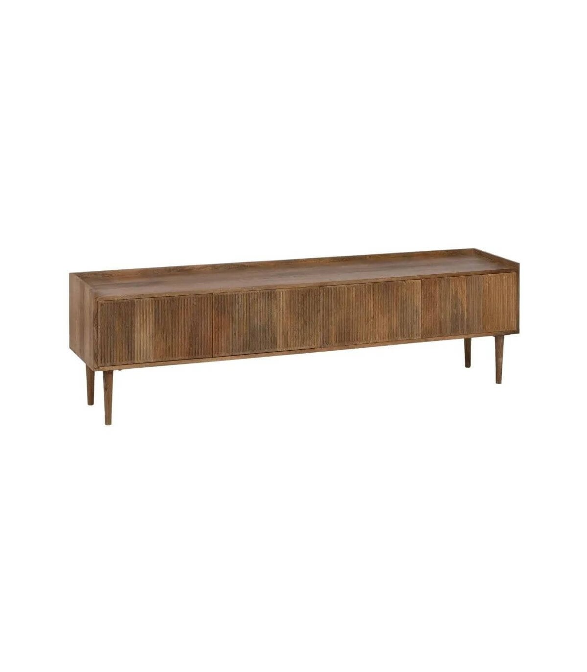Muble de Tv de nuestra colección Malpica, una colección sobria y elegante realizada en madera maciza de mango, con los frentes de los cajones y las puertas acanalados que le dan mucho movimiento, las patas cónicas acentúan el conjunto, las puertas y cajones no llevan tiradores van con push.