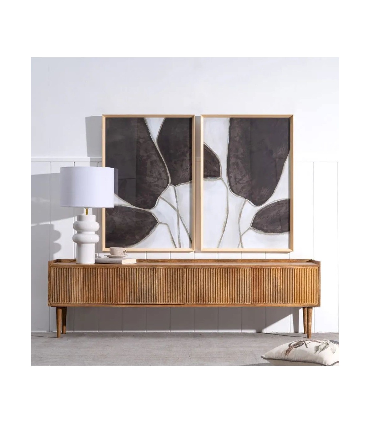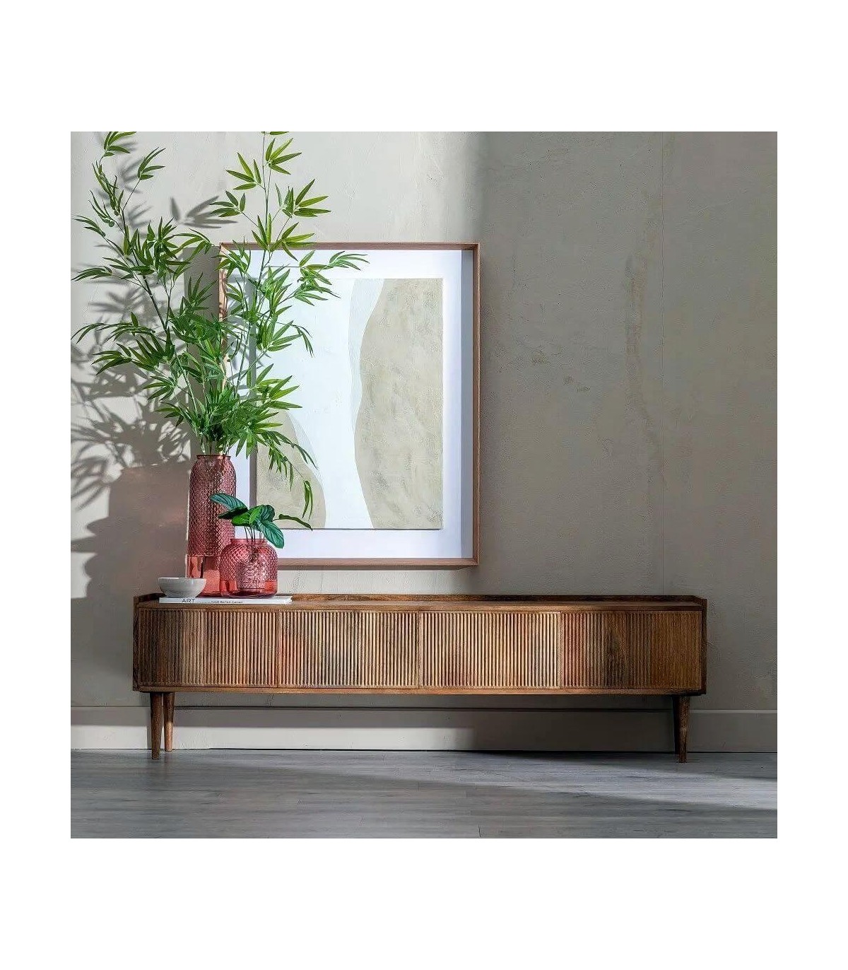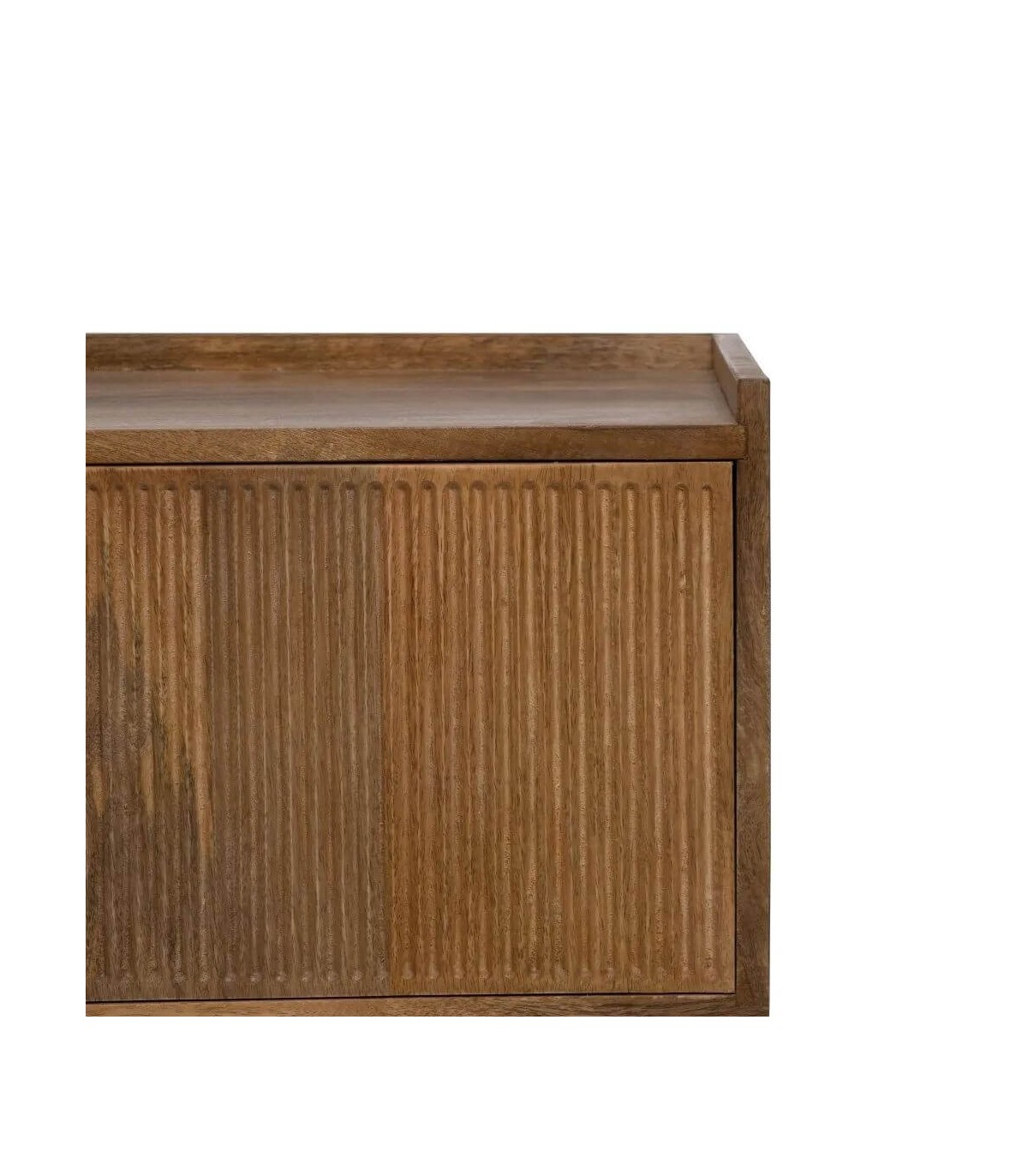 Muble de Tv de nuestra colección Malpica, una colección sobria y elegante realizada en madera maciza de mango, con los frentes de los cajones y las puertas acanalados que le dan mucho movimiento, las patas cónicas acentúan el conjunto, las puertas y cajones no llevan tiradores van con push.