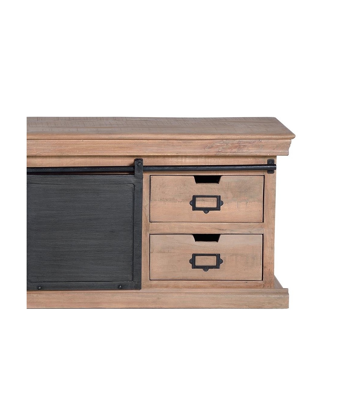 Mueble de TV de nuestra colección de muebles Manhattan, una colección puramente industrial, realizada en madera maciza de mango, jugando con los contrastes de la madera y el metal y con esa puerta corredera tan característica, que aparte de funcionalidad hace de la colección un mueble indispensable para los amantes del estilo industrial.