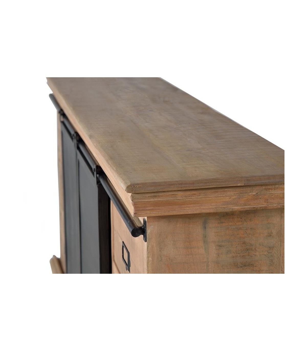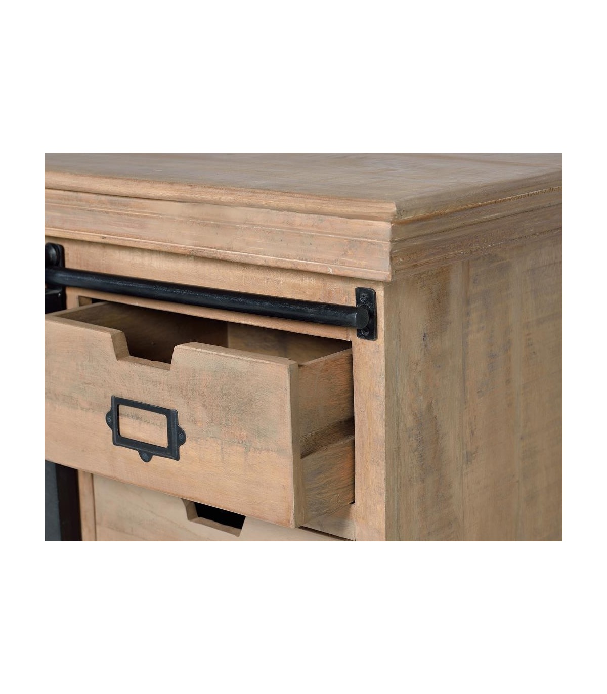 - Acabado, estructura en madera maciza de mango acabado natural, puerta, guias y tiradores en metal gris oscuro vintage.