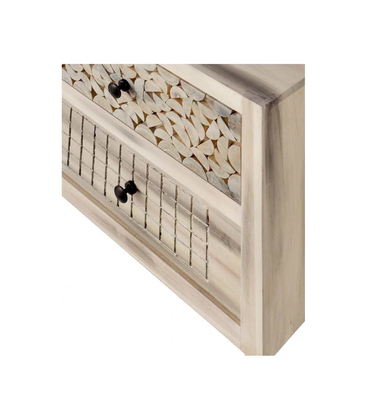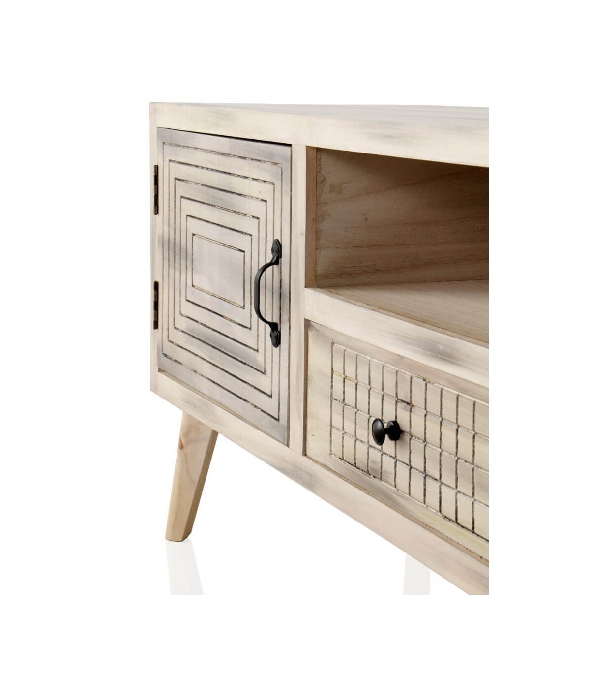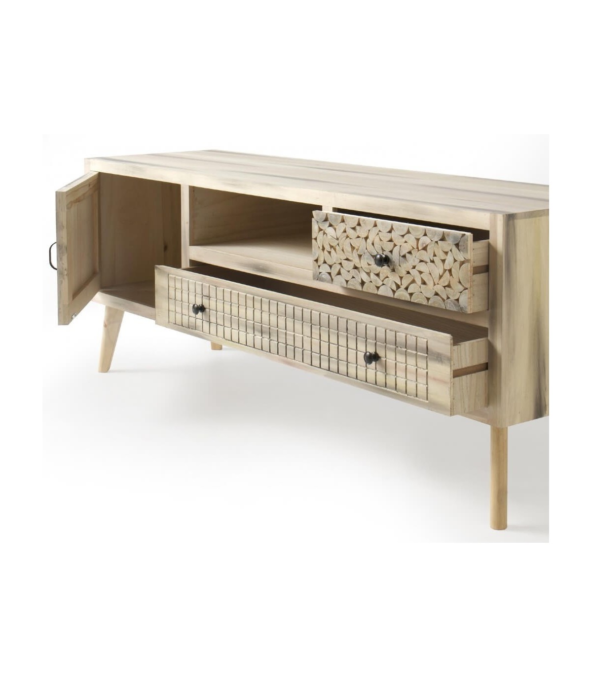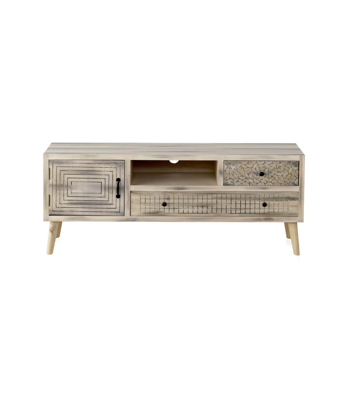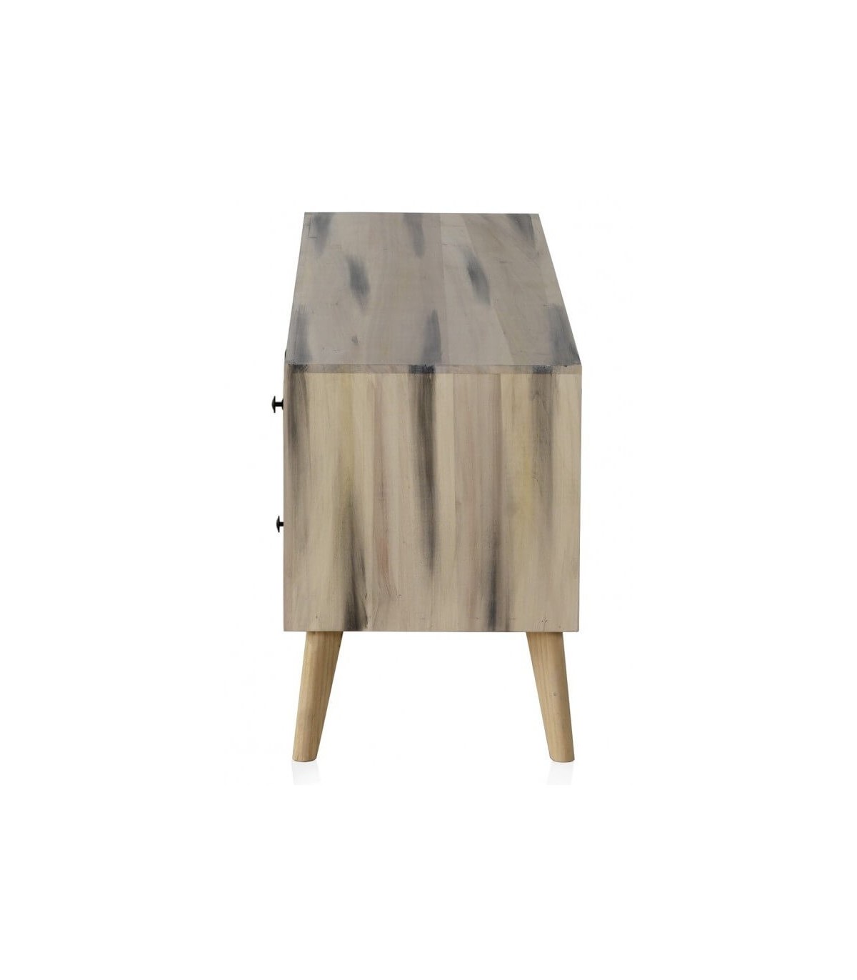 Mueble de TV de nuestra colección de muebles Mundo, una colección muy fresca y actual, de estilo vintage realizada en madera de álamo acabado natural con una pátina negra, se caracteriza por sus frentes con diferentes patrones decorativos, perfecta para tu dormitorio tu salón o como mueble auxiliar en cualquier lugar de tu casa.