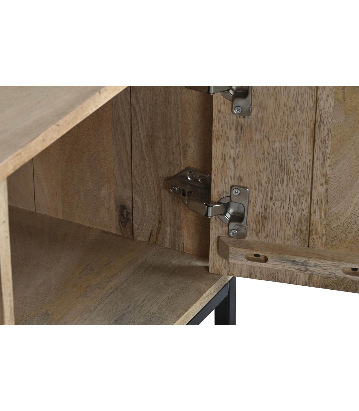 Mueble de TV de nuestra colección Nauna, una colección que se caracteriza por la combinación entre la madera natural y blanco de sus frentes decorados con motivos de hojas y las patas en metal negro. Una colección muy luminosa y decorativa de estilo boho chic, perfecta para darle un toque desenfadado a tu dormitorio, salóno zona auxiliar.