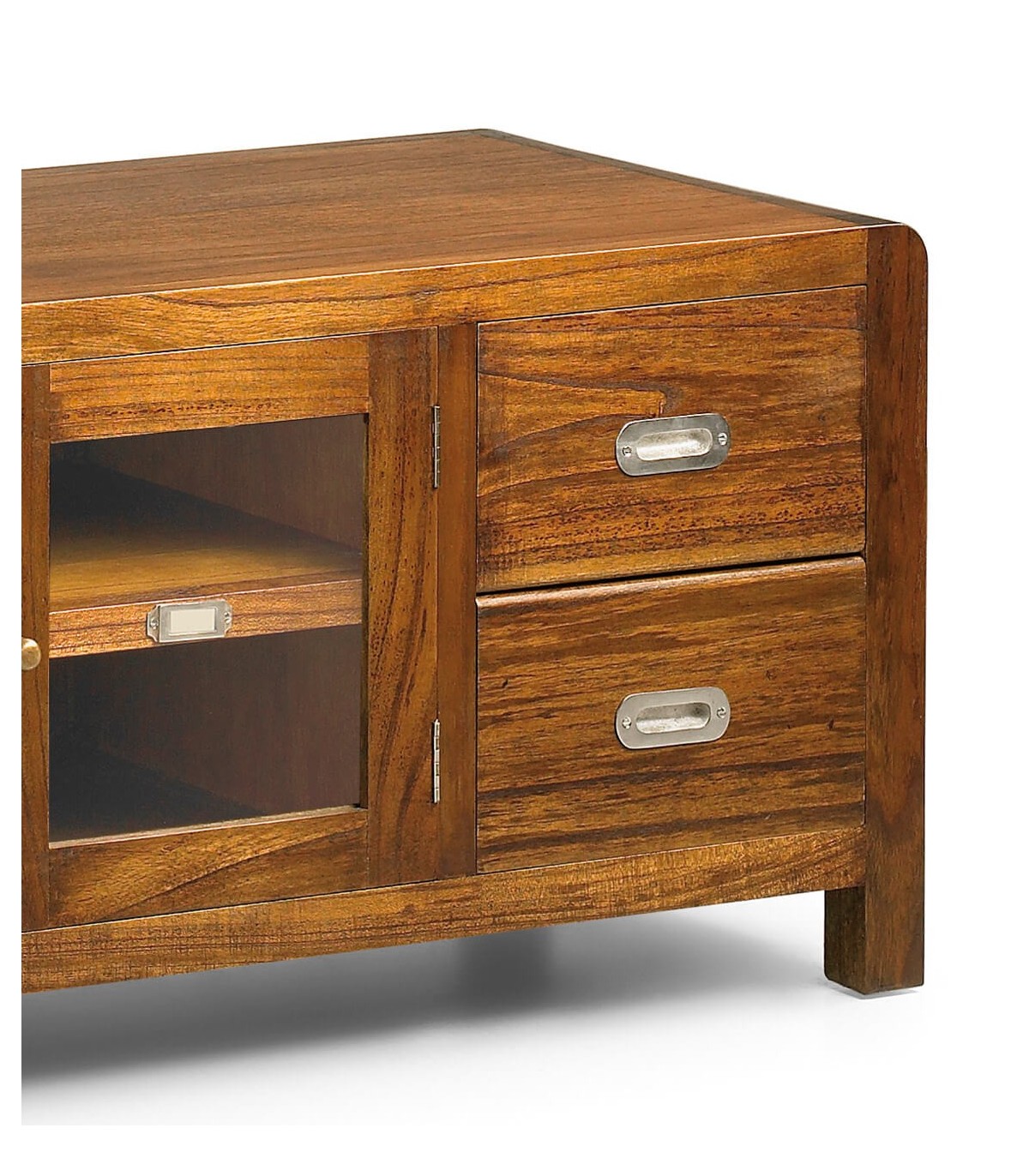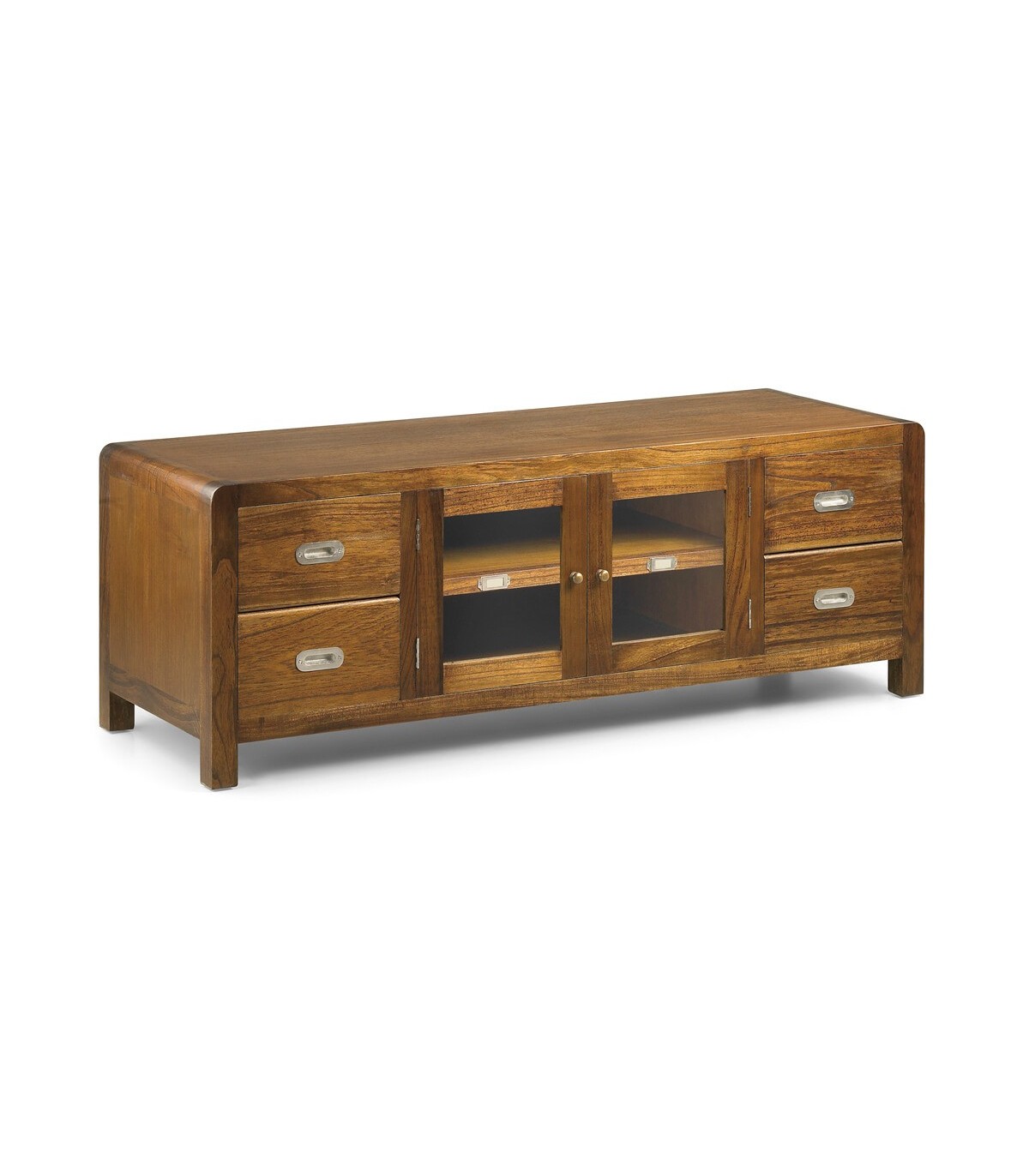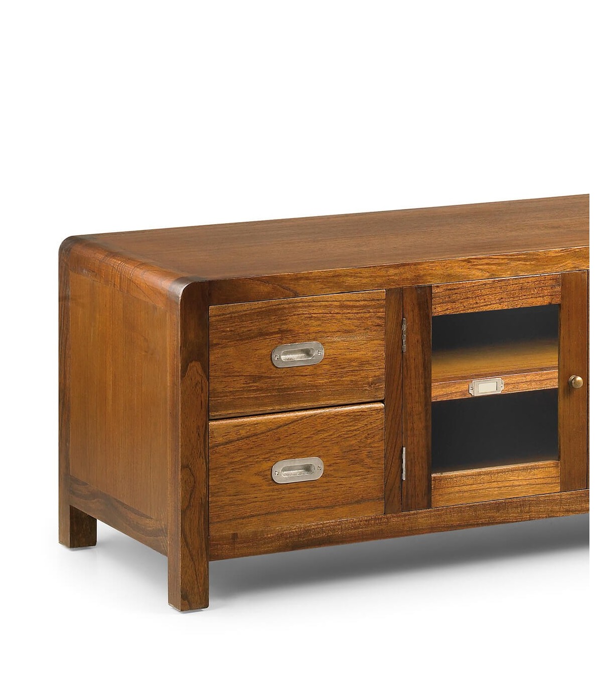 Muele de TV de nuestra colección Flash. Una colección realizada en madera maciza de mindi de estilo colonial, realizada de forma artesanal a mano una gran colección con muebles para todas las zonas de tu casa, de líneas rectas con el detalle curvo en todas sus esquinas y atemporales, un mueble que aporta calidez y presencia.