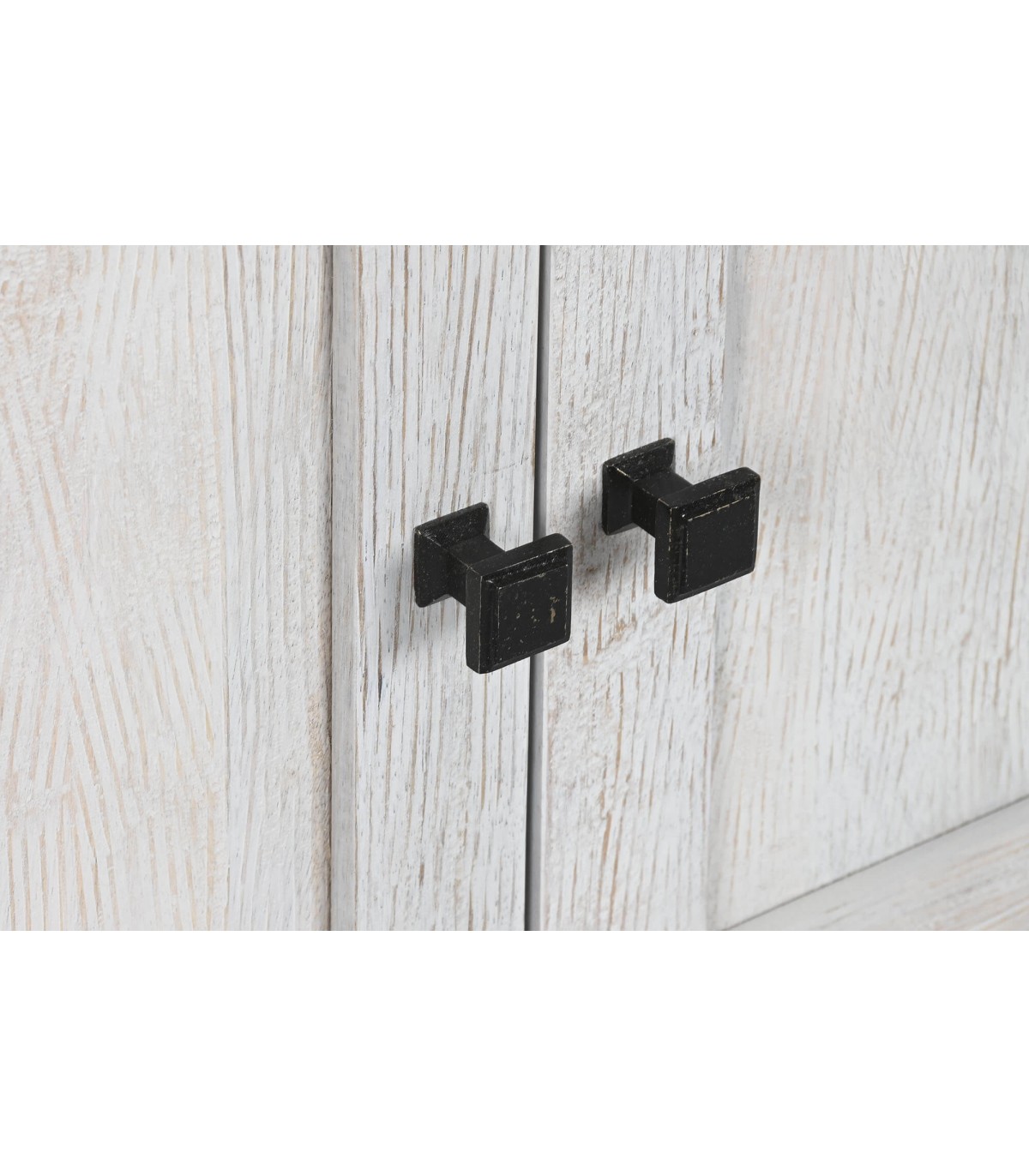 Con una estética luminosa y actual, este mueble de TV combina líneas depuradas con el encanto bohemio de los materiales naturales. Fabricado en madera maciza de mango con acabado blanco decapado, incorpora dos puertas con tiradores metálicos en negro y baldas abiertas para dispositivos multimedia o decoración. Su estructura ligera pero robusta permite mantener el orden sin renunciar al estilo, aportando calidez y personalidad al salón.