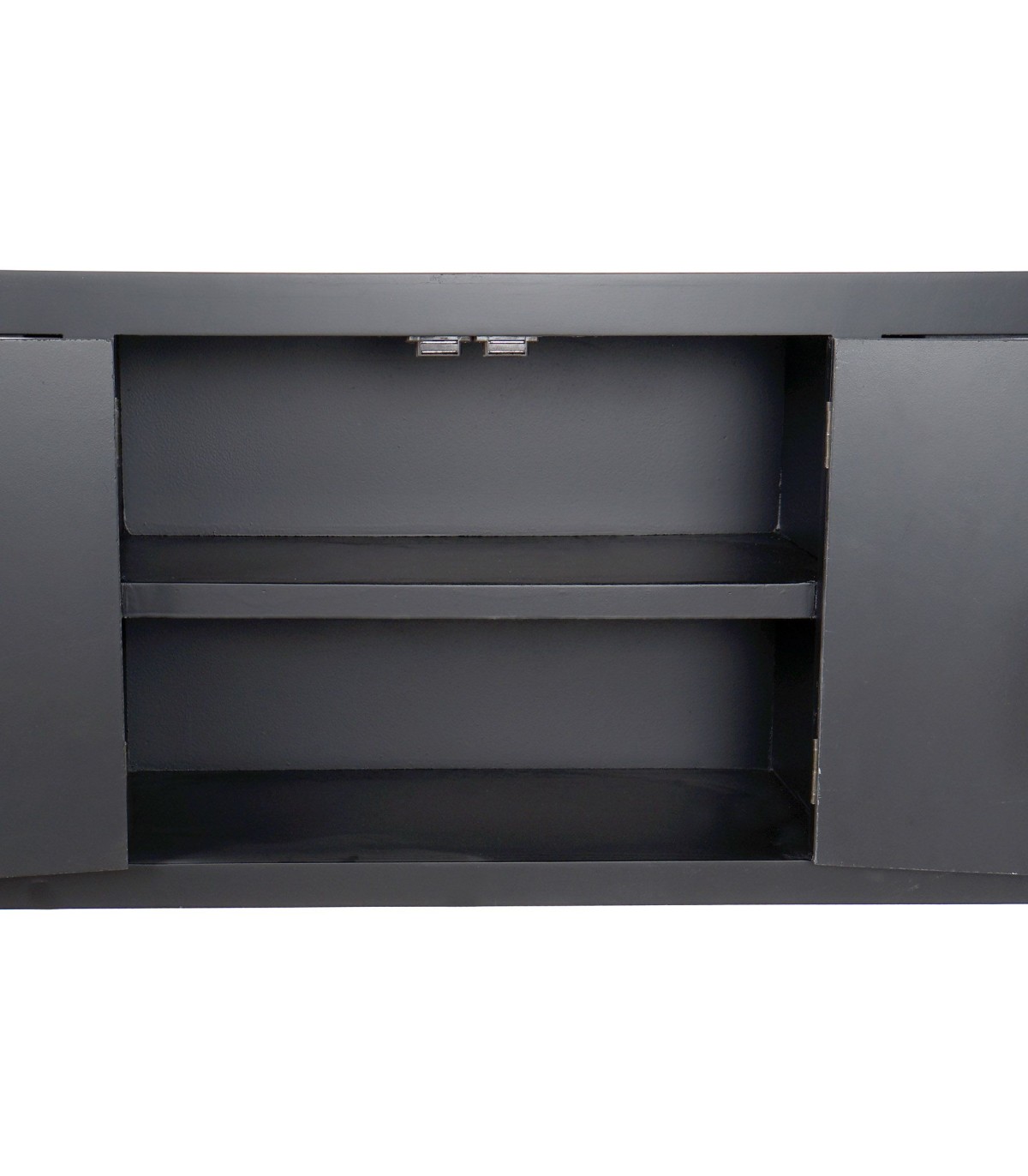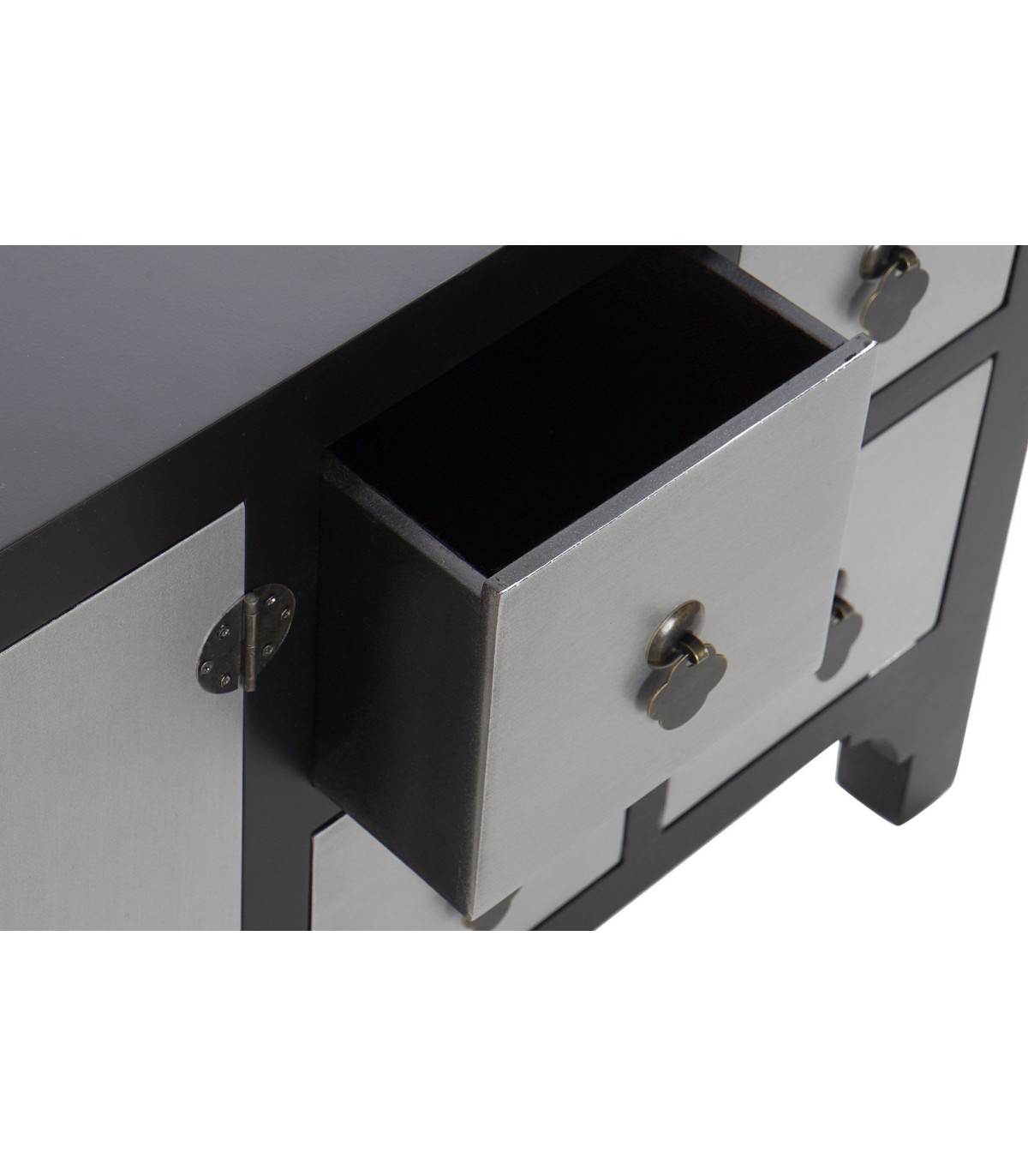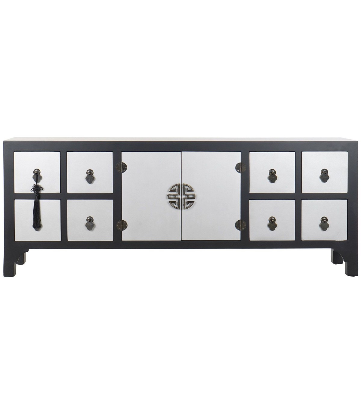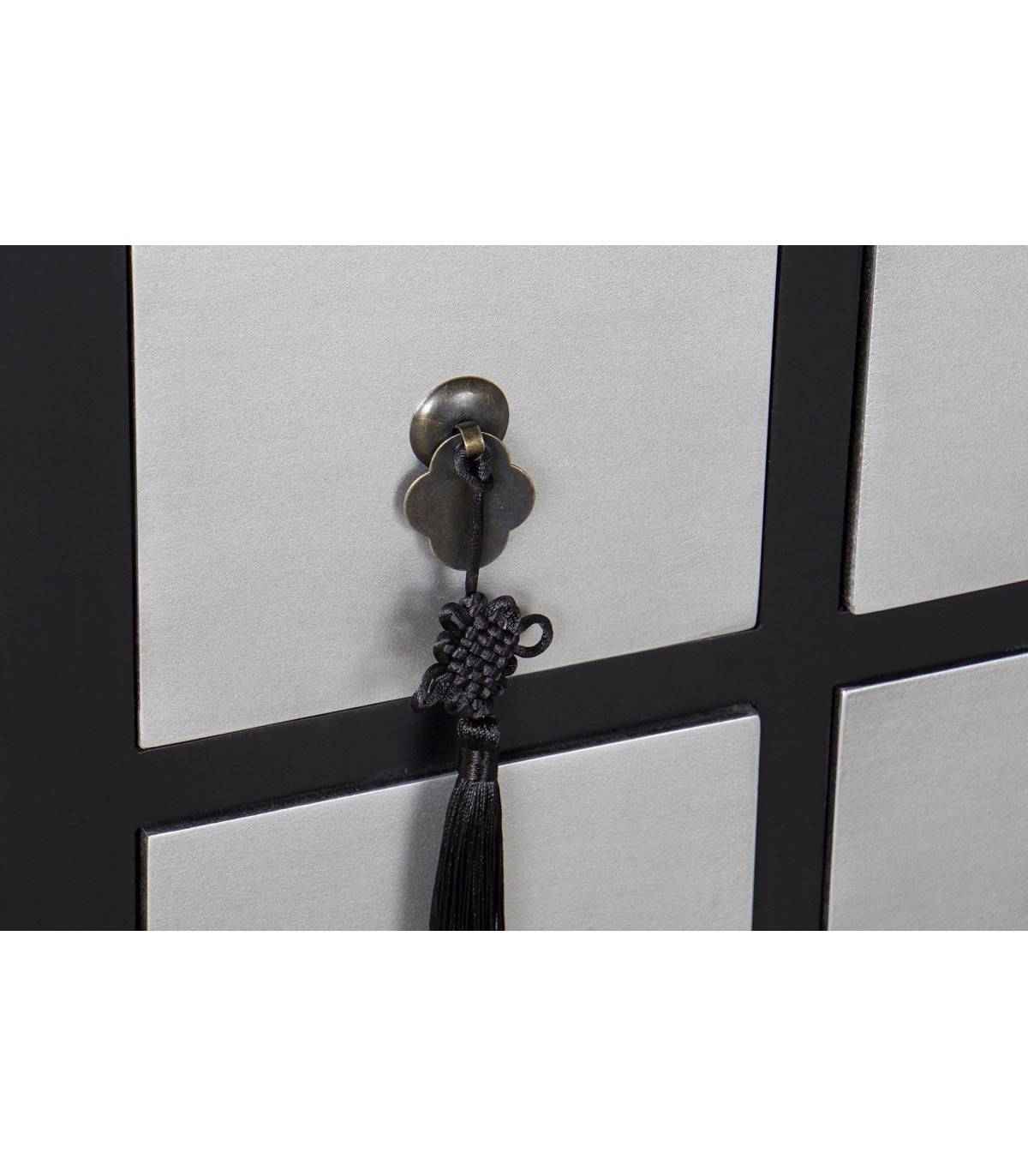 Este mueble de TV con ocho cajones y dos puertas combina equilibrio estético y funcionalidad inspirada en la tradición oriental. Su estructura de madera de abeto, lacada en negro y plata, transmite elegancia sobria y sofisticación artesanal.