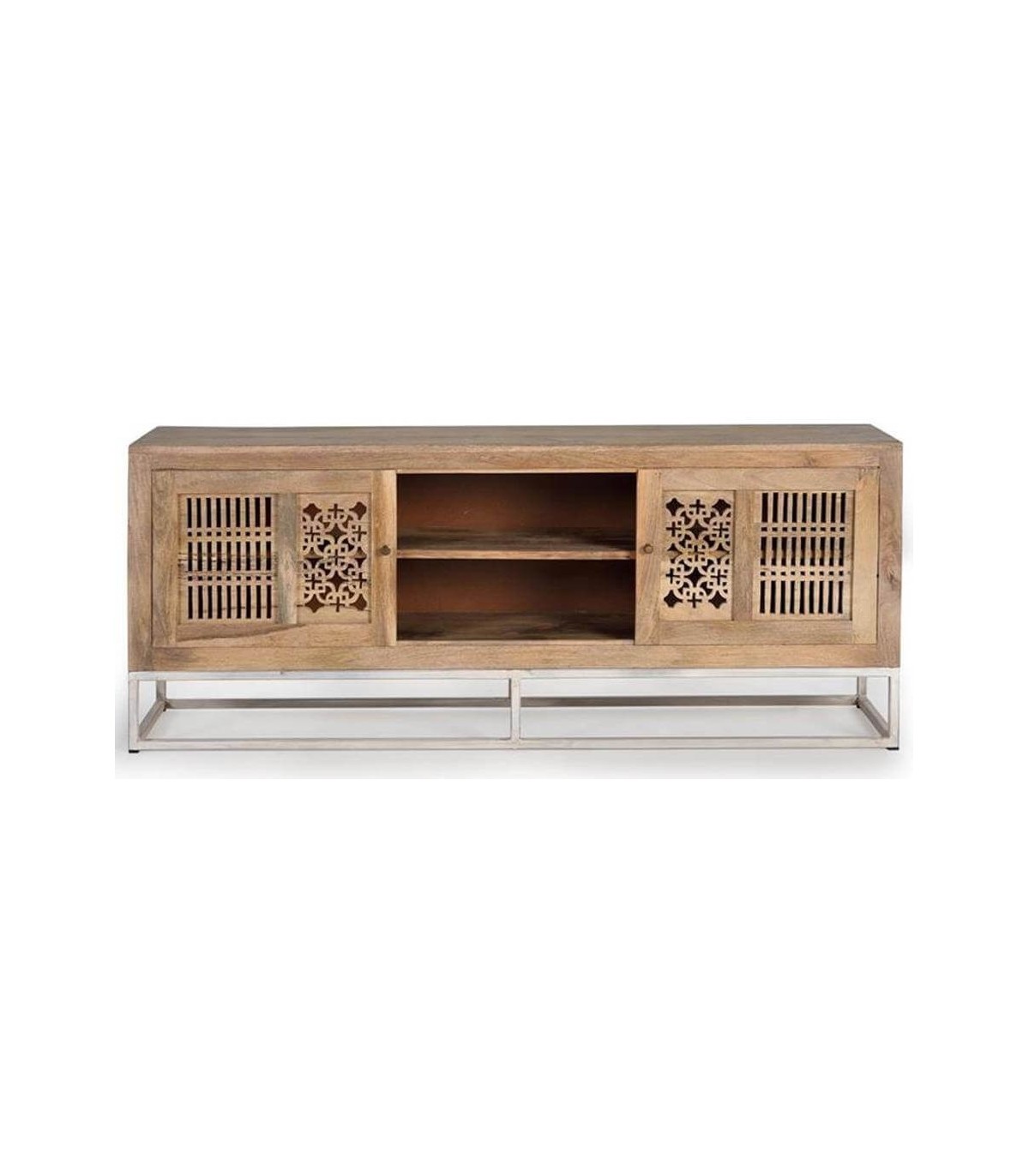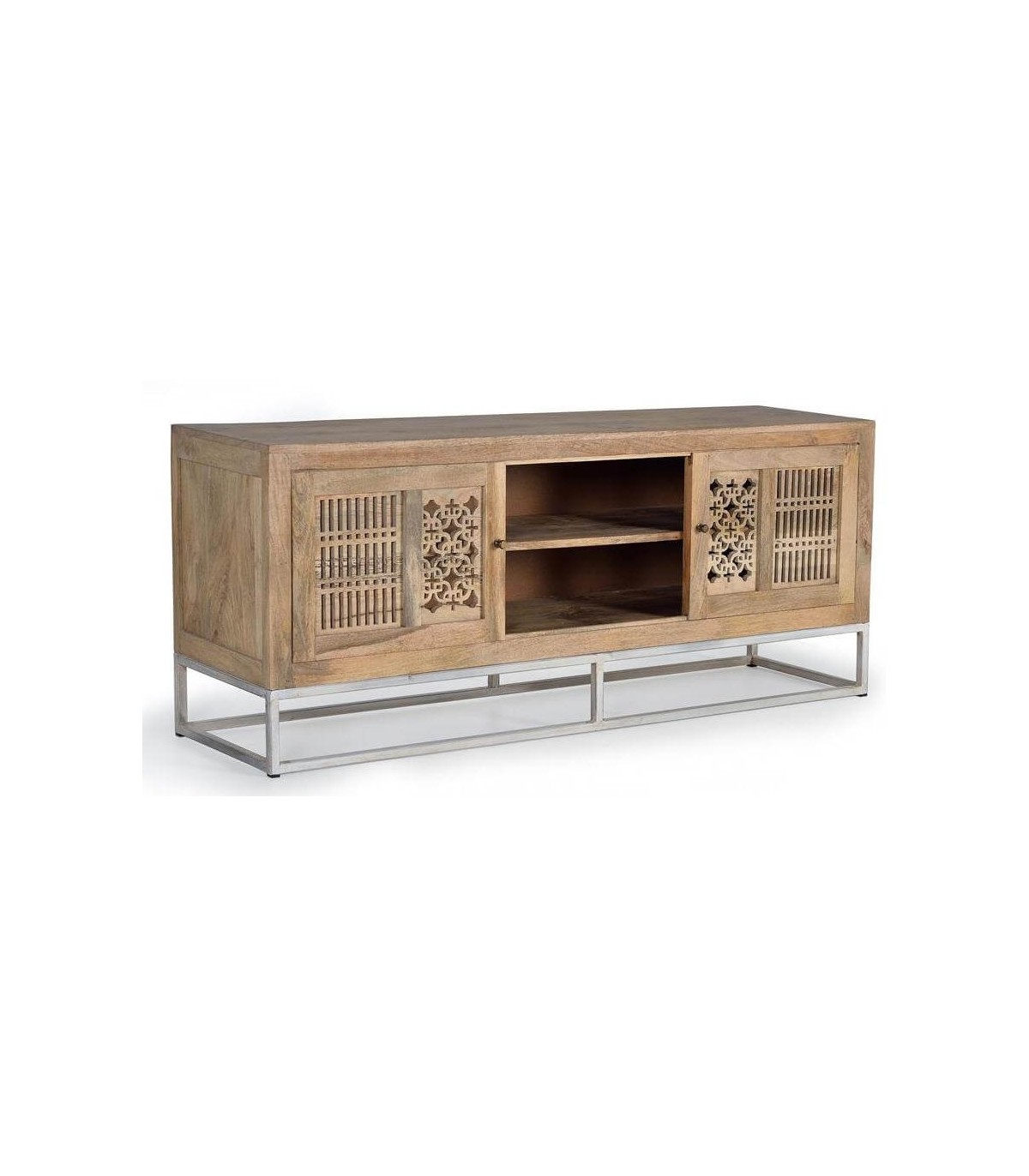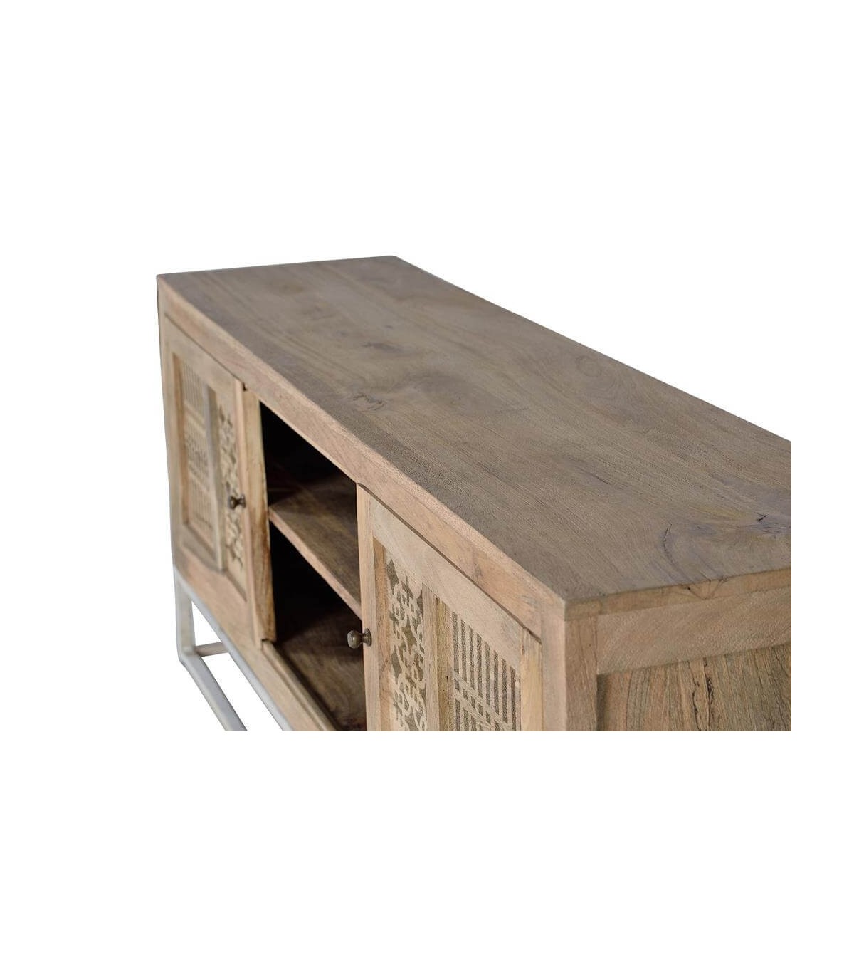 Mueble de TV de nuestra colección de muebles Mamba, una colección realizada en madera maciza de mango tallada a mano acabada en natural, a caballo entre el estilo étnico y el toque contemporáneo que nos da la base en metal a juego de la madera, una colección muy versátil y decorativa.