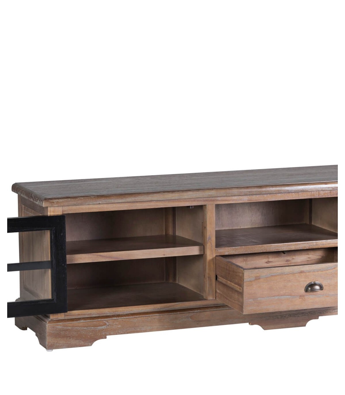 • Mueble de TV, puertas de  vitrina con celosía, 2 puertas de cristal, 1 cajón, estilo colonial.