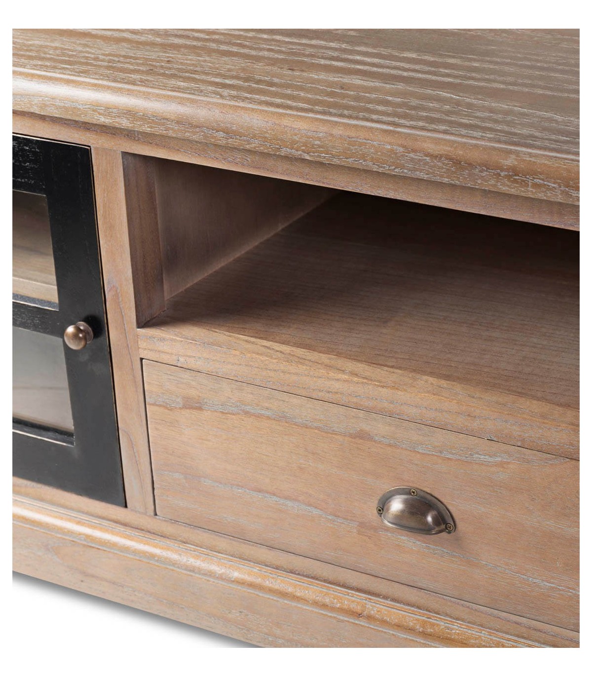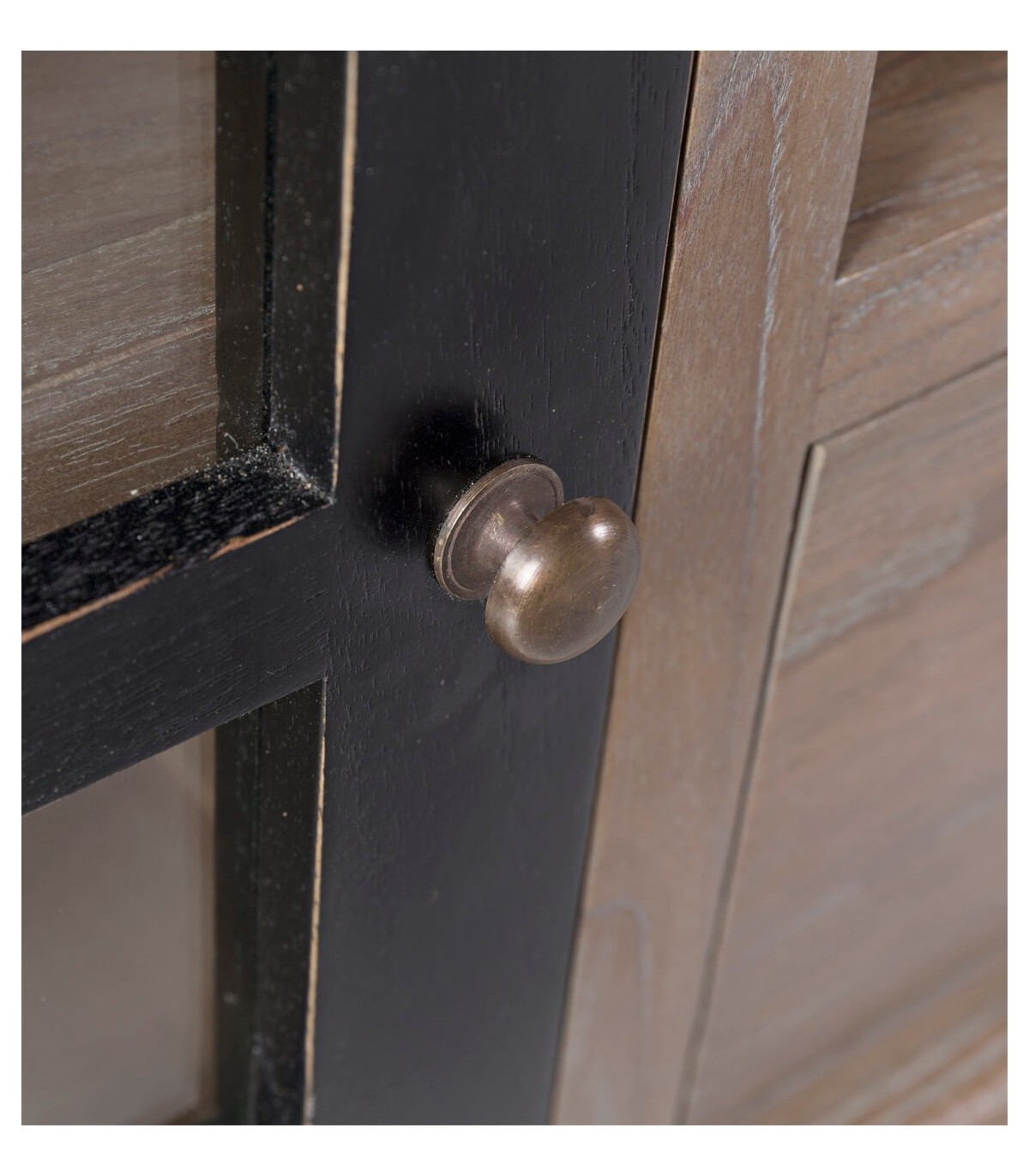 • Acabado, estructura madera natural color miel, marco de puertas teñidas en negro, tiradores en bronce pavonado.