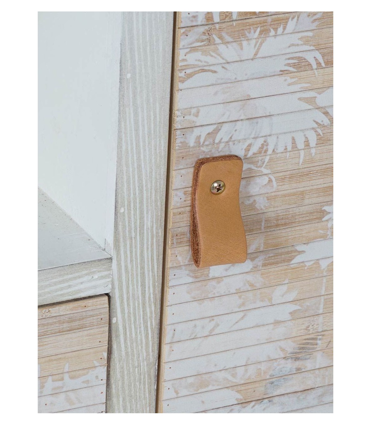 Material, madera de paulonia, patas de madera, tiradores cuero.