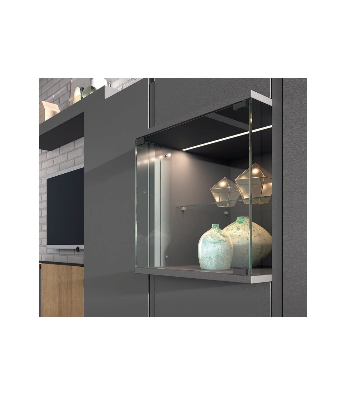 Aplicable a vitrinas y huecos de diferentes medidas mediante sistemas integrados y ocultos con iluminación Led cálida e interruptor incorporado. Todo más estético y preparado desde fábrica para fácil montaje. También iluminación interna de estantes de cristal como opción.
