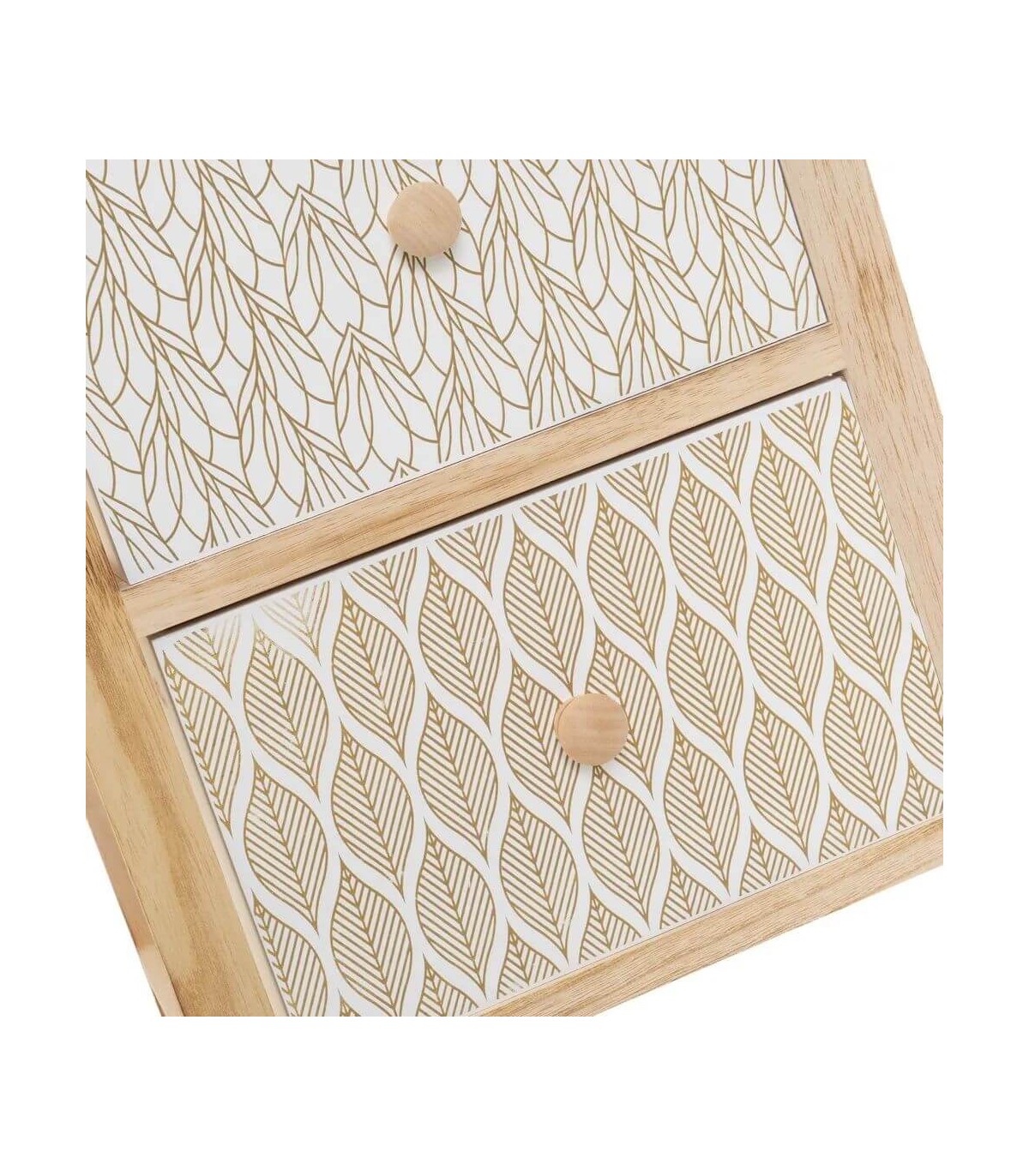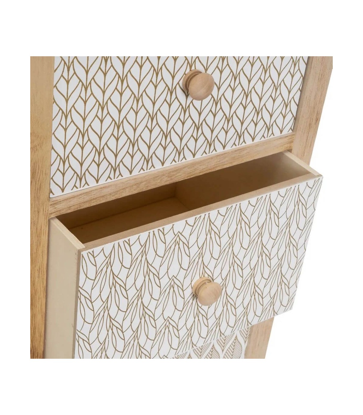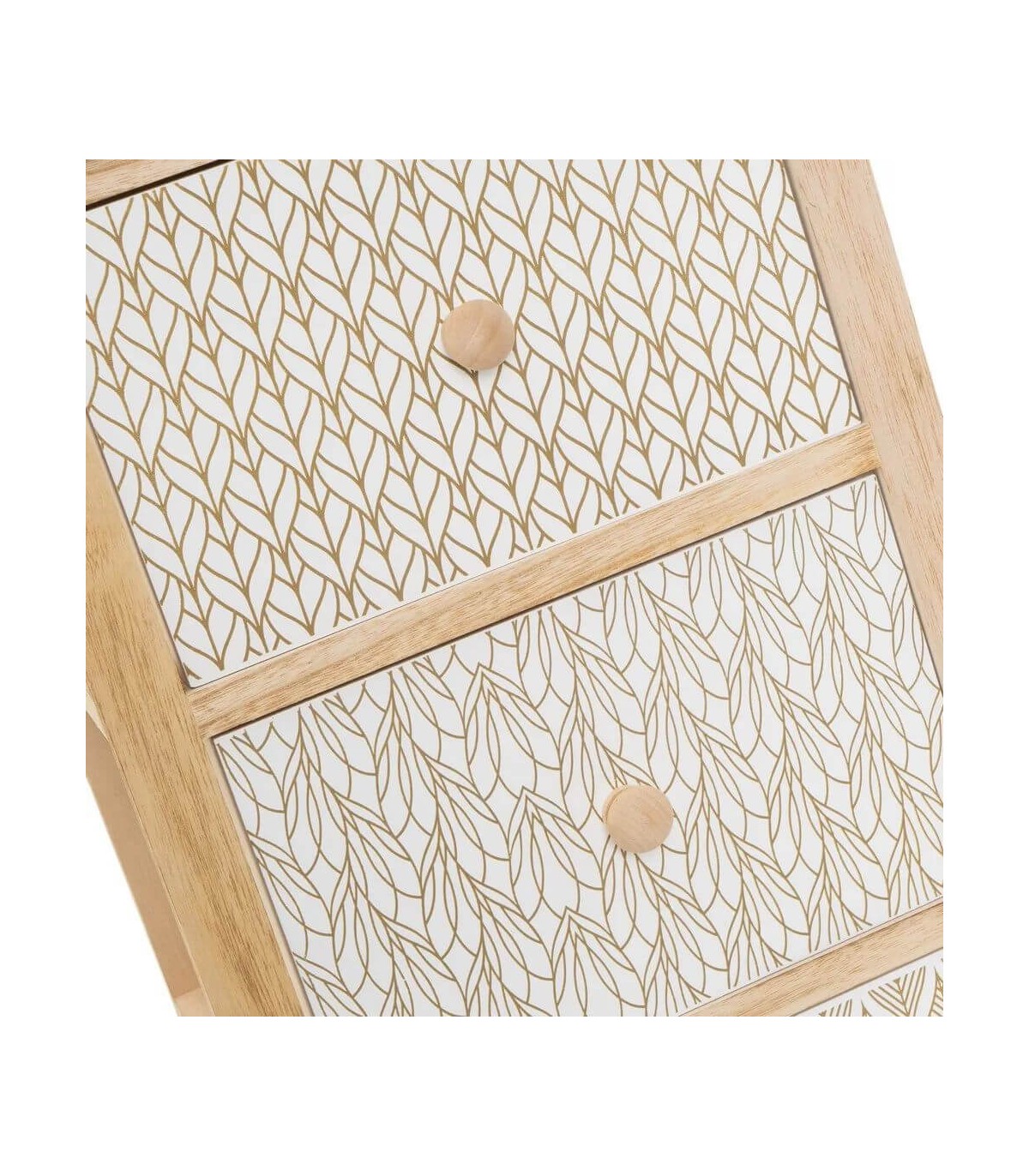 Cajonera auxiliar, 3 cajones, realizada con la estructura en madera natural cajones con dibujos étnicos en blanco y dorado. perfecta para el cuarto de baño, un diseño de estilo étnico.
