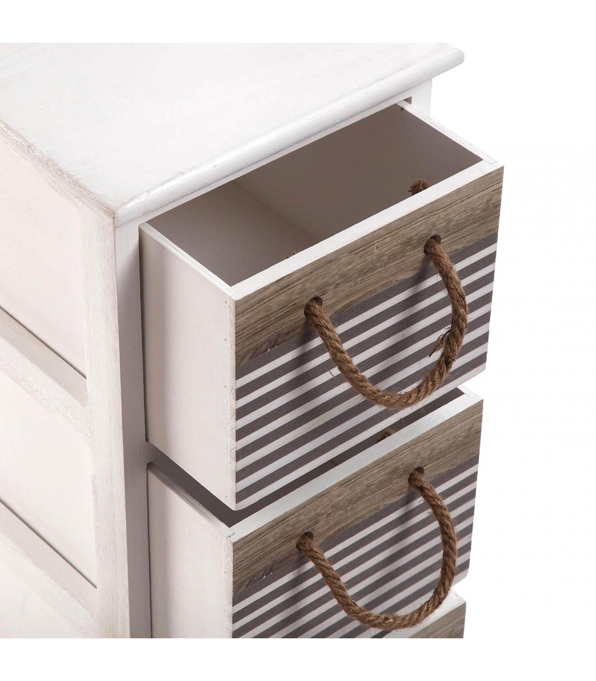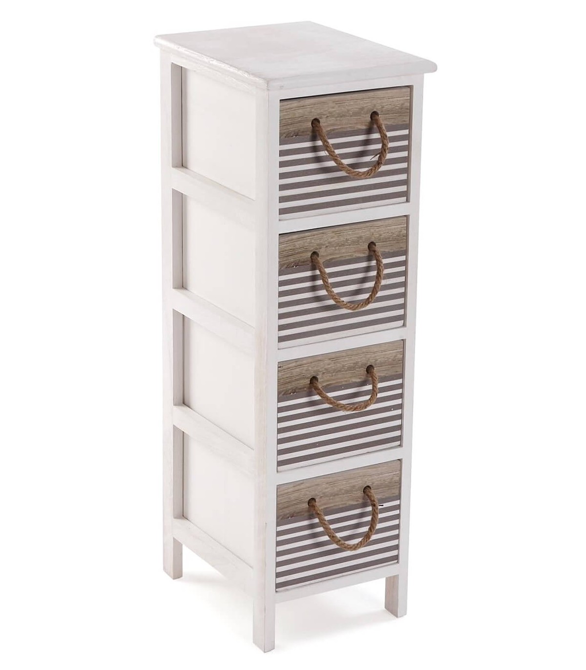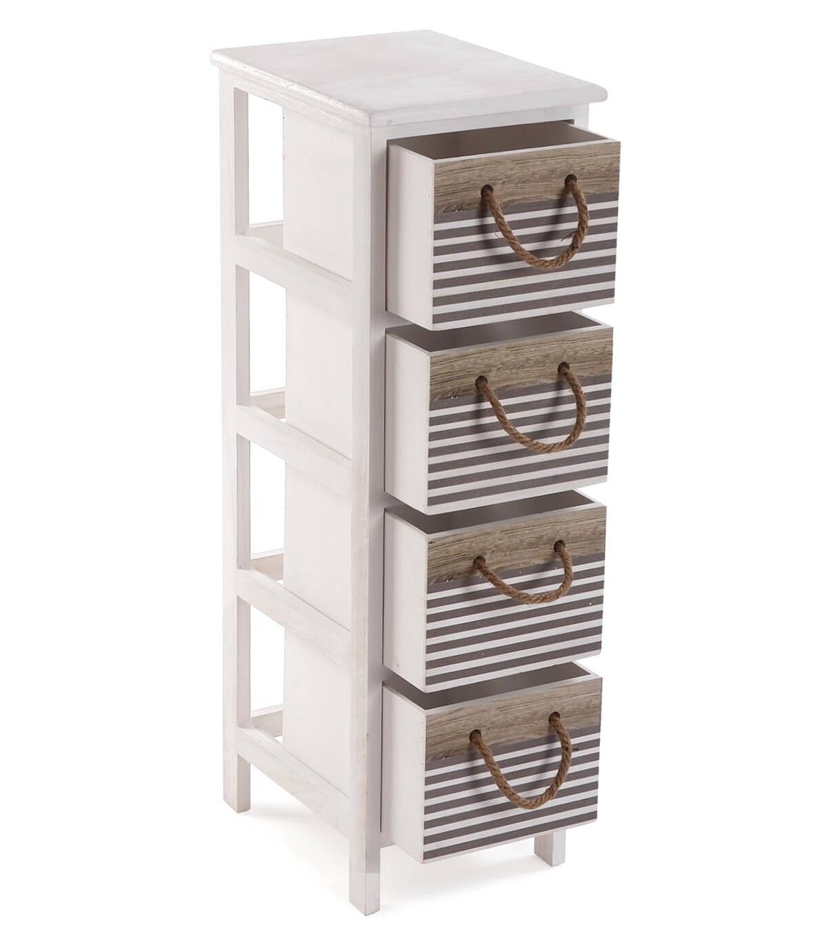 Cajonera auxiliar alta, 4 cajones, realizada con la estructura madera color blanco, cajones con tiradores de cuerda natural y frentes decorados. perfecta para el cuarto de baño, o como para poner como mesita de noche, un diseño de aire marino desenfadado.