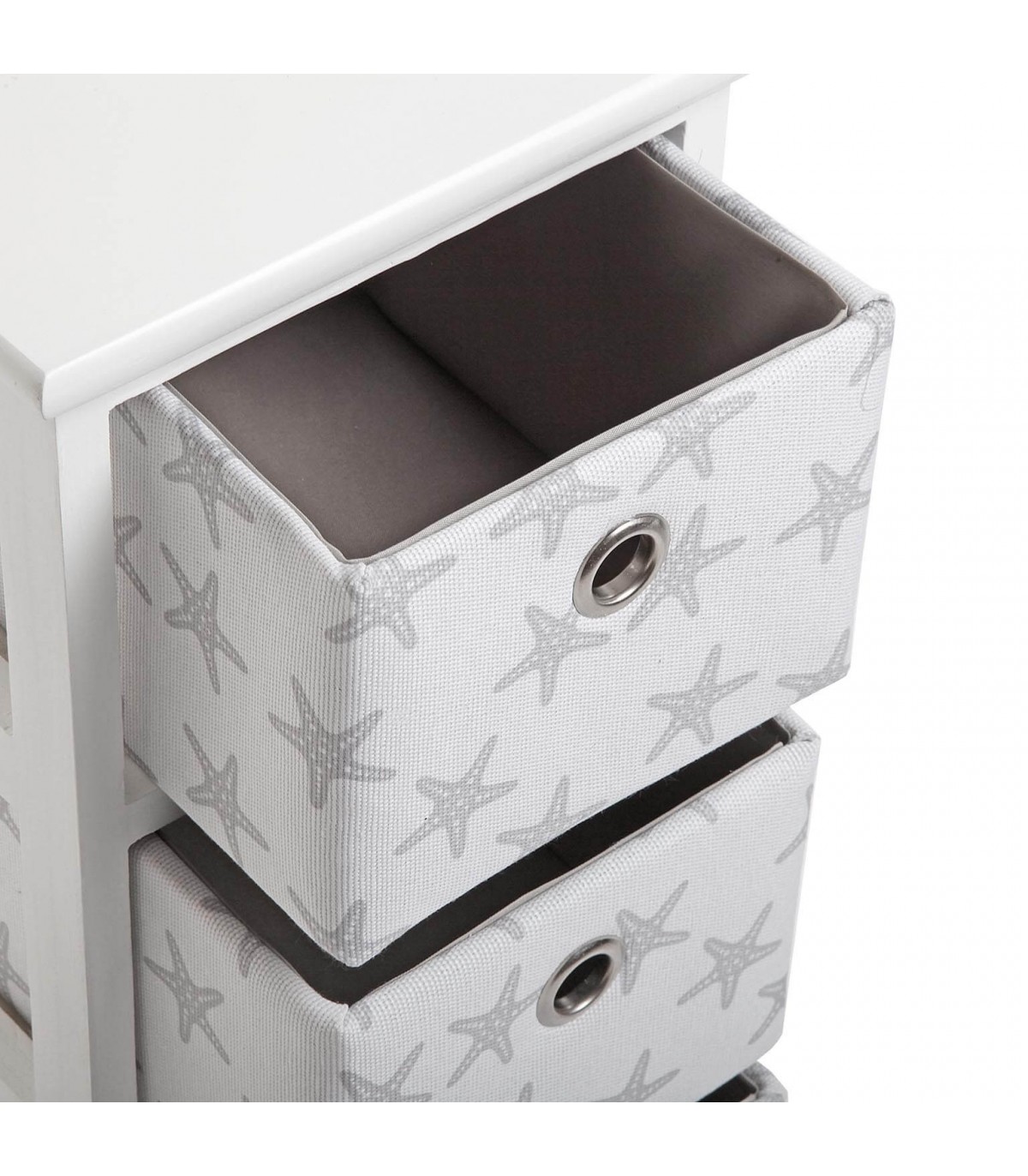 • Acabado, madera blanca, cajones en textil blanco estrellas grises, interior gris.