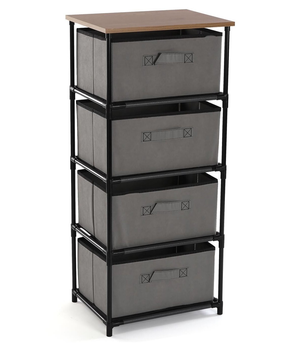 Cajonera auxiliar ideal para el baño, 4 cestas, realizada en acero negro, melamina imitación roble y textil en color gris, de estilo industrial, de buena capacidad y buen resultado.