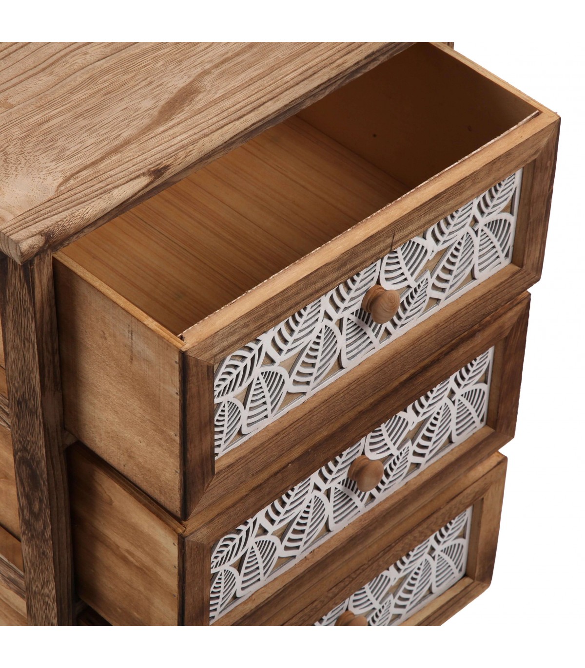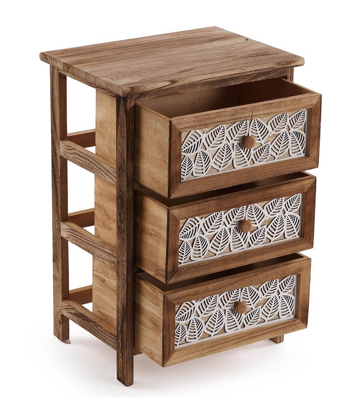 Sumérgete en el encanto colonial con esta cajonera auxiliar de líneas limpias y diseño orgánico. Fabricada en madera de paulonia con acabado color nogal, destaca por sus tres cajones con frentes decorados en blanco mediante calados de hojas en relieve, que aportan luz y carácter artesanal a la pieza. Compacta y funcional, es ideal como mueble de apoyo en el baño, el dormitorio o pasillos, manteniendo el orden con estilo. Su estructura ligera permite moverla con facilidad y adaptarla a distintos espacios.