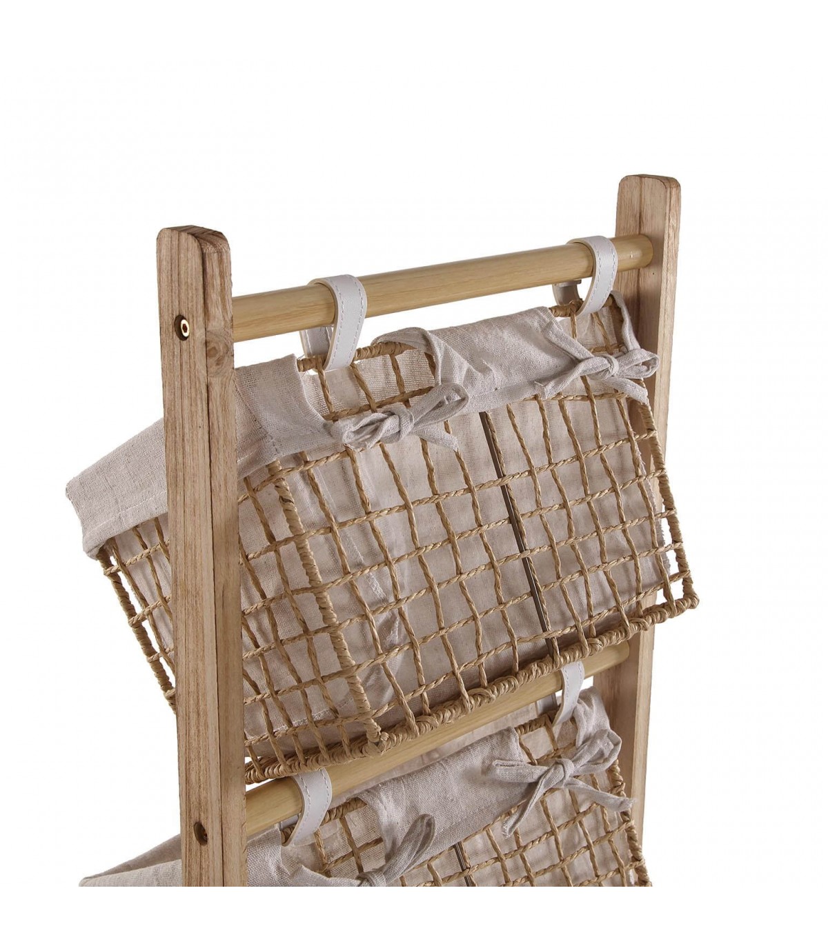 • Mueble organizativo realizado en madera y fibras acabado natural, tela beige, ideal para el cuarto de baño, existe en dos formatos con 3 o 4 cestas.