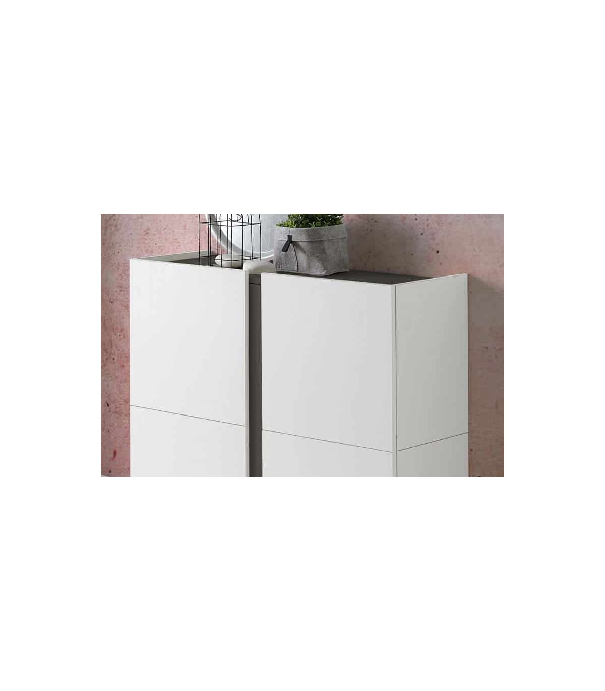 Zapatero sencillo y práctico fabricado en melamina color blanco y grafito. Dispone de 2 puertas que sobresalen ligeramente por encima de la tapa del zapatero para facilitar su apertura. El interior contiene 4 estantes que permiten almacenar hasta 18 pares de calzado. Su diseño y gran funcionalidad permiten usar el mueble también como mueble organizador para colocar ropa, juguetes, cajas, etc. El estilo minimalista y sobrio con finas líneas decorativas aportará elegancia en la entrada de la casa, el salón, el dormitorio o incluso el vestidor.