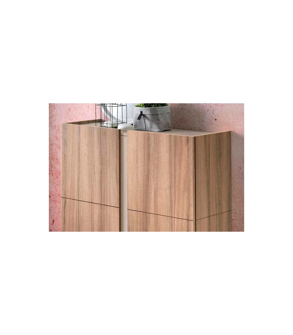 Zapatero de diseño sencillo y práctico fabricado en melamina imitación nogal y arena. Dispone de 2 puertas que sobresalen ligeramente por encima de la tapa del zapatero para facilitar su apertura. El interior contiene 4 estantes que permiten almacenar hasta 18 pares de calzado. Su diseño y gran funcionalidad permiten usar el mueble también como mueble organizador para colocar ropa, juguetes, cajas, etc. El estilo minimalista y sobrio con finas líneas decorativas aportará elegancia en la entrada de la casa, el salón, el dormitorio o incluso el vestidor.