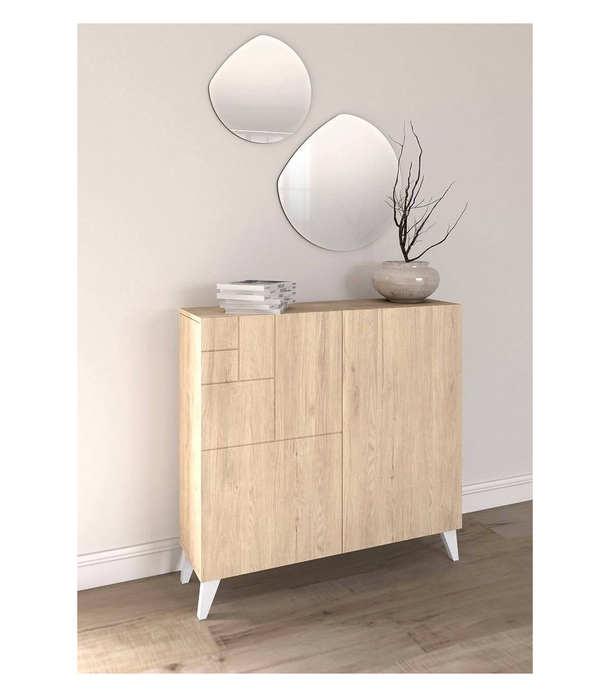 - Acabado, melamina imitación roble, patas lacadas en blanco.
