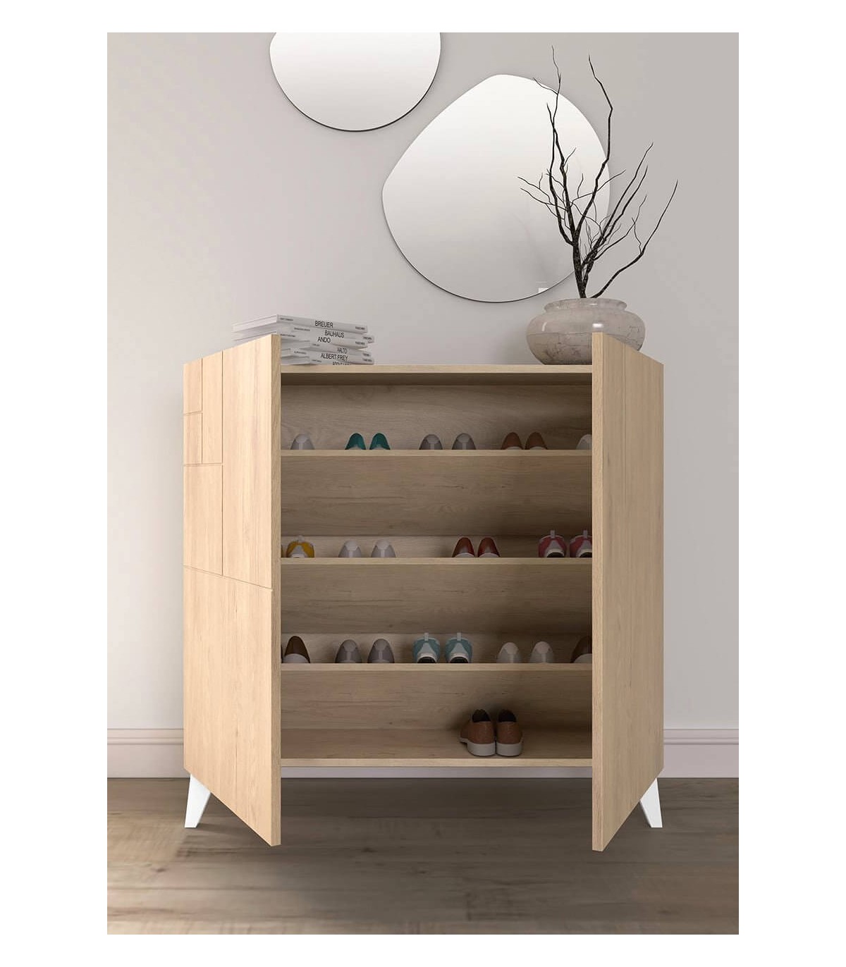Zapatero funcional y sencillo fabricado en melamina con 2 puertas y con las patas en madera de haya lacadas en blanco. El interior contiene 3 estantes que se pueden posicionar de forma horizontal o inclinada dando capacidad para almacenar hasta 16 pares de calzado. Su diseño práctico y su distribución permiten usar el mueble también como mueble organizador para guardar ropa, cajas, material de oficina, etc. El estilo sobrio con el detalle de las líneas decorativas aportará elegancia en el recibidor, el dormitorio o el salón de la casa.