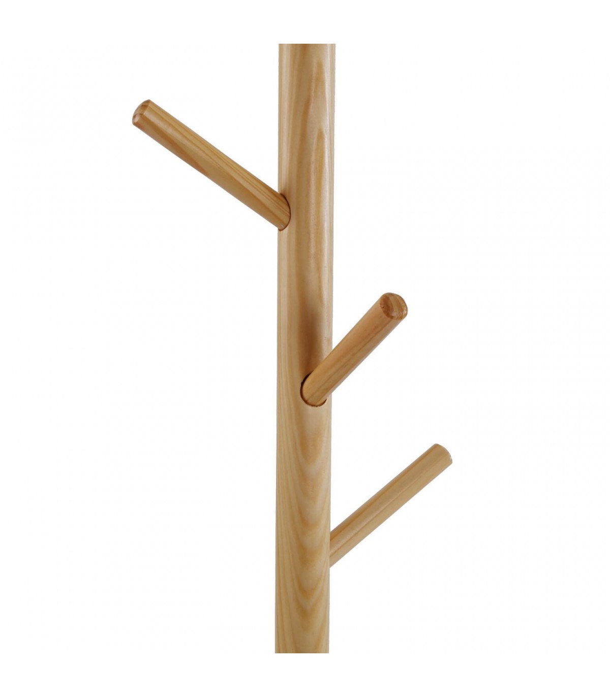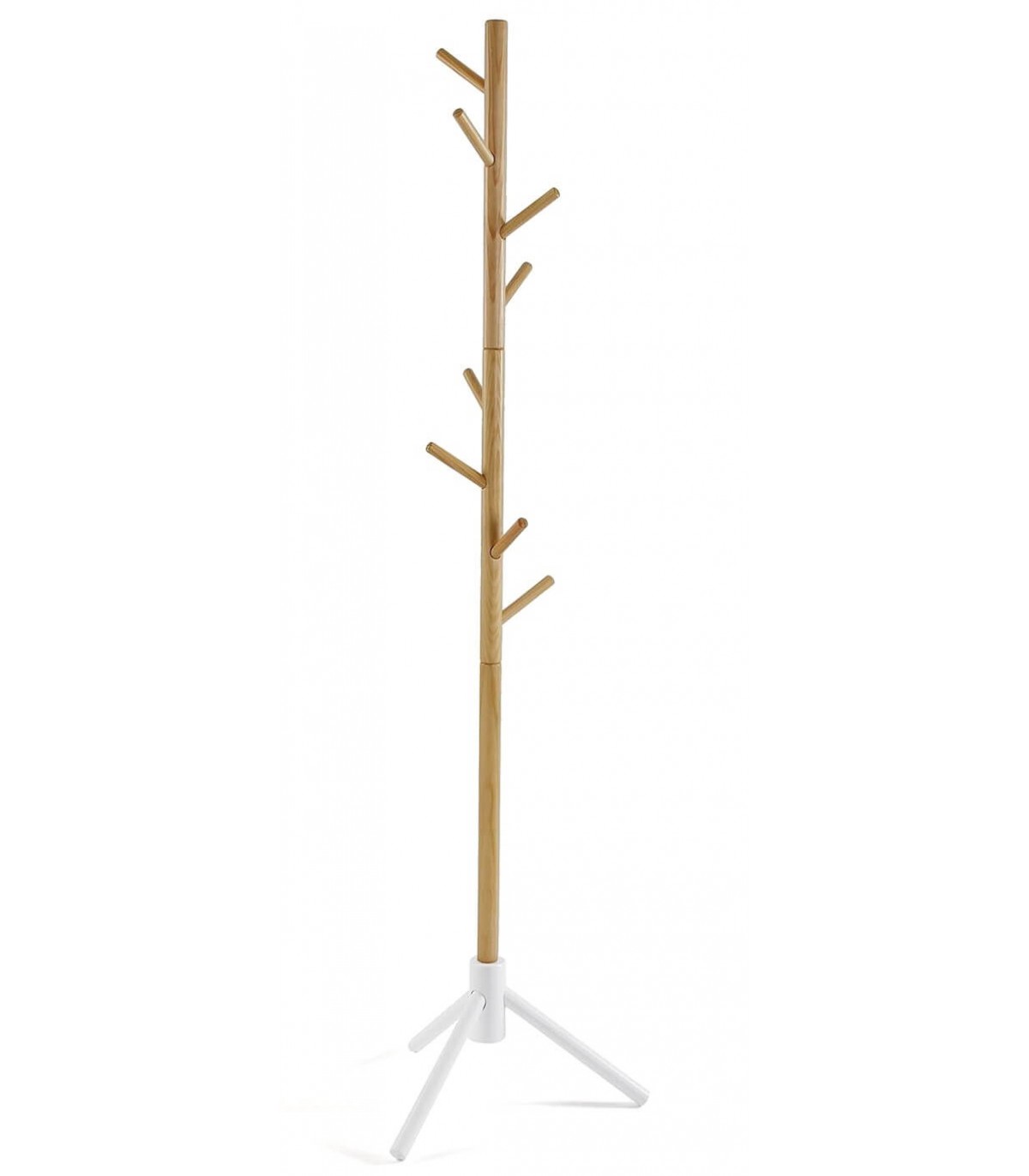 Perchero de pie con gran estabilidad y gran capacidad con ocho colgadores realizado en madera de pino acabado natural combinado con blanco, perfecto para una entrada, dormitorio, oficina o negocio.