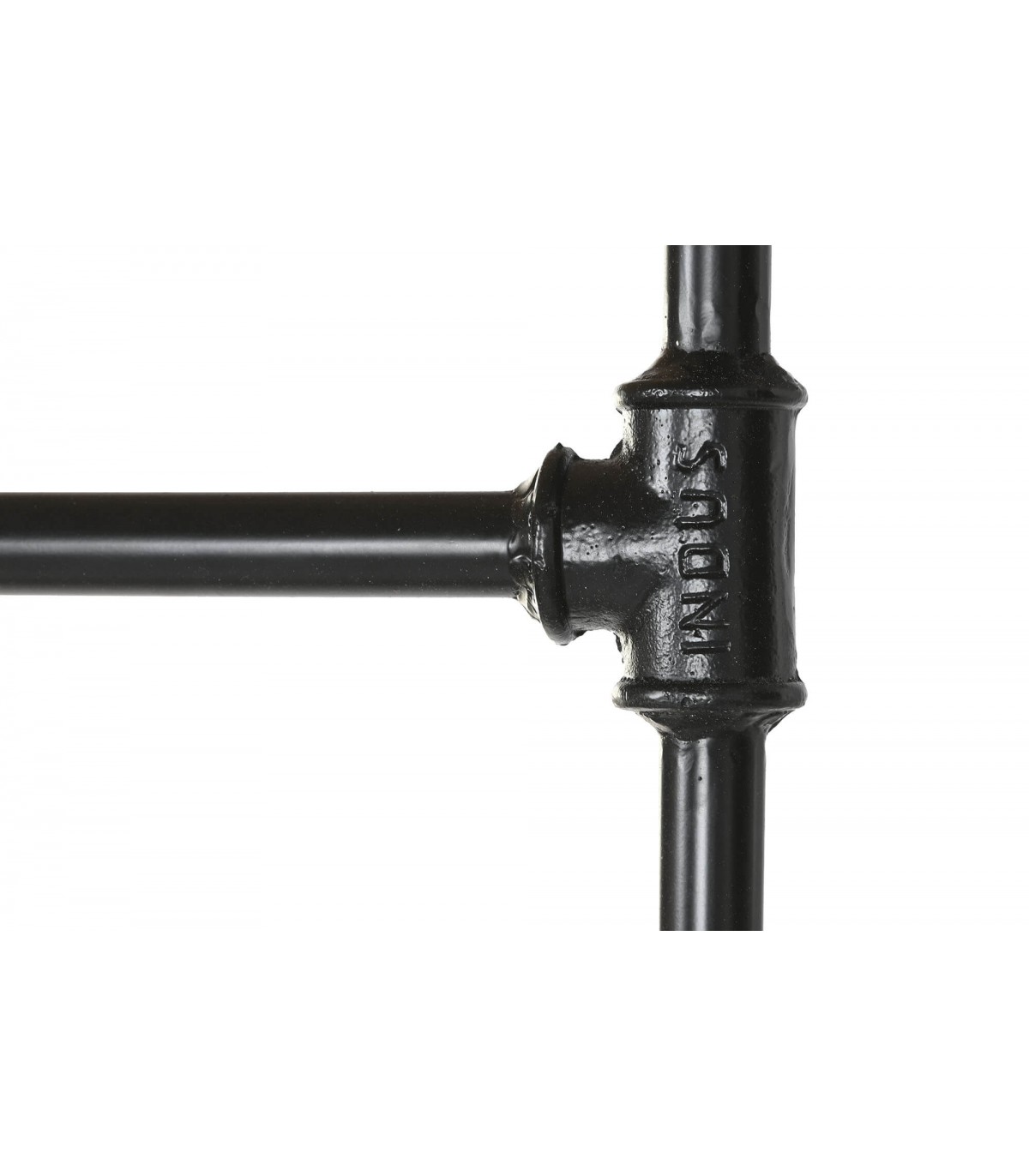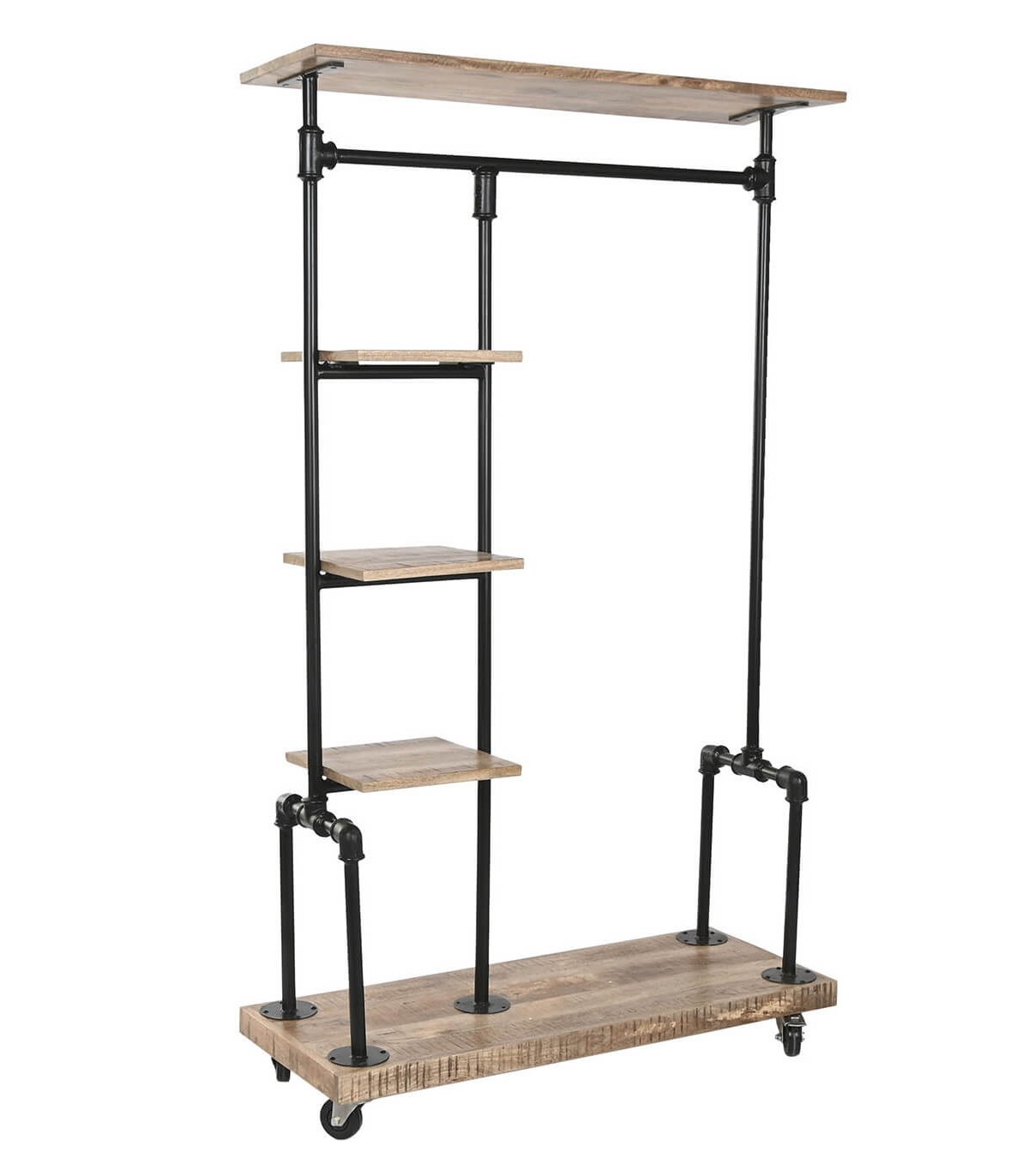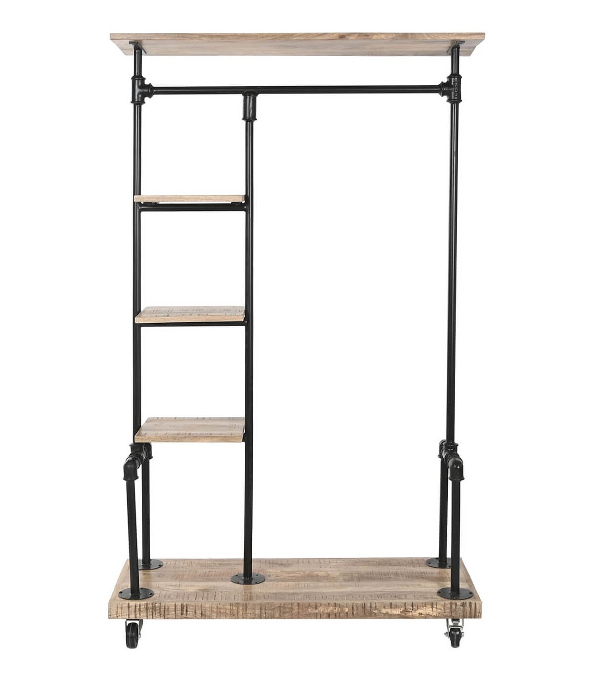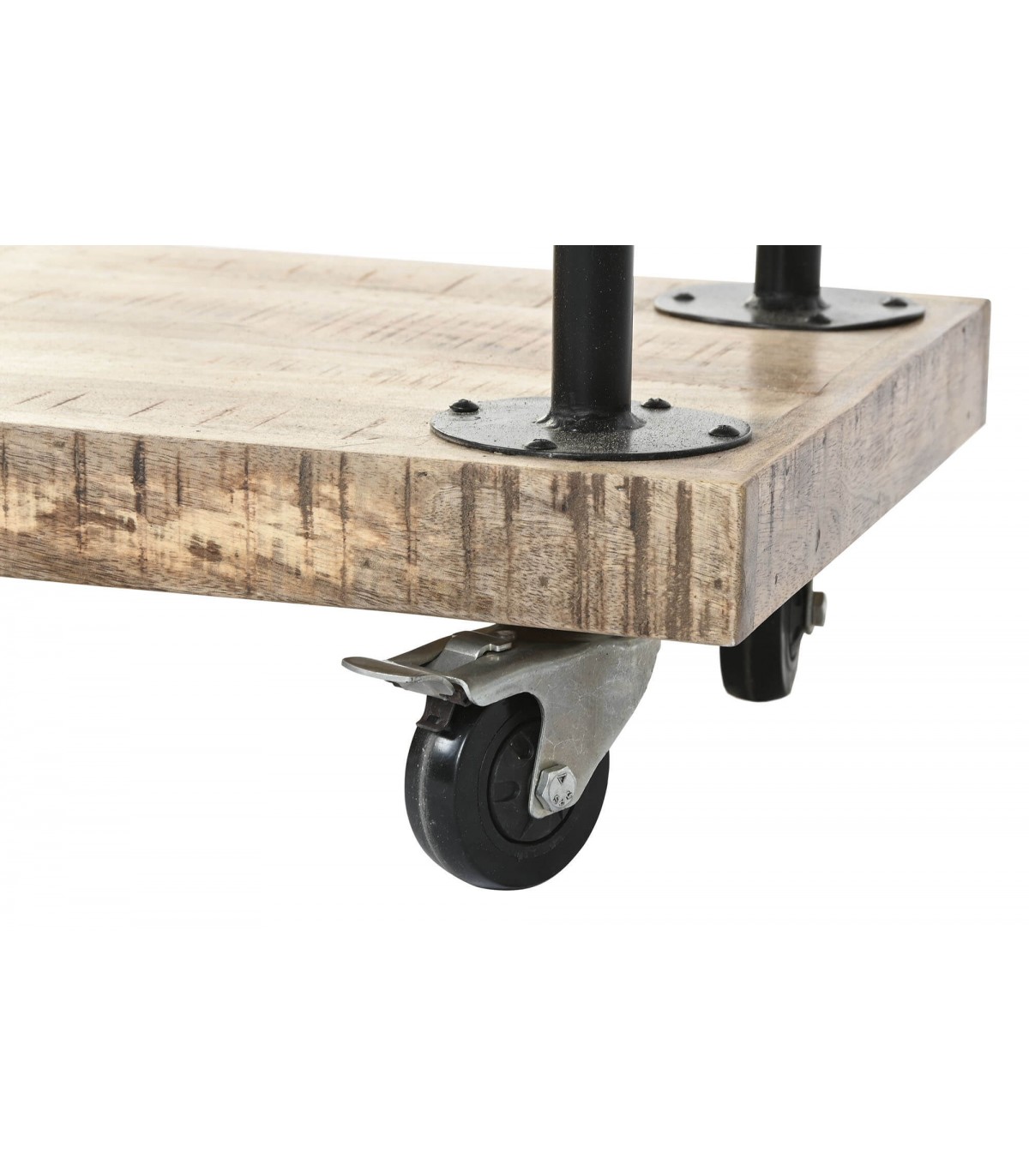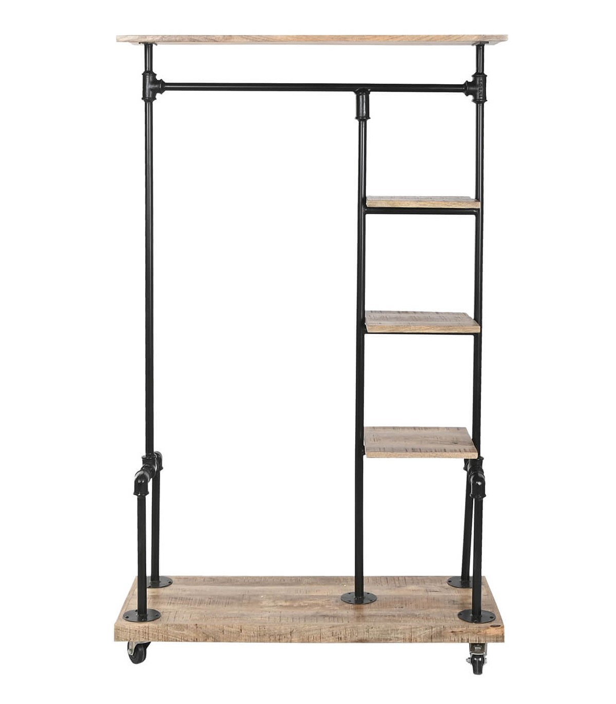 Sumérgete en el encanto del estilo industrial con este práctico y decorativo mueble perchero. Fabricado en madera maciza de mango con estructura metálica negra, combina robustez con un diseño atractivo. Incluye una barra superior para colgar ropa, tres estantes laterales para calzado o accesorios y una sólida base con ruedas, dos de ellas con freno para mayor estabilidad.