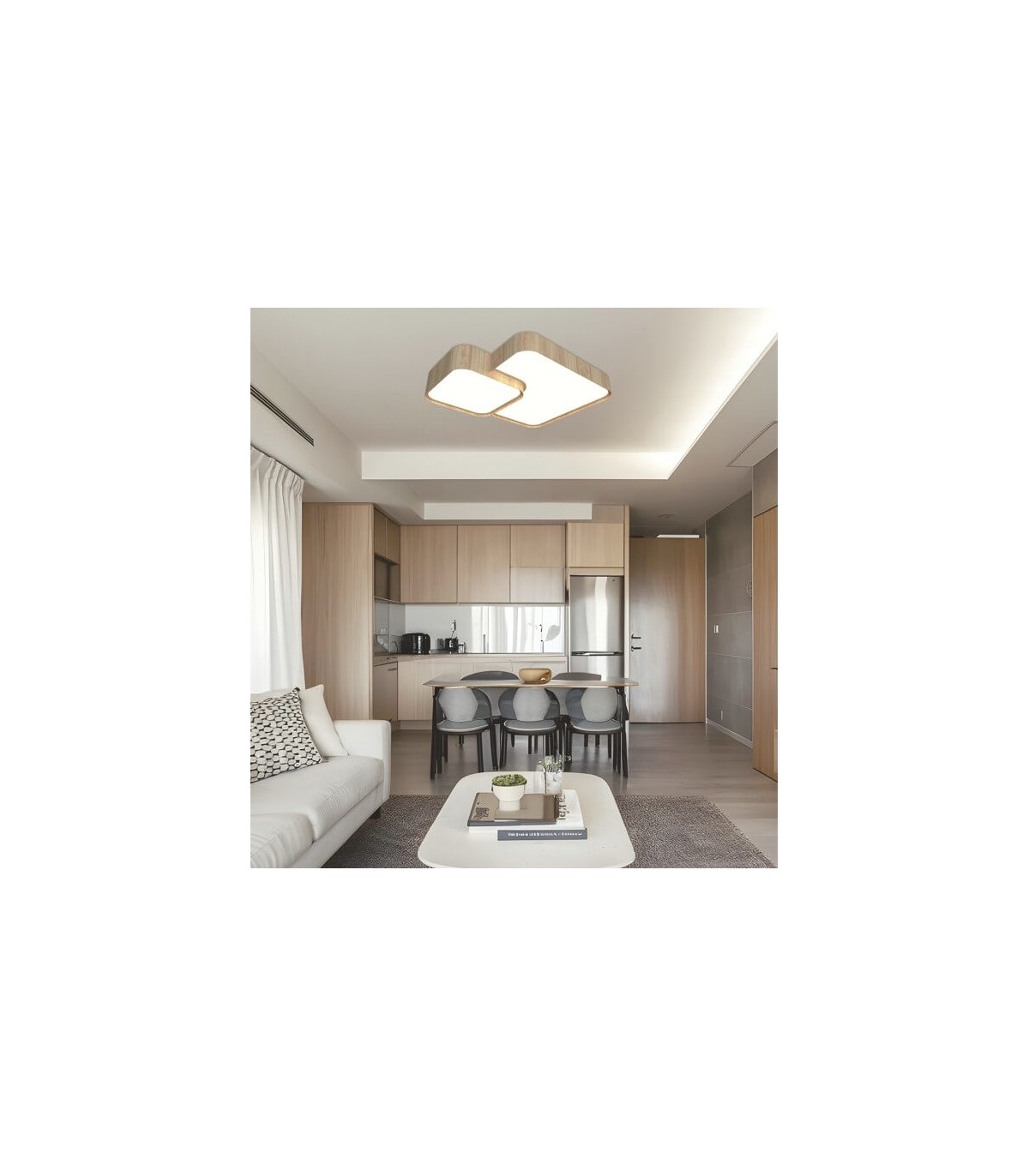 Plafón original en metal imitación madera natural y acrílico blanco, con led integrado y 3 temperaturas de color controladas por mando, de diseño contemporáneo, un plafón grande de superficie, un acierto seguro.