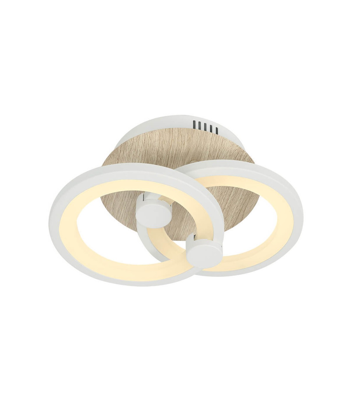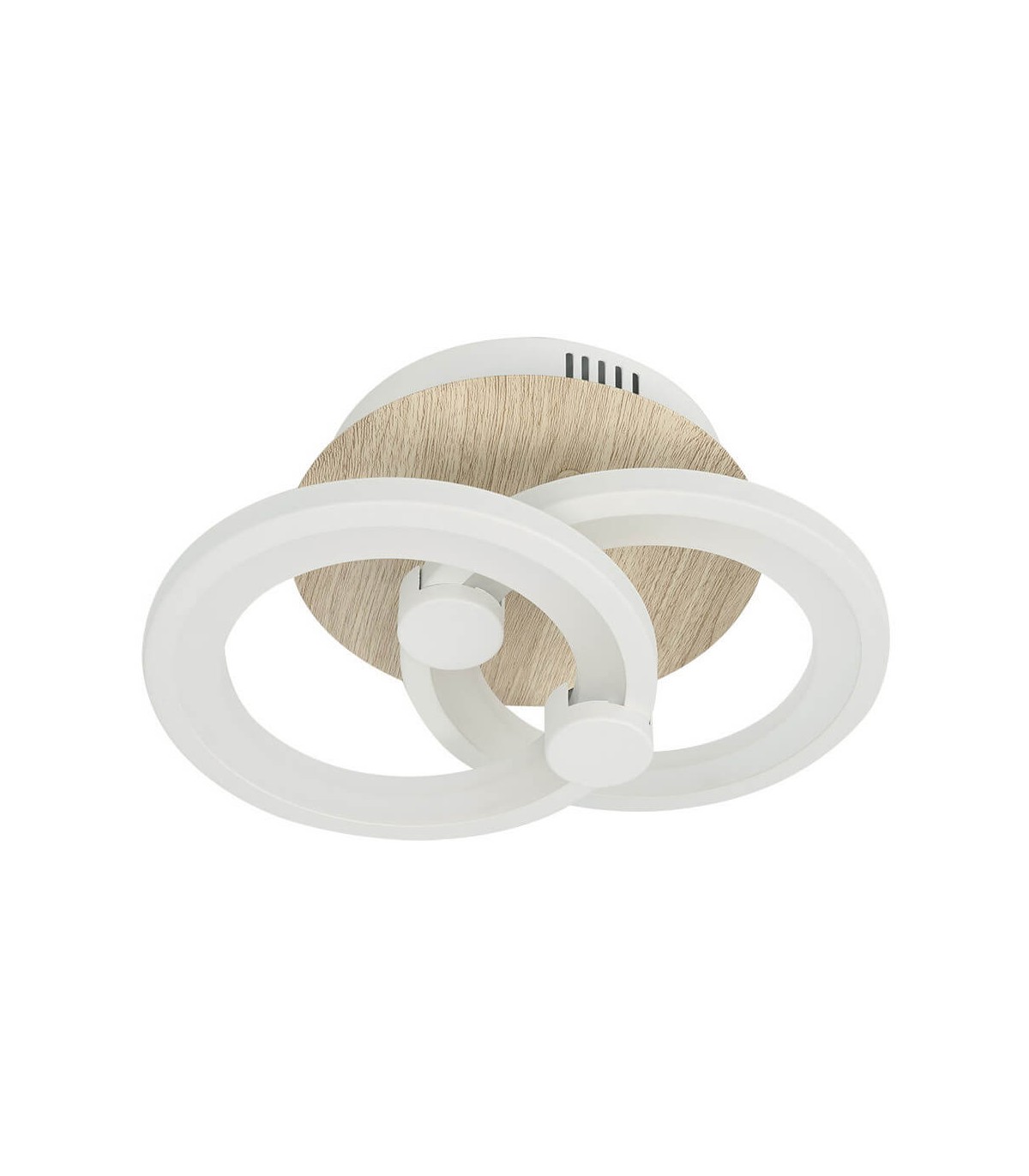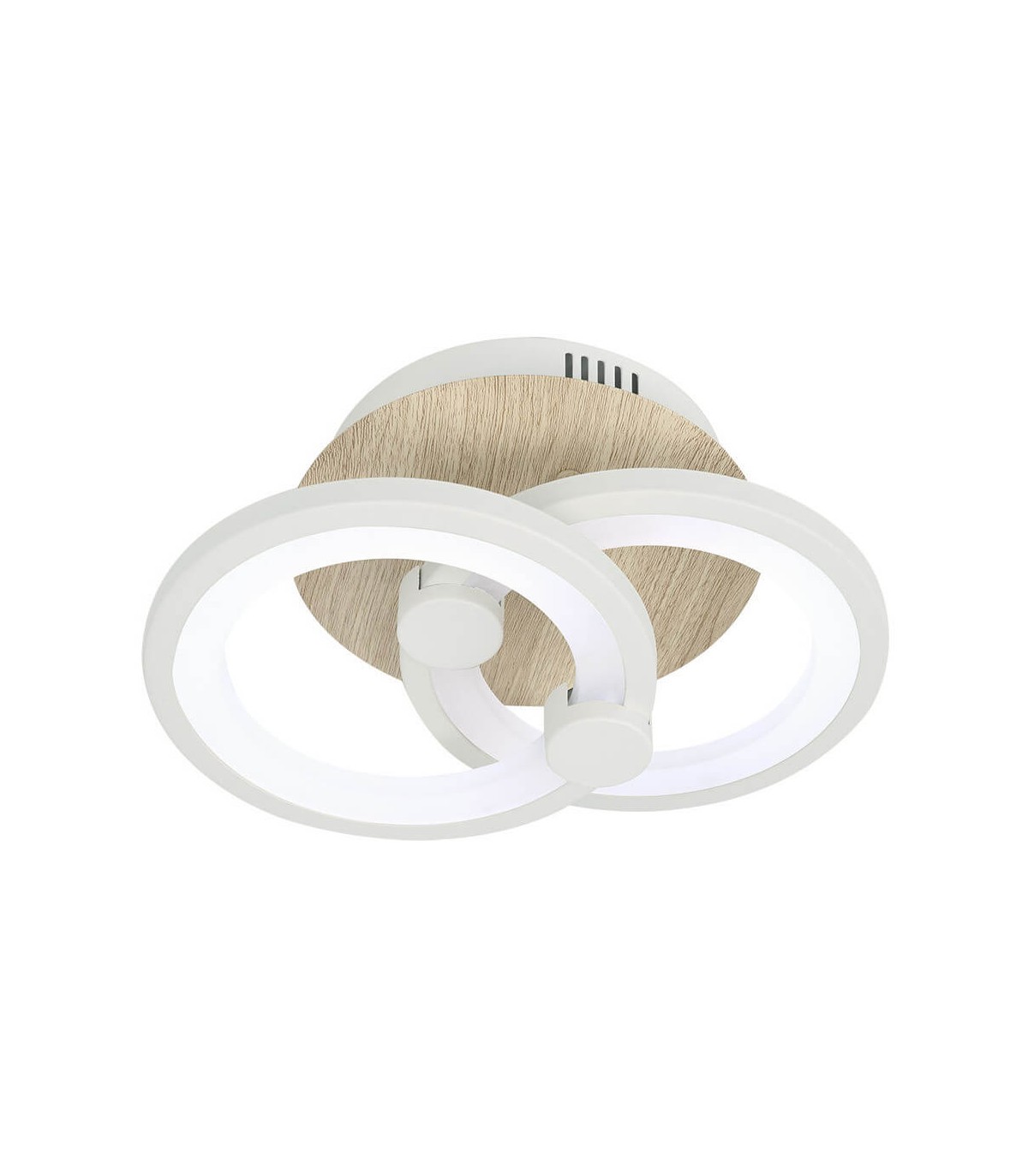 Plafón que se compone de dos círculos superpuestos a distintas alturas en color blanco e imitación madera, resultando una muy moderna composición.