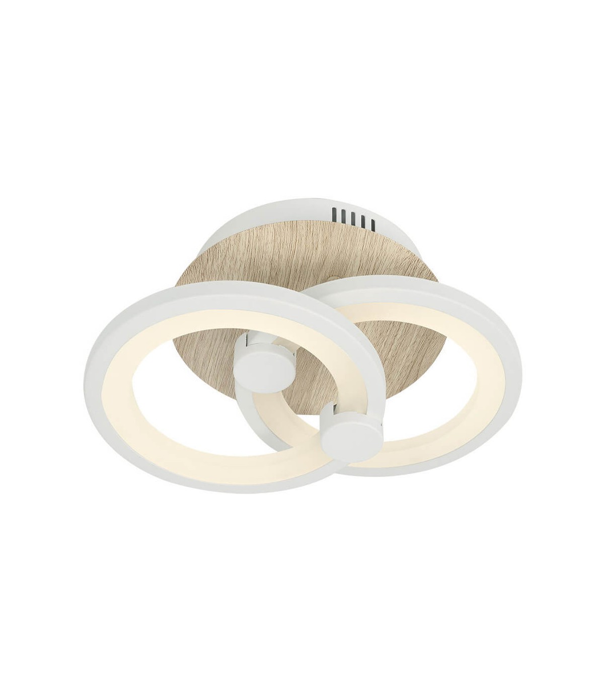 Acabado, blanco e imitación madera natural. Posee led integrado, 23 W de potencia, 4650lúmenes y con tres temperaturas regulables de luz mediante mando a distancia de 3000º, 4000 o 6500º.