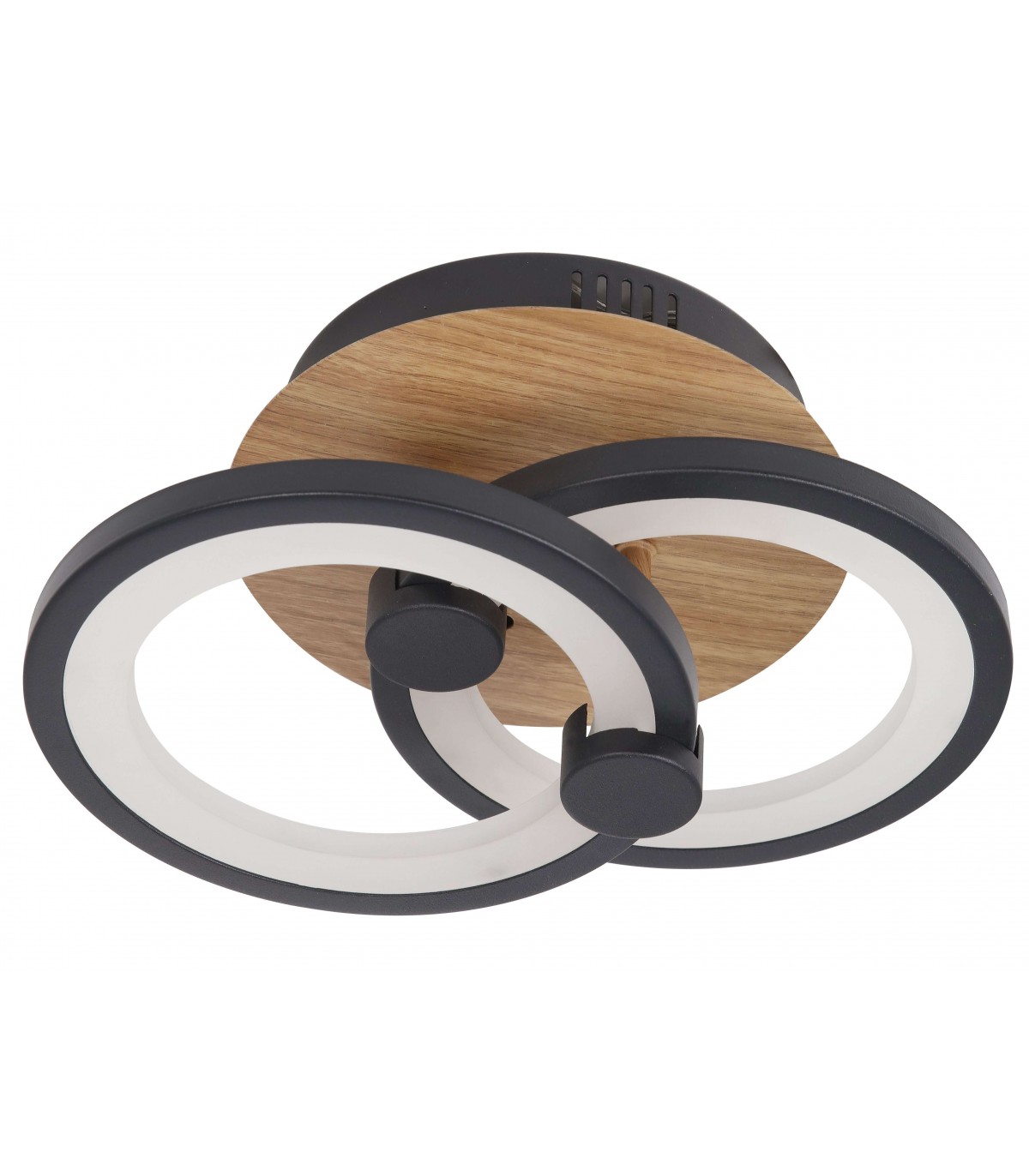 Acabado, negro e imitación madera natural. Posee led integrado, 23 W de potencia, 4650lúmenes y con tres temperaturas regulables de luz mediante mando a distancia de 3000º, 4000 o 6500º.